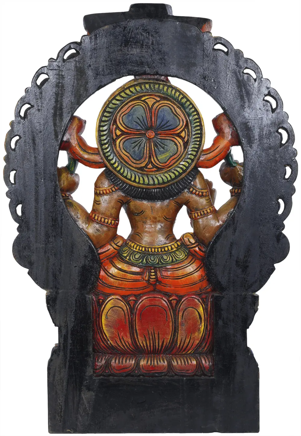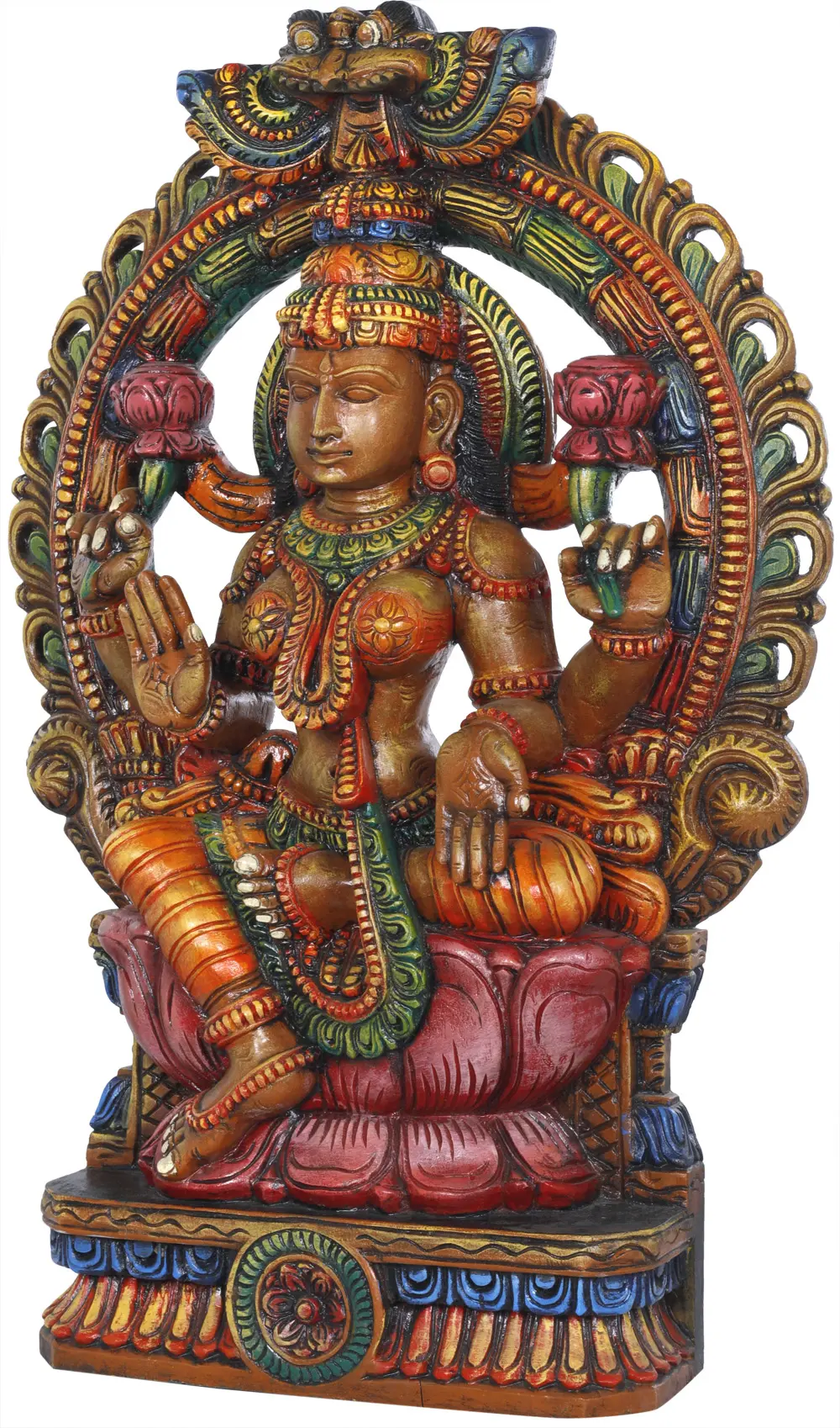 She is one of the most beauteous of the Hindu devis. Fair and lissome, She is carved out from a piece of indigenous wood, after the sculptural style of ancient South Indian temples. Seated in lalitasana, Her roopa adorned with gold and jewels, the chaturbhujadhari (four-armed) Devi raises Her anterior hands in blessing and the gesture of fearlessness; in Her posterior hands She holds up freshly blooming lotuses. Zoom in on that slender waist, those long limbs, and the sharp features of Her face in order to admire the skill and perfection with which She has been sculpted.