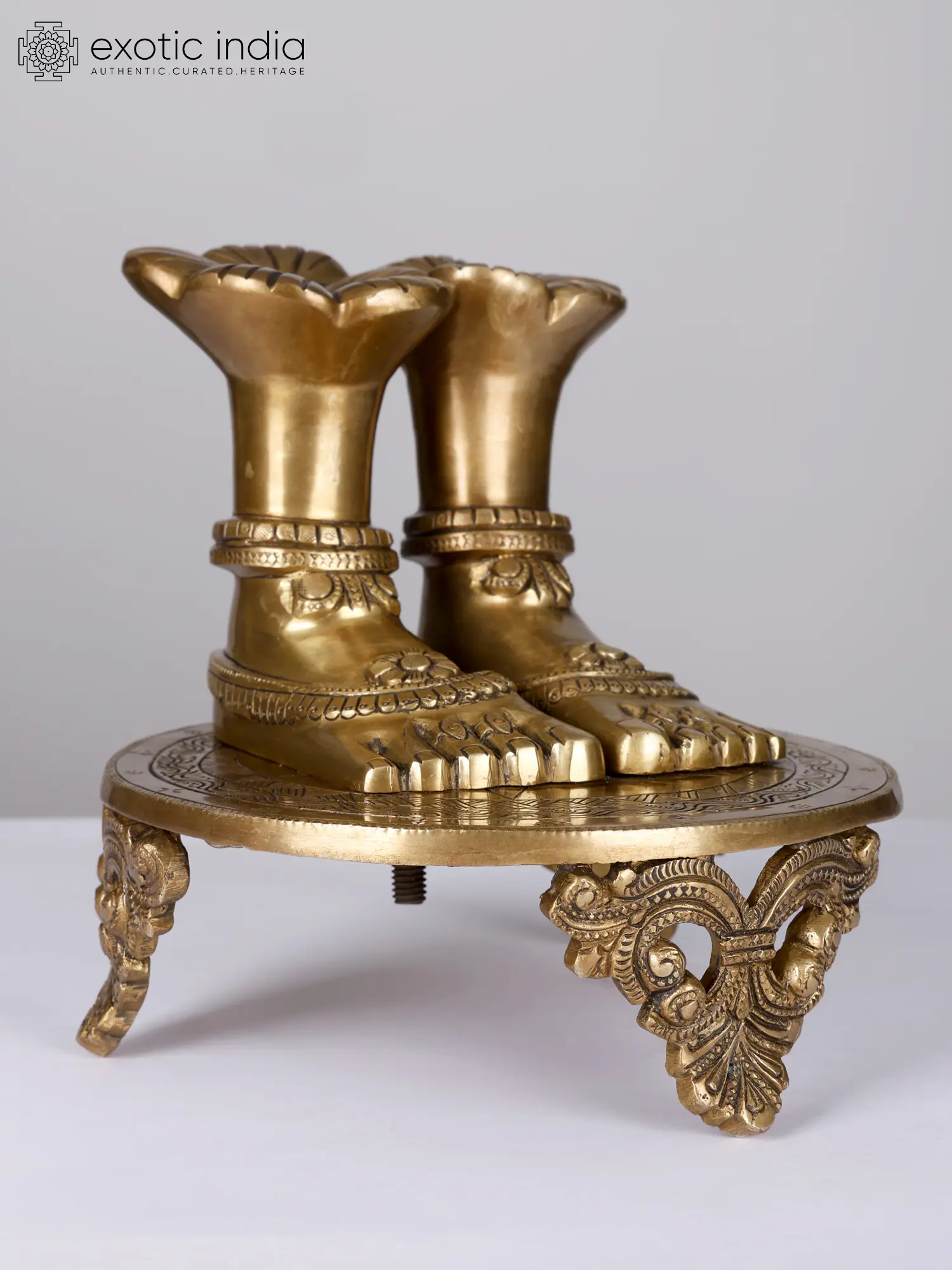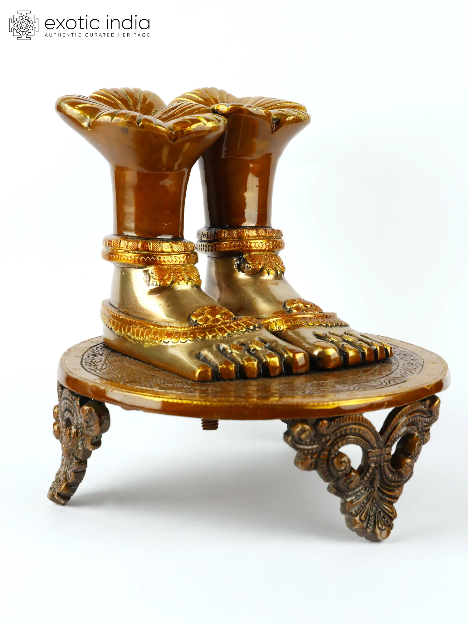 This brass sculpture represents the idea of lotus feet beautifully, with the Charan-Kamala or Padma-Pada of Lakshmi placed on an ornate Peetha (pedestal). Decorated with anklets, toe rings, and sacred designs- all signs of auspiciousness and femininity, the feet of Lakshmi bloom into two delicate flowers.