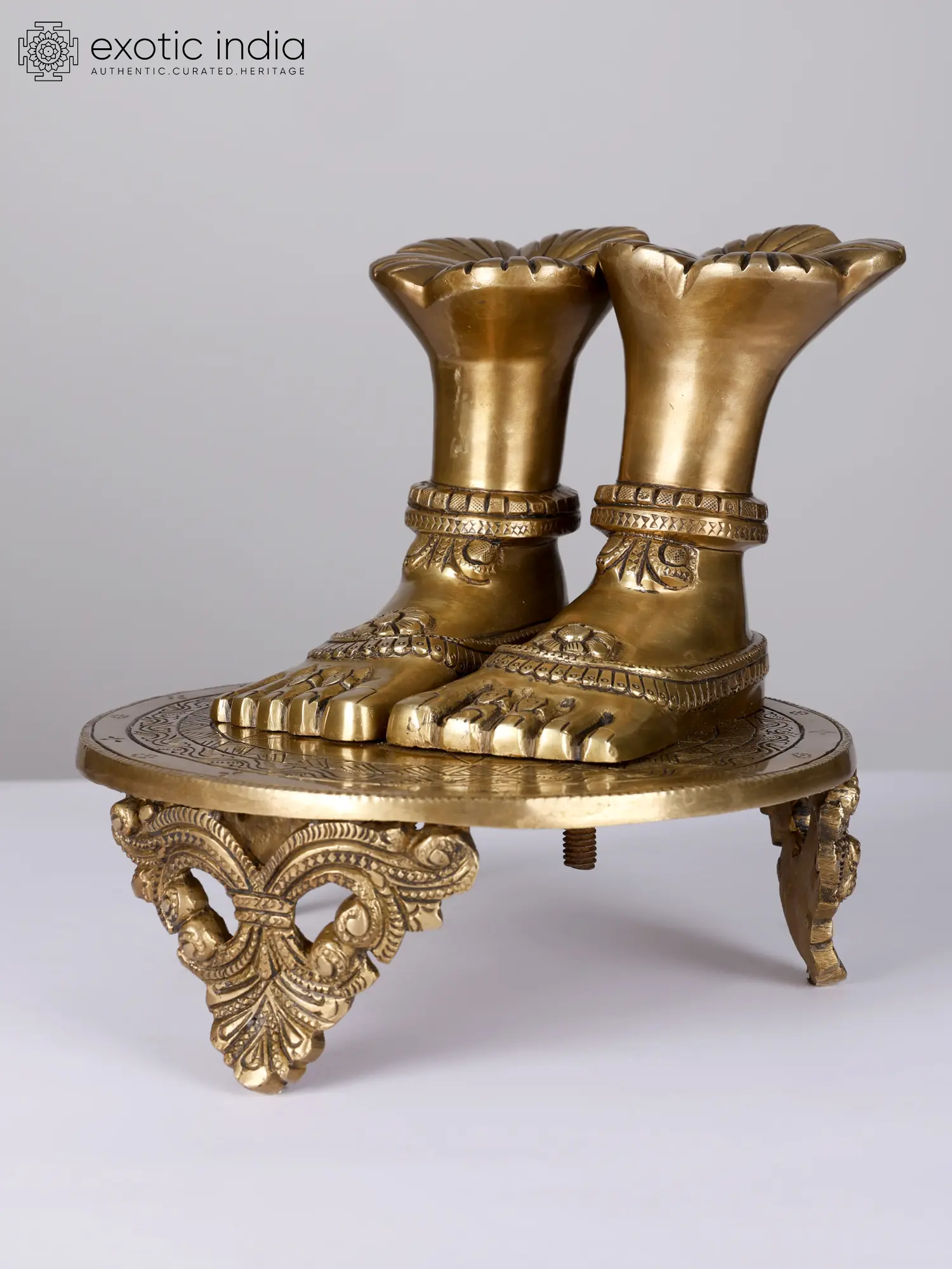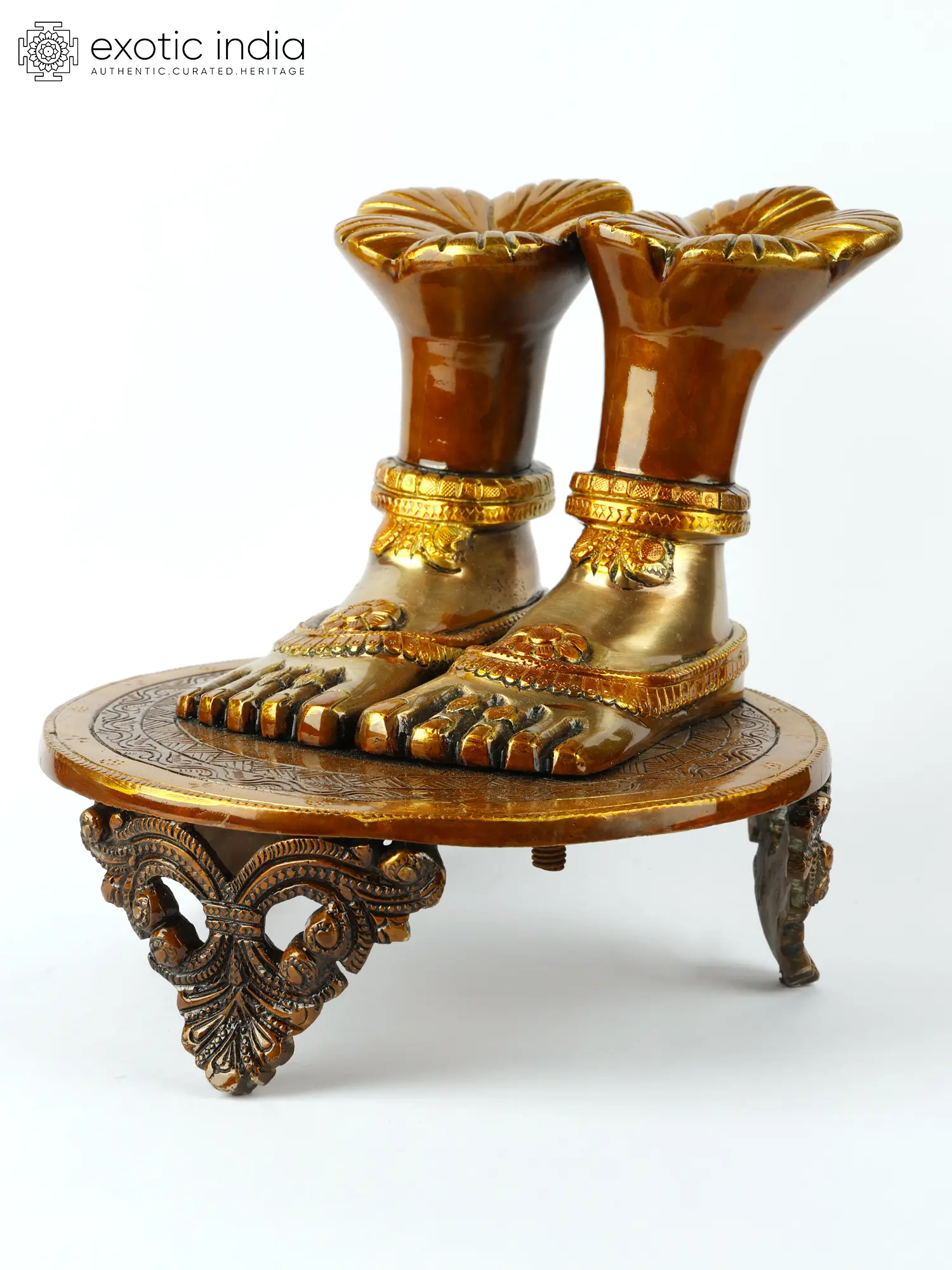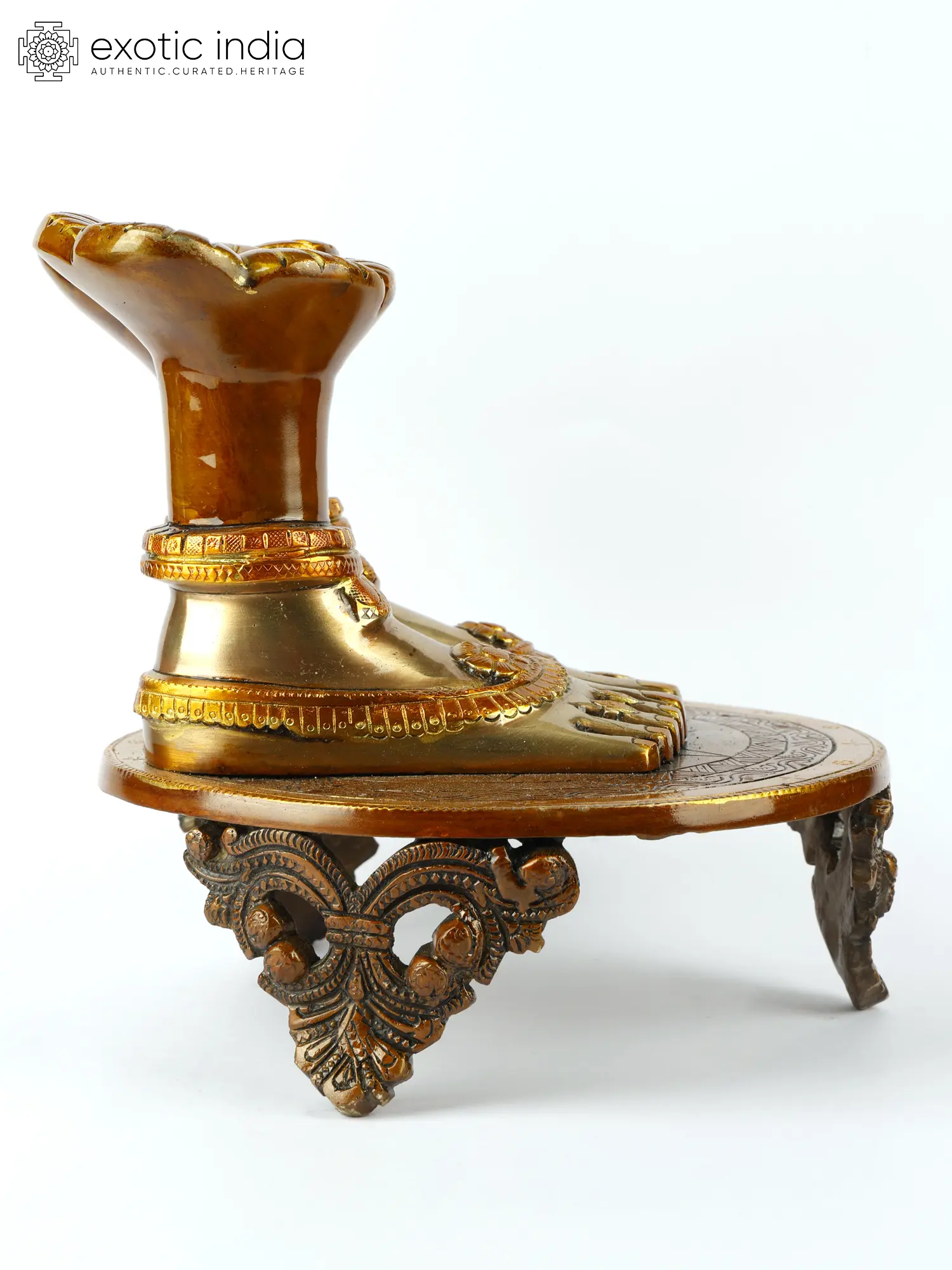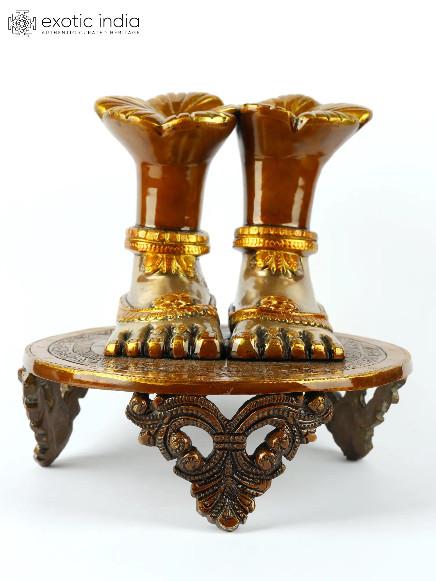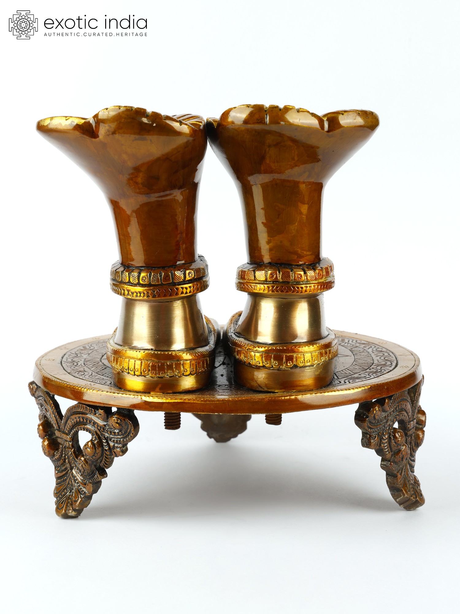This brass sculpture represents the idea of lotus feet beautifully, with the Charan-Kamala or Padma-Pada of Lakshmi placed on an ornate Peetha (pedestal). Decorated with anklets, toe rings, and sacred designs- all signs of auspiciousness and femininity, the feet of Lakshmi bloom into two delicate flowers.