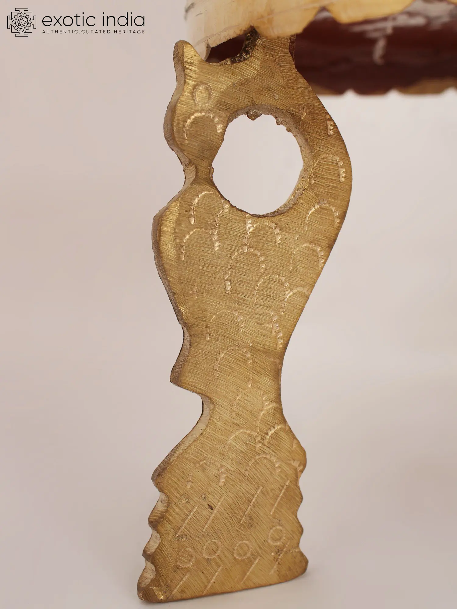 A three-legged chowki made of pure brass. Designed to support a seated or a standing figure of your favourite devi-devata, like a plinth in traditional iconography. Alternatively, a chowki such as this may be used as a pooja stool for the lady of the house or a pujari at times of ritual worship.