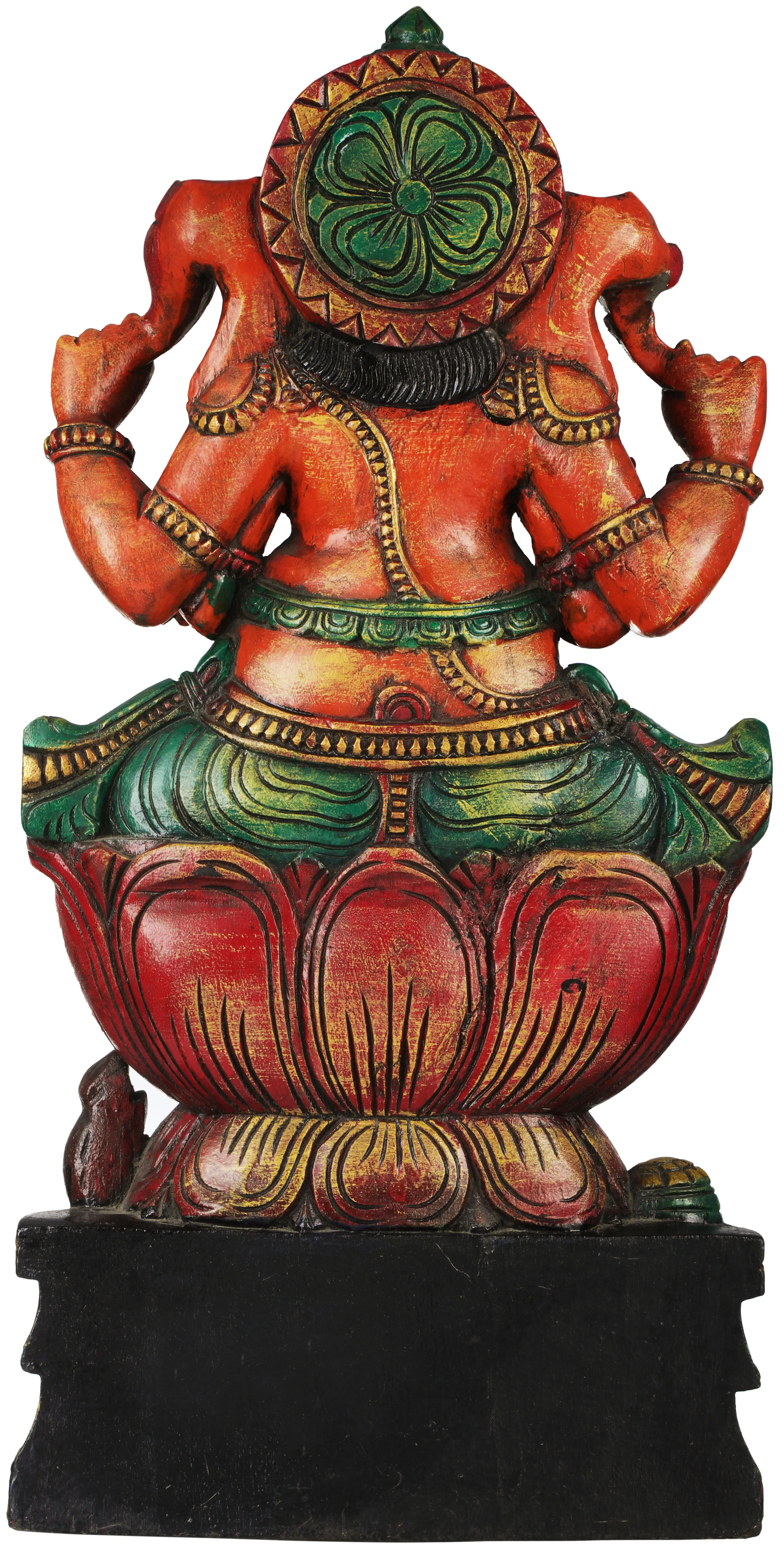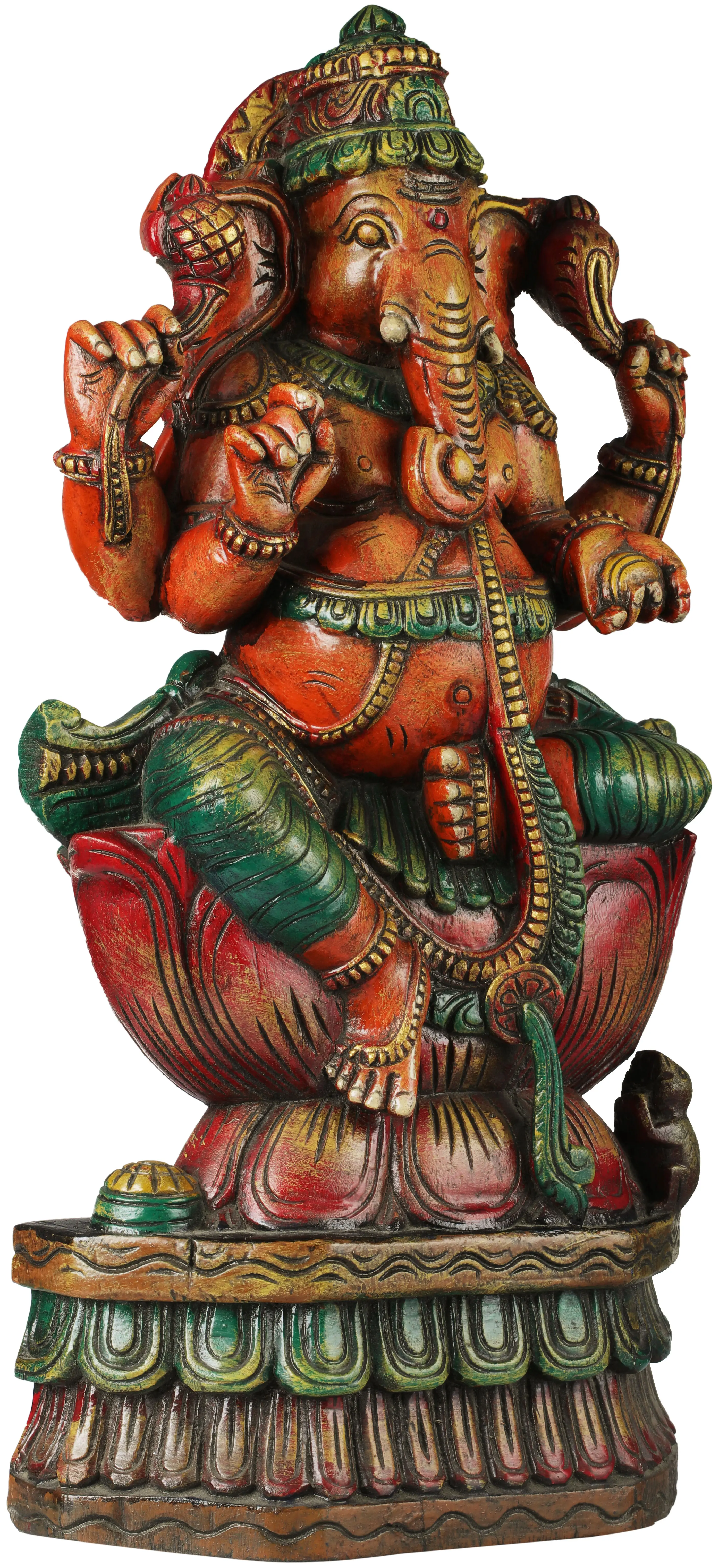 Invite auspiciousness and spiritual harmony into your home with this exquisitely crafted wooden sculpture of Lord Ganesha. Seated gracefully upon a vibrant lotus, this magnificent piece embodies the divine energy of the Remover of Obstacles and the patron of arts and sciences. Each detail of this carving speaks of ancient traditions and skilled craftsmanship, bringing a tangible sense of the sacred into your living space. The sculpture depicts Ganesha in his popular form, seated in a meditative posture, his large ears fanned out, and his trunk curled gently. His benevolent gaze seems to bestow blessings upon all who behold him. The rich, hand-painted colors – deep reds, verdant greens, and shimmering golds – add a captivating dimension, highlighting the intricate carvings and bringing the divine figure to life. The lotus upon which he rests symbolizes purity, spiritual awakening, and a blossoming of consciousness, further enhancing the spiritual significance of the piece.