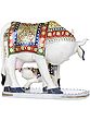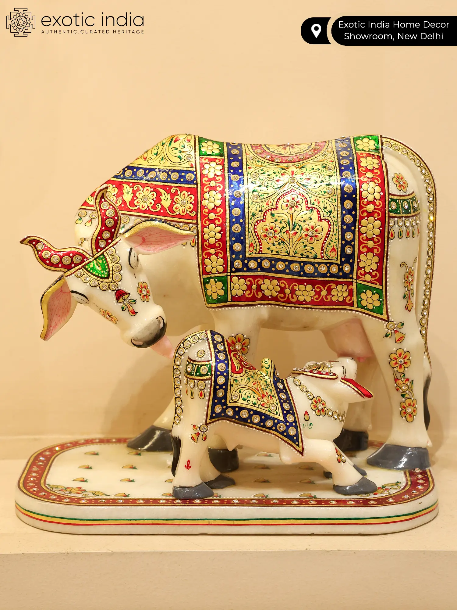 Both the cow and the calf wear clothes on their backs having unique bright borders in red and blue with the designs majorly inspired by meenakari styles. The horns, face and tail are styled with small stones and exceptional patterns. Both are depicted with beautiful flower motifs on the legs and near the tail; color of the ears compliments to that of the white color of marble and the structure of eyes is mesmerizing.