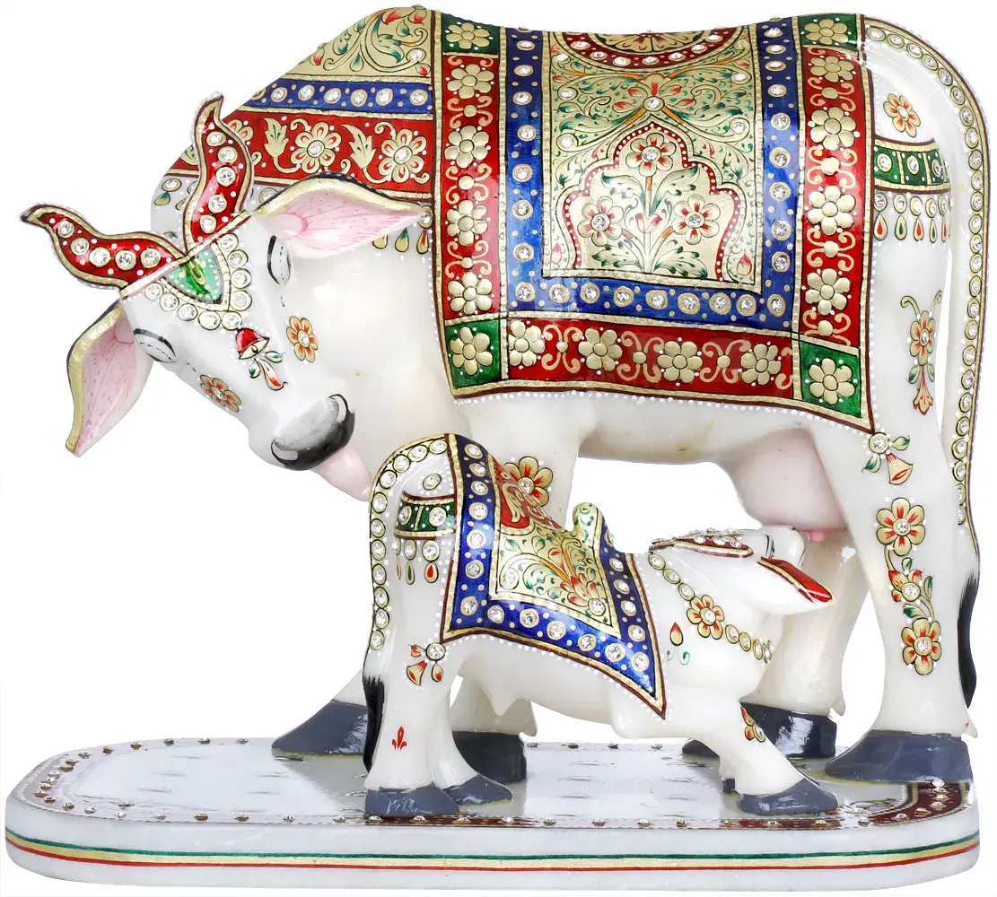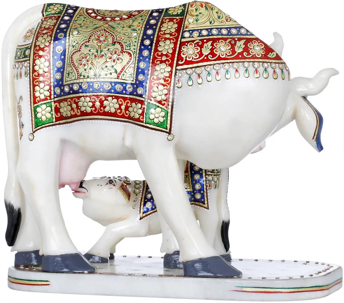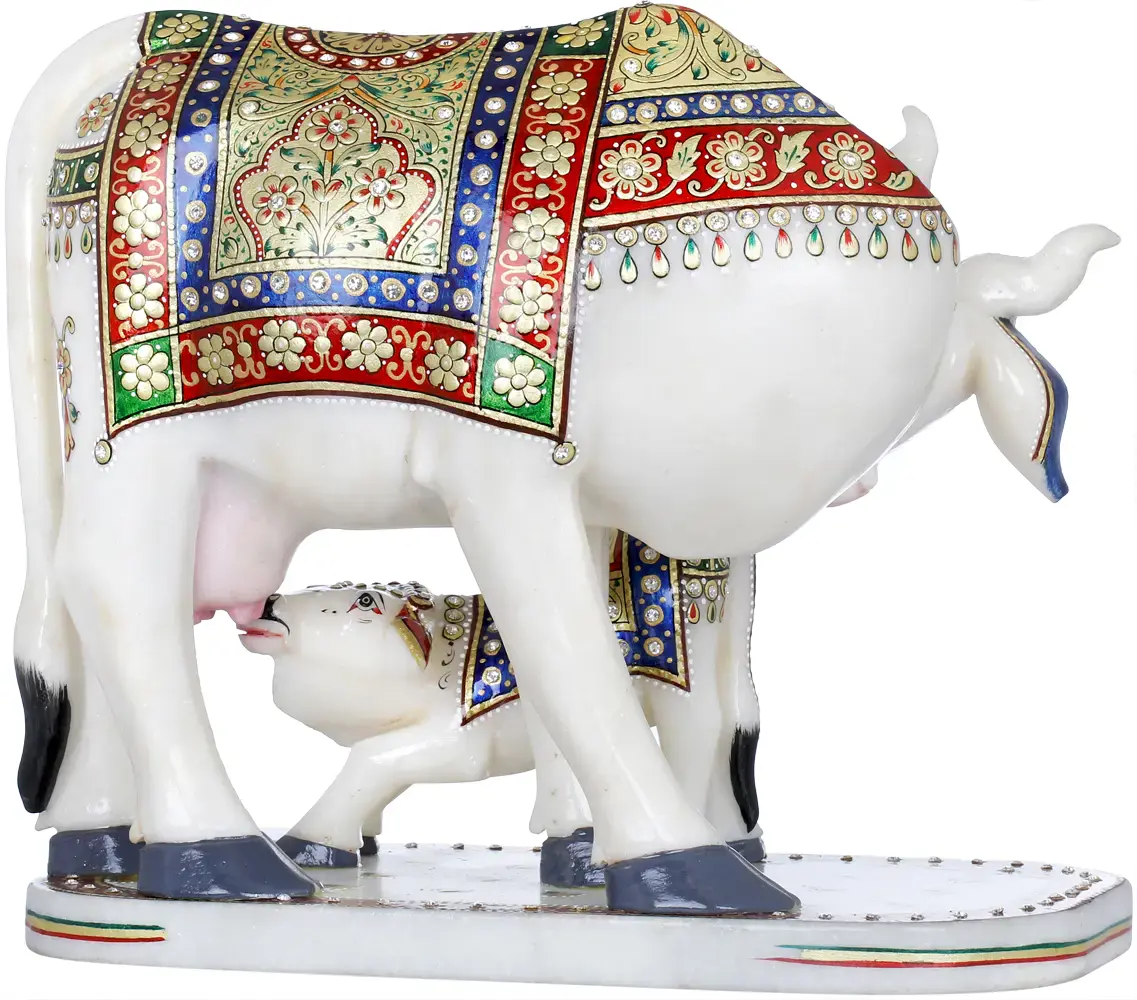 Mother cow Kamadhenu and her calf are one of the most sacred idols for prosperity and good luck. The supremely built marble statue stands on a thin oval pedestal and the mother cow licks her baby out of vatsalya (the love of a mother for her children) and the calf drinks her mother’s milk.