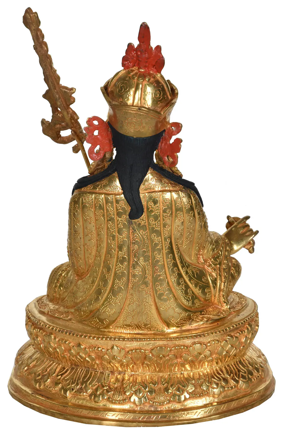 This remarkable statue is more than just a decorative piece; it is a potent symbol of spiritual aspiration and a conduit for devotion. The use of copper as the base material is traditional in Tibetan iconography, believed to hold and radiate spiritual energy. The lavish gilding with 24-karat gold enhances its sacredness and longevity. Whether placed in a meditation room, altar, or as a centerpiece in a spiritual collection, this statue of Guru Padmasambhava serves as a constant reminder of the path to enlightenment, the importance of compassion, and the enduring power of the Dharma. It is an heirloom of immense spiritual significance, crafted to inspire peace, wisdom, and well-being for generations to come.