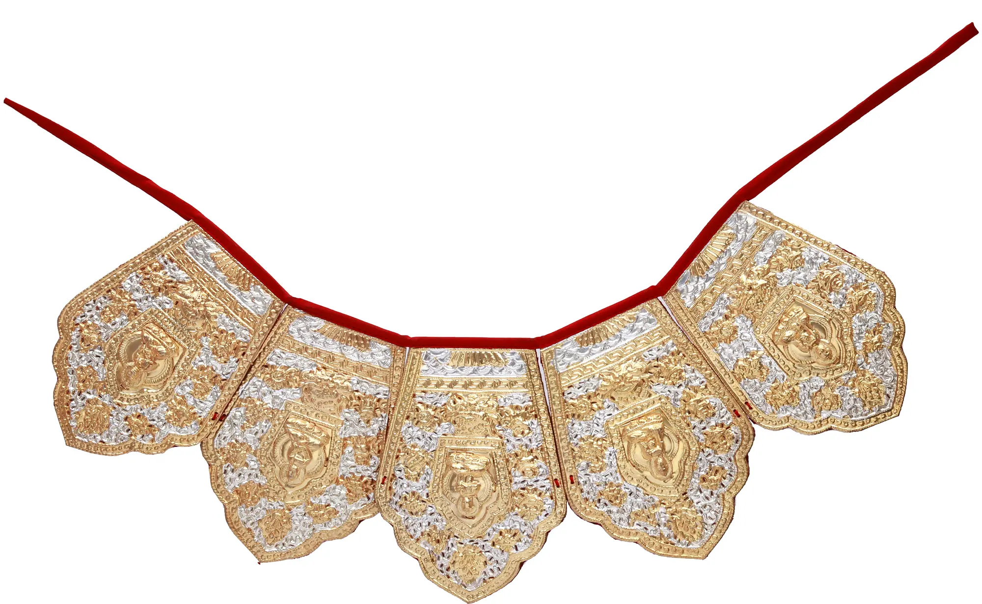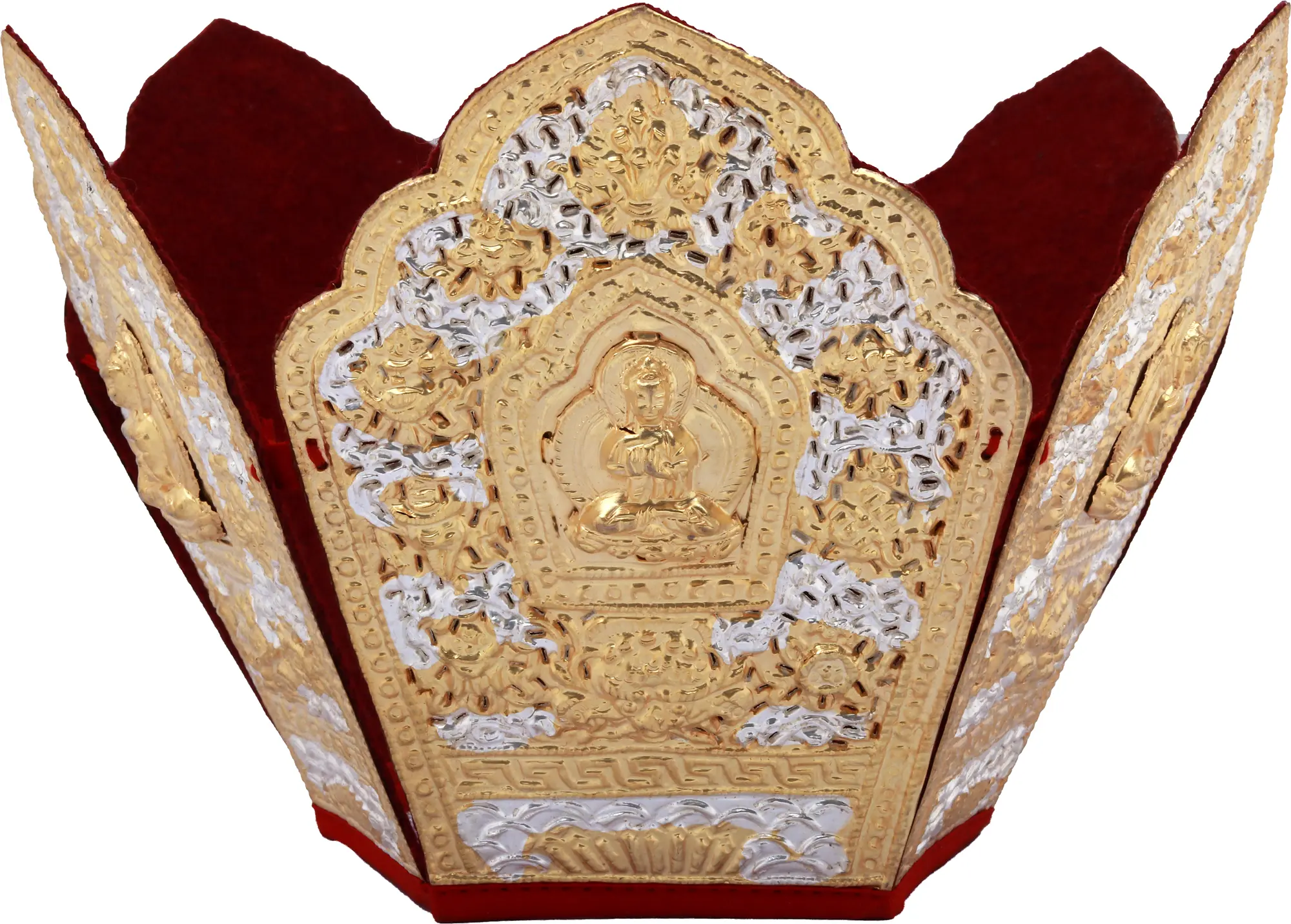 This exquisite ritual crown, a testament to the rich artistic heritage of Nepal, is more than just an adornment; it is a profound representation of Buddhist philosophy and spiritual aspirations. Crafted with meticulous attention to detail, it embodies the essence of the Five Dhyani Buddhas, celestial beings who represent the five wisdoms and are foundational to Mahayana and Vajrayana Buddhism. The crown itself is a masterpiece of intricate metalwork, gleaming with the auspicious combination of gold and silver tones. Each of the five segments is a miniature work of art, framed by a vibrant red cloth lining that adds to its regal and sacred aura. The larger central panel, flanked by four slightly smaller panels, is designed to be worn as a headpiece during religious ceremonies, meditations, or as a significant decorative item in a sacred space.
