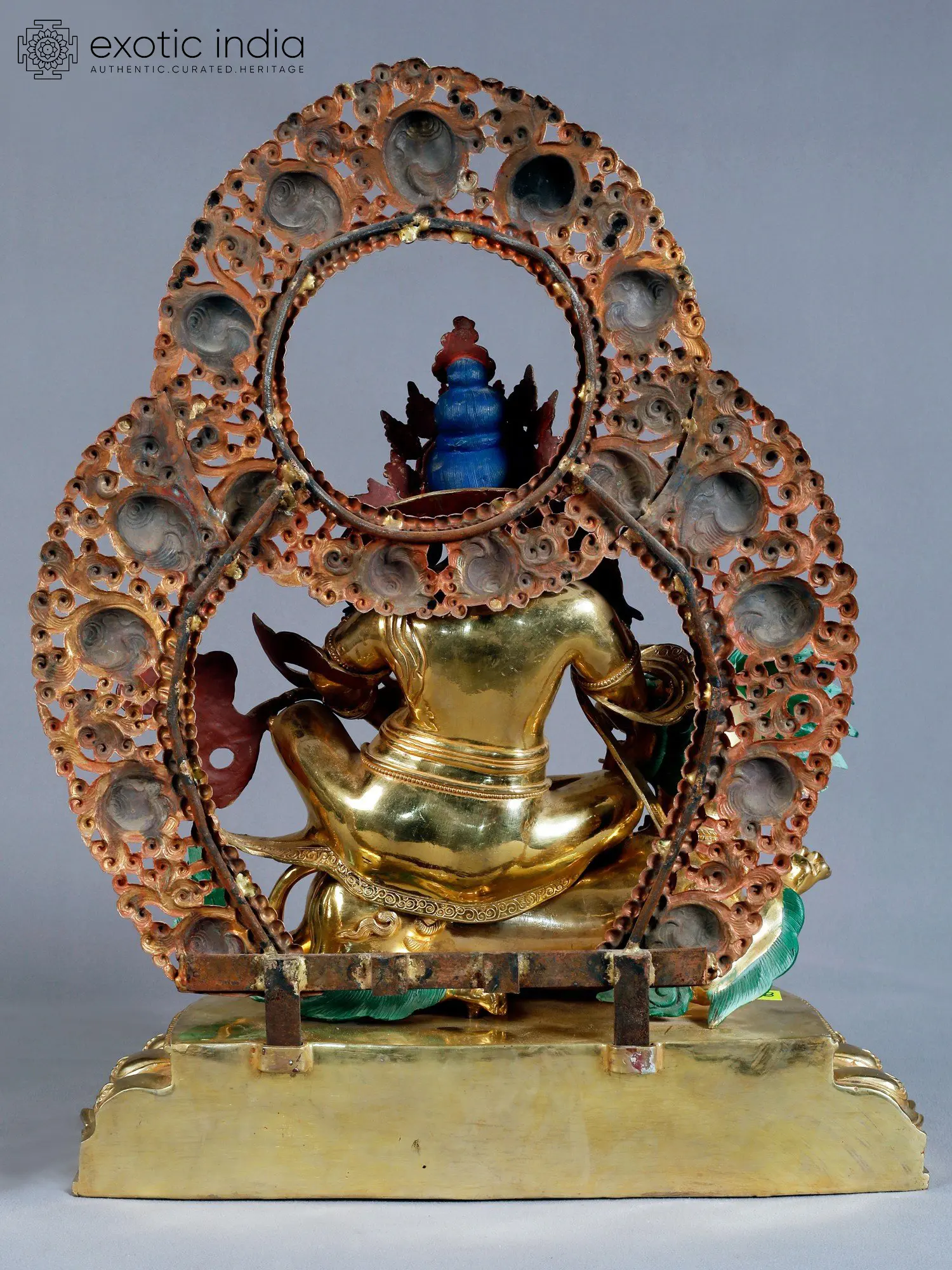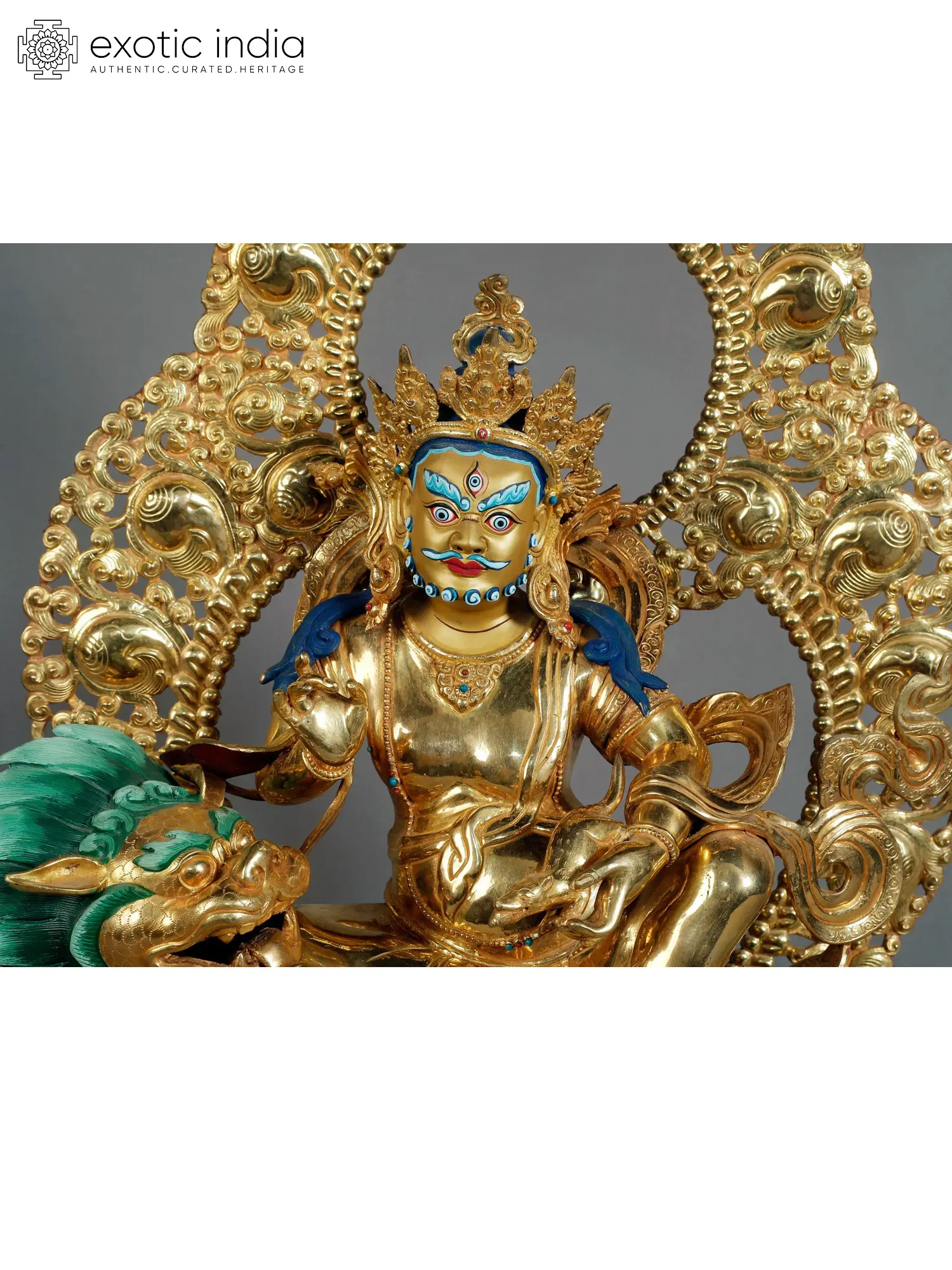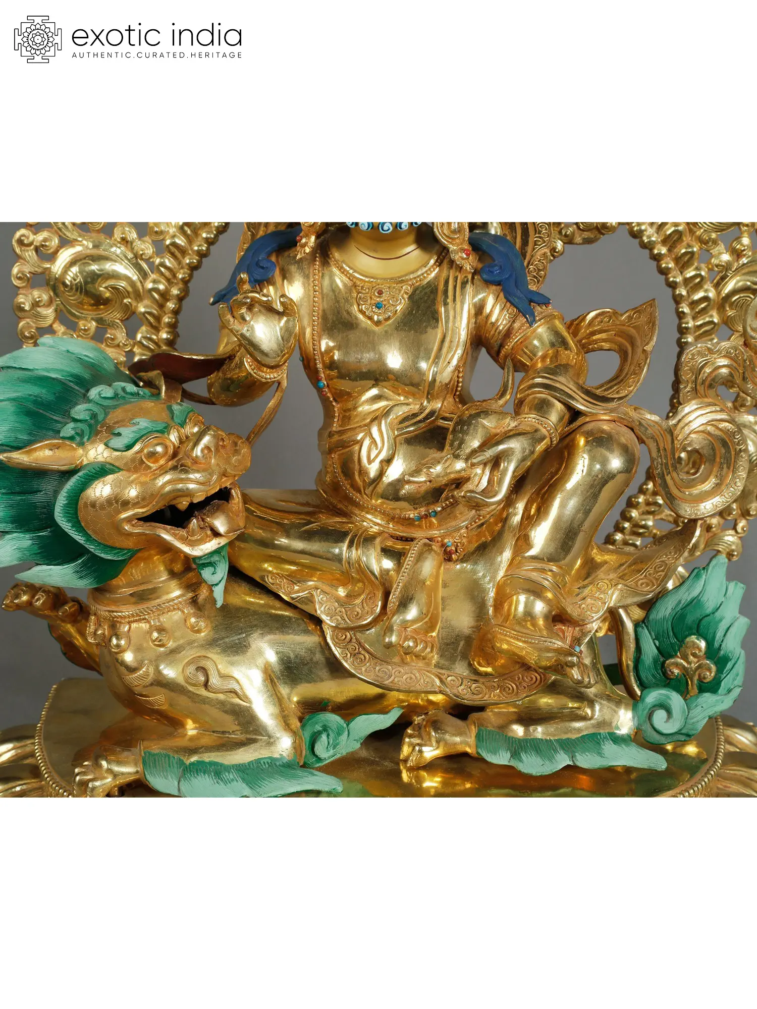 The deity's form is rendered with meticulous attention to detail, showcasing the rich iconographic traditions of Tibetan Buddhism. Jambhala is shown seated in a regal posture, his body adorned with elaborate jewelry and a crown, signifying his status as a king and guardian. His powerful visage, with piercing eyes and a determined expression, conveys his authority and his ability to overcome any impediments to prosperity. The presence of a third eye on his forehead is a classic attribute, symbolizing his profound insight and wisdom, capable of seeing beyond the mundane. The deity's mount, a magnificent lion-like creature with a vibrant green mane, adds to the dynamism and grandeur of the sculpture. This creature symbolizes power, courage, and the conquering of ignorance. Jambhala's right hand is often depicted holding a mongoose spewing jewels, a potent symbol of inexhaustible wealth. While not explicitly visible in every angle, the implied presence of such wealth-generating iconography underscores the deity's role as a bestower of fortune. The intricate detailing of the ornate aureole behind the deity further enhances the sacred aura, with its swirling patterns suggesting cosmic energy and divine grace. The base, designed as a lotus pedestal, signifies purity and spiritual awakening, grounding the celestial deity in a context of spiritual growth. ––––––––––