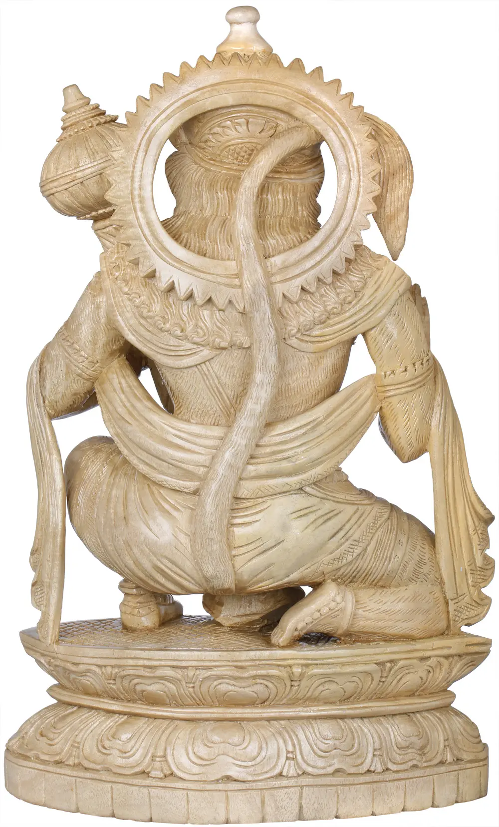 This exquisite wooden carving from South India captures the divine essence of Hanuman, a revered deity in Hinduism, celebrated for his unparalleled strength, unwavering devotion, and profound wisdom. Crafted with meticulous attention to detail, this statue embodies the spirit of Mahabali Hanuman, the mighty hero who played a pivotal role in the epic Ramayana. The rich grain of the wood lends a natural warmth and authenticity to the sculpture, inviting a sense of peace and spiritual connection. The posture of Hanuman in this artwork is particularly significant. Kneeling in a stance of readiness and respect, he holds aloft his mace, the Gada, a symbol of his immense power and authority. His other hand is raised in a gesture of blessing and reassurance, exuding an aura of protection and grace. The artist has masterfully rendered the musculature of Hanuman's powerful physique, hinting at his extraordinary feats. His serene facial expression, with its gentle gaze, conveys a profound sense of humility and selfless service, characteristic of his divine nature. The elaborate headdress and the traditional adornments further enhance the regal and sacred presence of the deity.