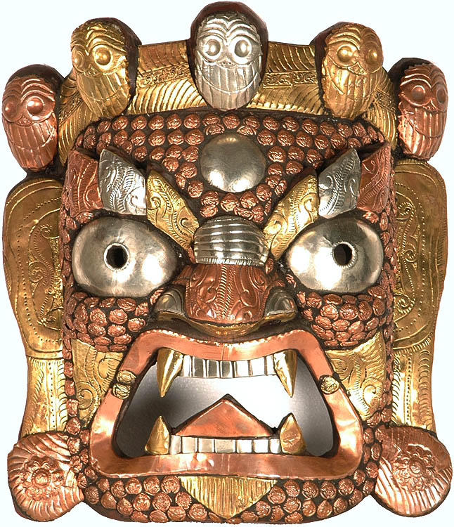 Behold a potent symbol of fierce compassion and unwavering protection – a meticulously crafted mask embodying the formidable Mahakala. This striking piece, blending the earthy warmth of wood with the resonant gleam of metal, offers a powerful presence to any space. The mask presents a face of immense power, intended to dispel negativity, fear, and obstacles on the path to enlightenment. The artist has brought to life the deity's iconic facial features, from its wide, piercing eyes to its snarling mouth exposing sharp fangs. Its overall complex and intriguing design ensures it becomes a captivating focal point, sparking conversation and contemplation.