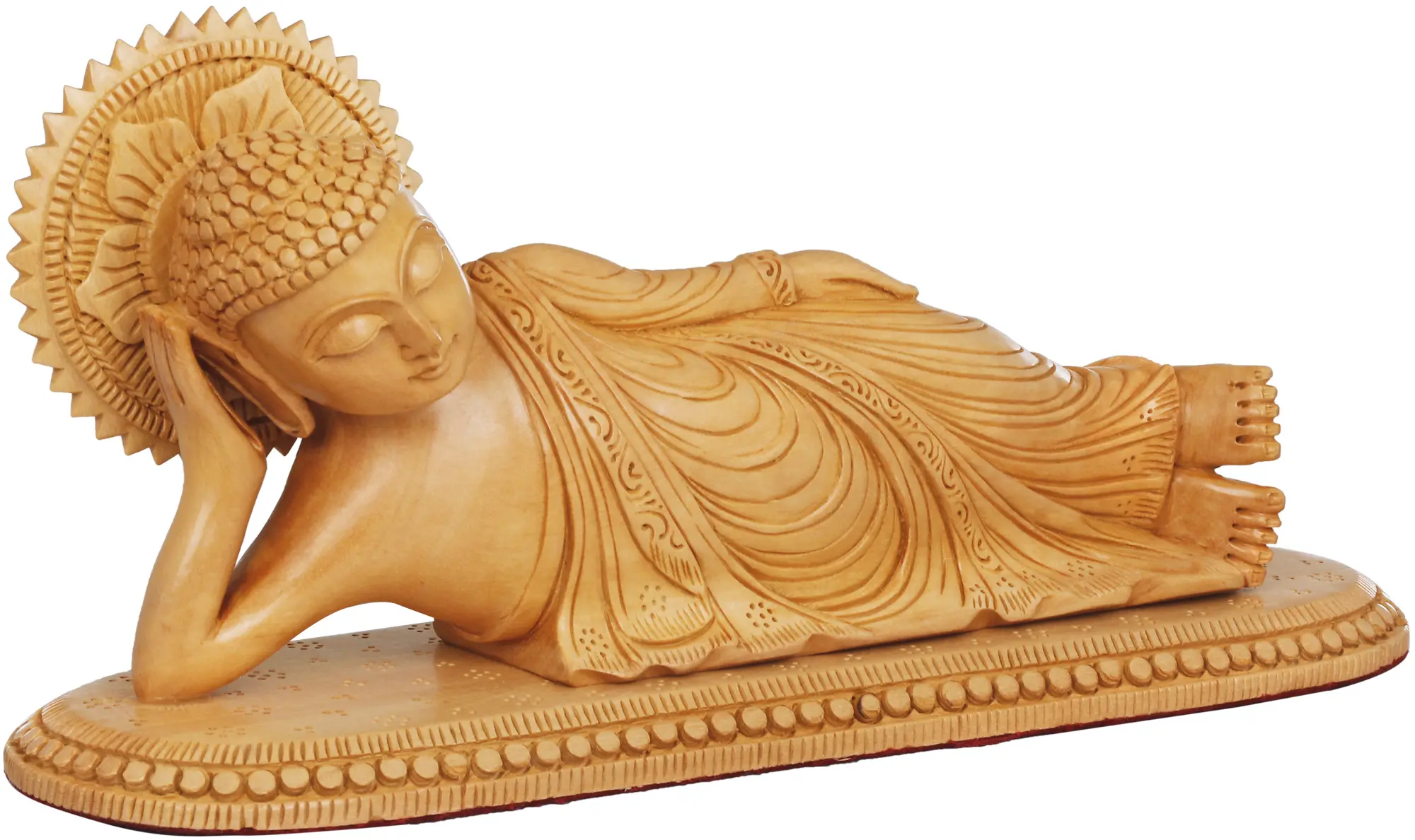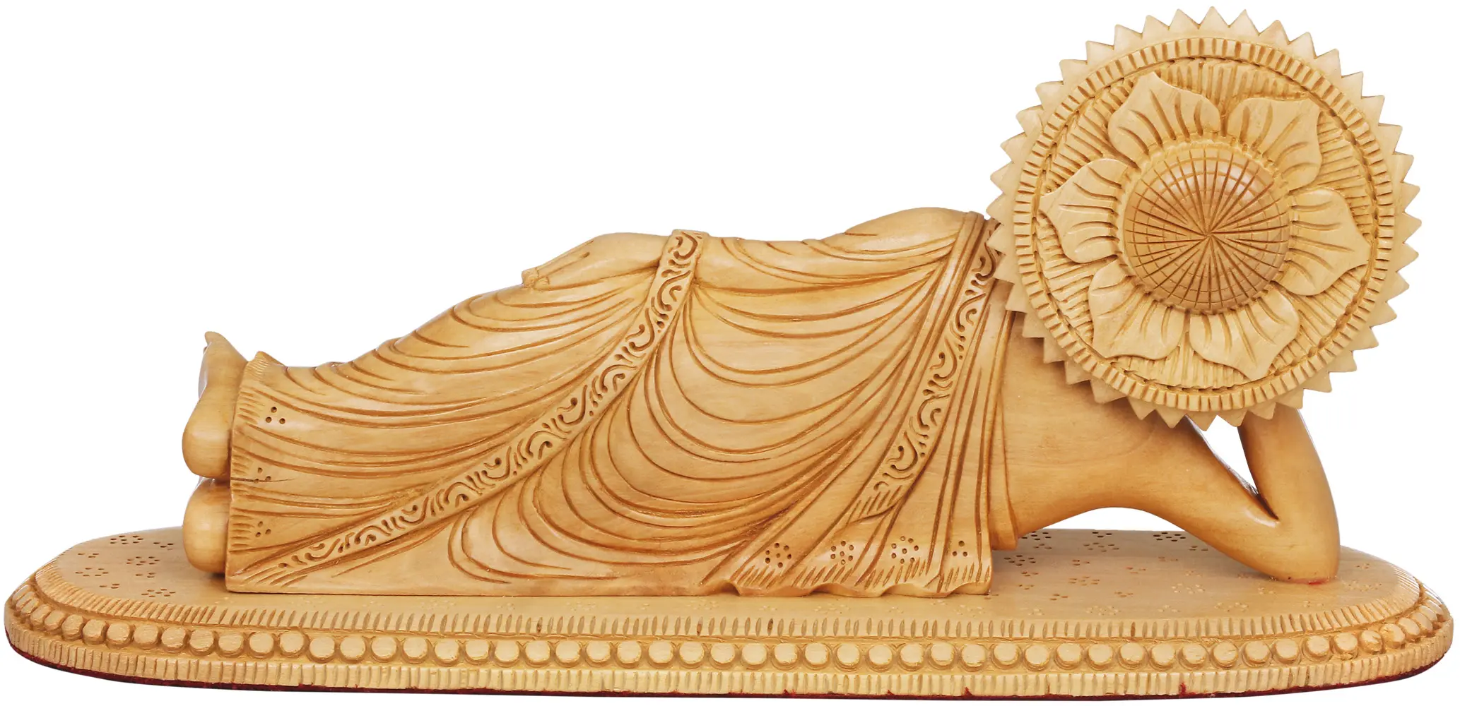 This exclusive wooden sculpture aptly depicts his Mahaparinirvana with Buddha lying down, legs joint, left hand rests on the side in comfort and head supported by right hand. He wears a conventionalized, pleated robe having life like borders, touching the thin oval shaped pedestal, carved with dotted motifs. Sun shaped aureole glowing at the back of his head, symbolic of spreading light and knowledge has a flower design highlighting his purity and softness. Eyes closed with a slight smile show his retreat from the oblivious materialistic aspects. Mahayana Mahaparinirvana Sutra also describes this as the realm of eternal true self of Buddha.