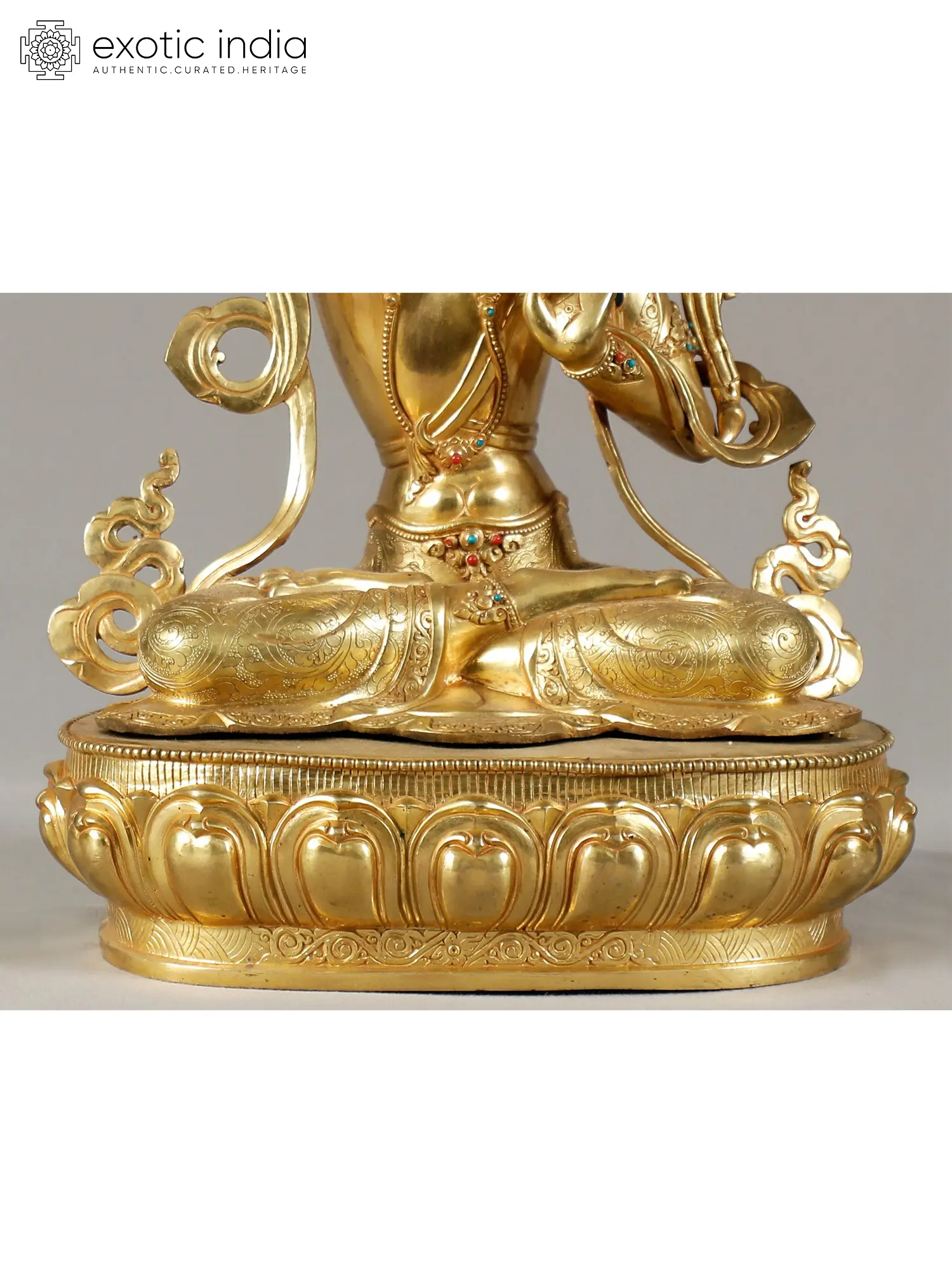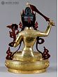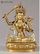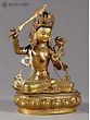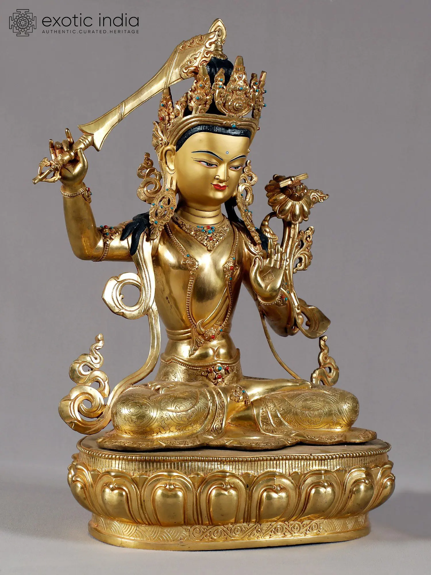 This magnificent copper statue, adorned with a lustrous gold finish, embodies the very essence of wisdom and enlightenment. Crafted in Nepal, a land steeped in spiritual traditions and artistic mastery, this representation of Manjushri is more than just a sculpture; it is a portal to profound understanding and intellectual clarity. Manjushri, revered as the Bodhisattva of Wisdom in Mahayana Buddhism, is depicted here in a posture of serene power, radiating an aura of divine knowledge. The deity's form is exquisitely rendered, with a youthful countenance that belies the immense wisdom he bestows. His eyes, finely sculpted, seem to pierce through illusion, offering insight and dispelling ignorance. The intricate crown adorning his head signifies his royal status as a prince of dharma, while the delicate ornamentation that graces his body speaks to his celestial nature. Each detail, from the subtle curves of his musculature to the flowing lines of his garments, is a testament to the skill of the Nepalese artisans. ––––––––––––––––––