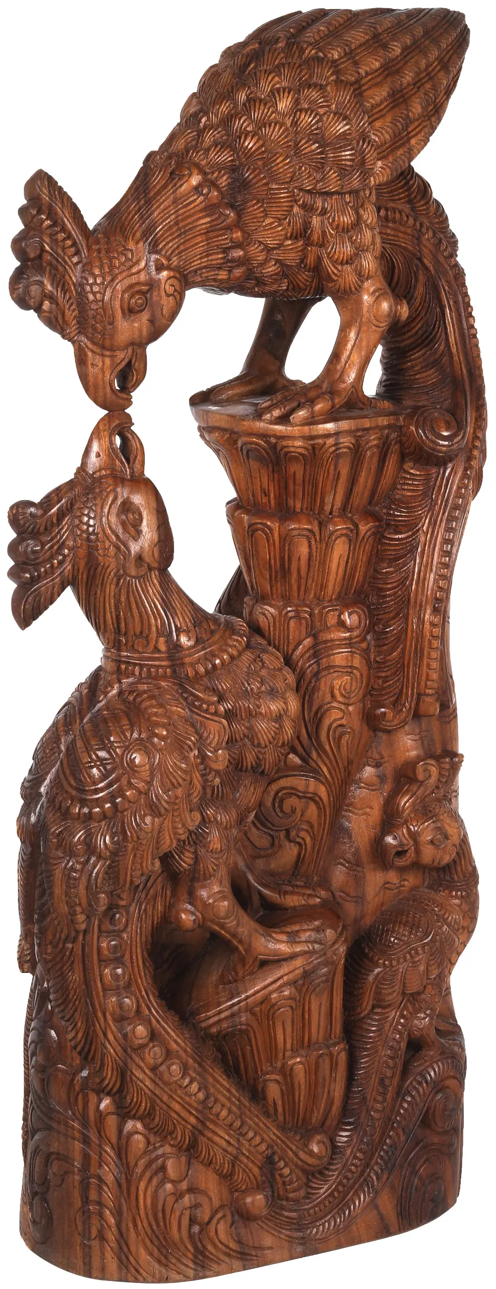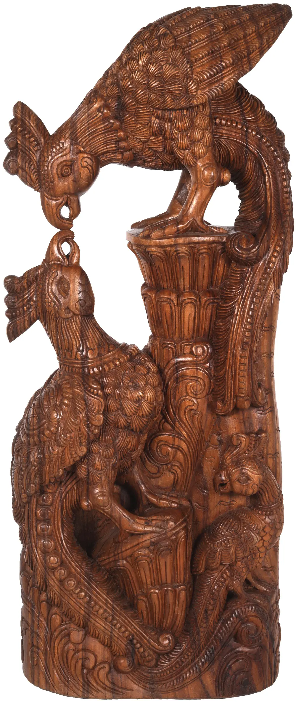 This large-scale carving is a testament to the skill of generations of South Indian artisans. Executed in fine wood, the intricate details of the peacocks' plumage are brought to life through masterful carving. The delicate textures of the feathers, the proud curve of their necks, and the keen expression in their eyes are all rendered with an uncanny realism. The base of the sculpture is adorned with traditional temple motifs, further enhancing its spiritual and artistic value. The warm, rich tones of the wood add to its natural elegance, making it a versatile piece that can seamlessly integrate into various interior design aesthetics, from traditional to contemporary. This carving is more than just a decorative object; it is a piece of art that carries with it stories, beliefs, and the enduring spirit of Indian craftsmanship.
