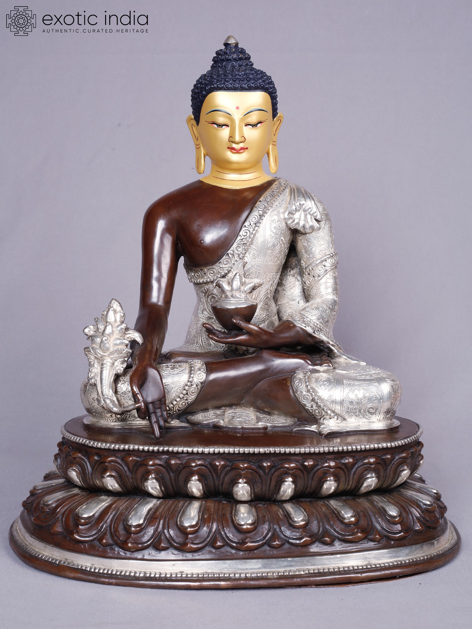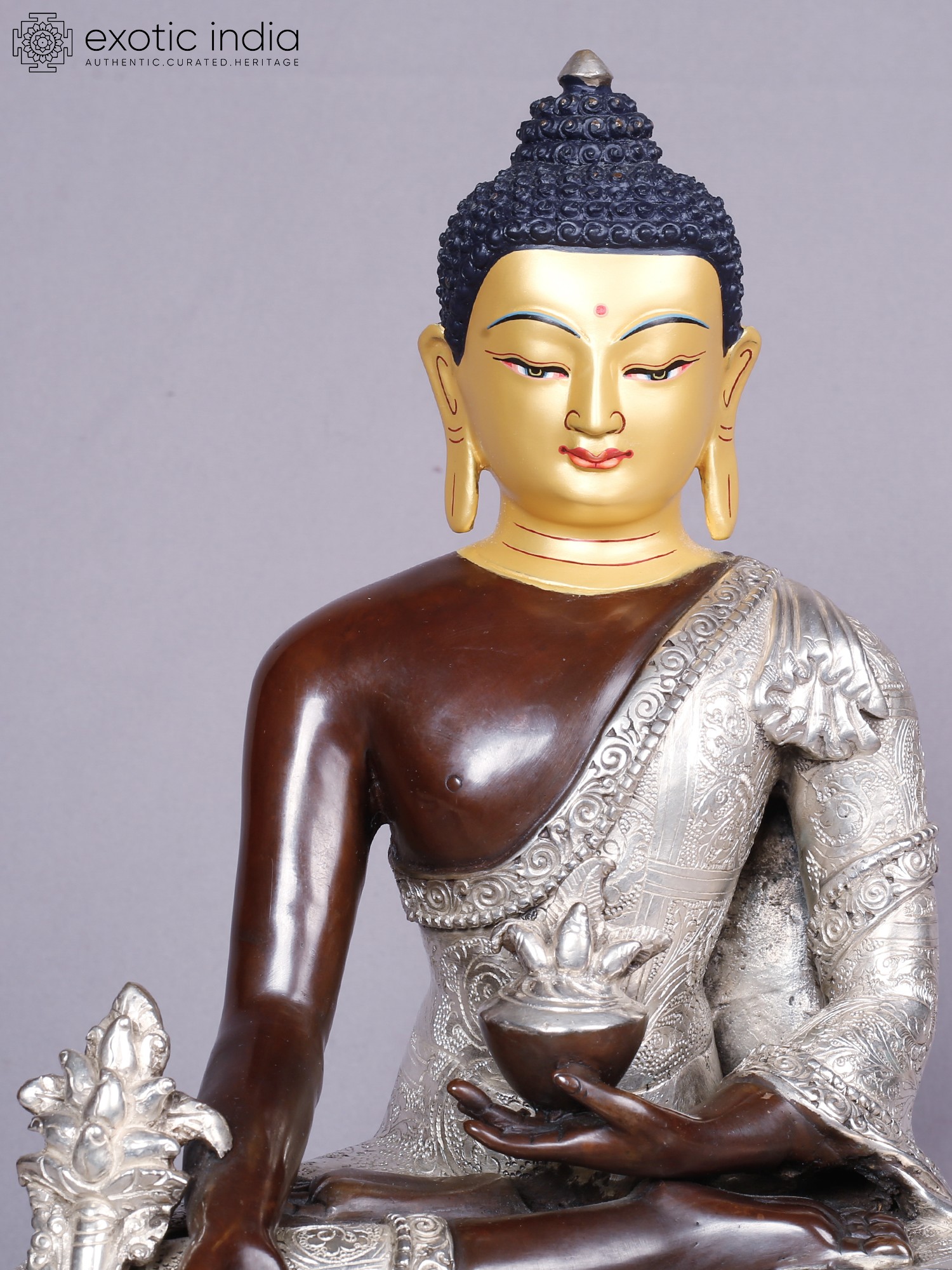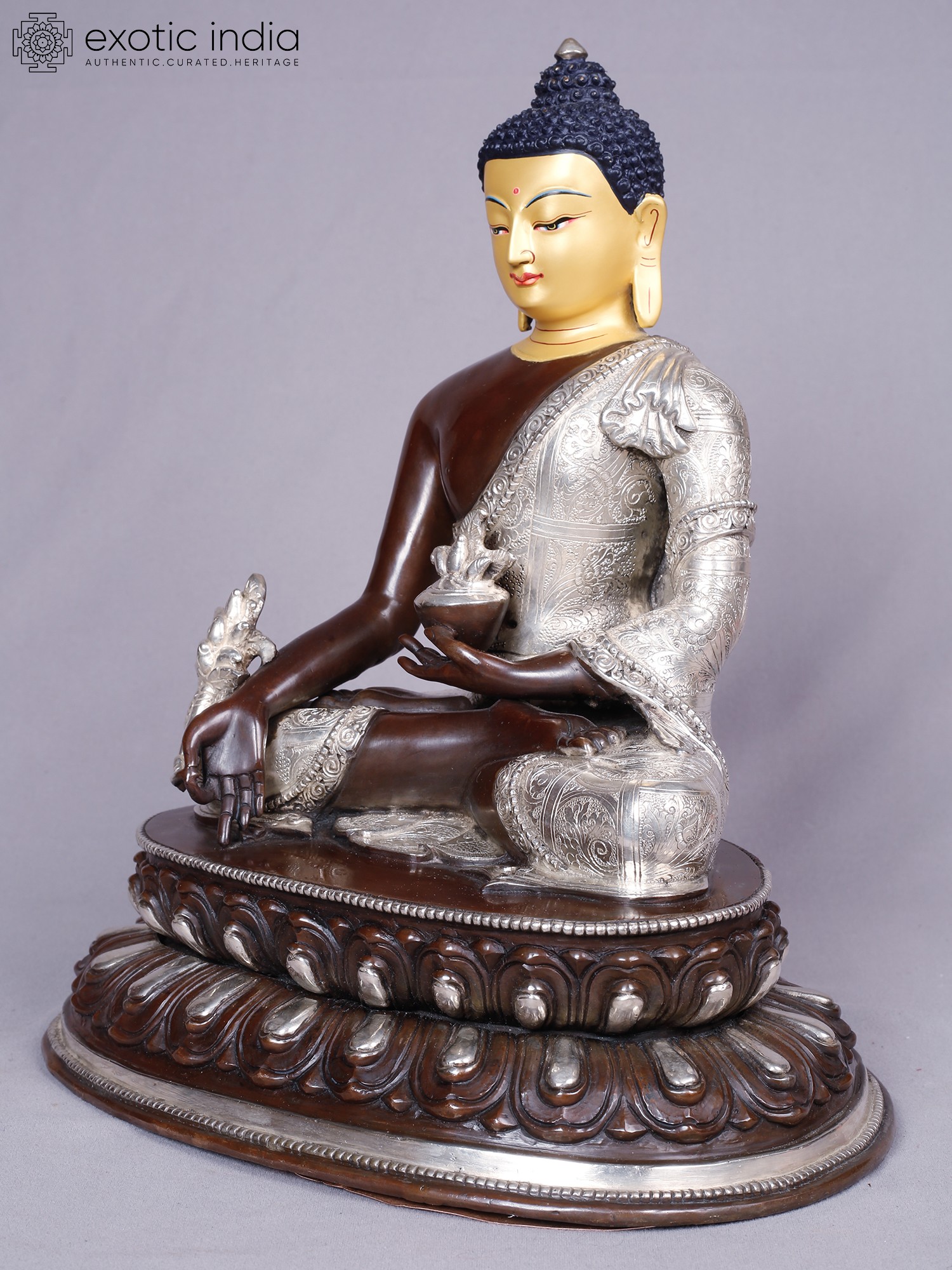 The visage is rendered with serene precision, the golden hue of the face conveying enlightenment and purity. The robe, intricately embossed with delicate patterns in silver, drapes elegantly, symbolizing the purity of intention. The left hand cradles a medicine bowl, a subtle yet powerful emblem of healing, while the right hand is poised in a gesture of bestowing blessings. These refined touches elevate this piece to a work of art, radiating a sense of peace that extends outward.