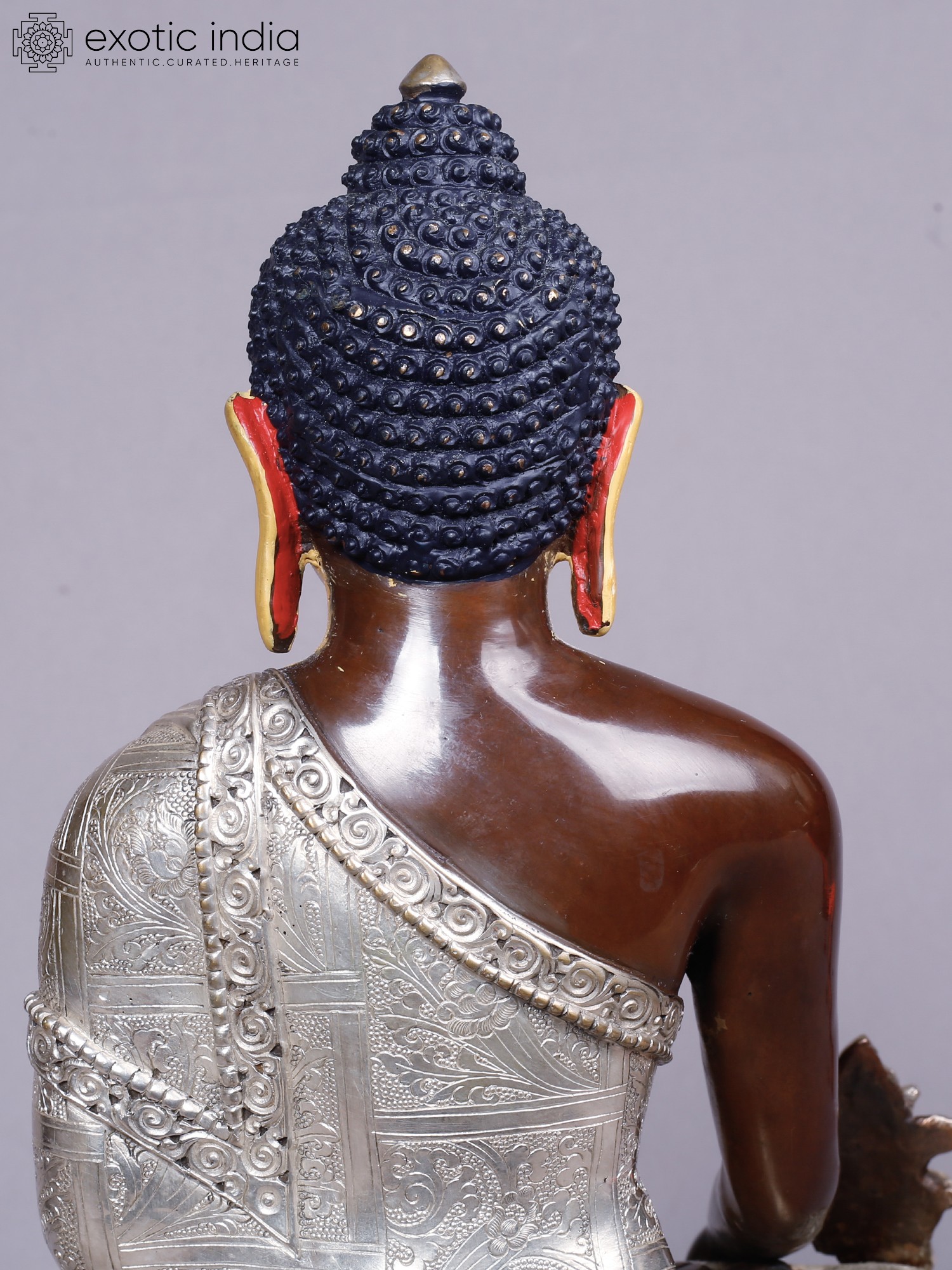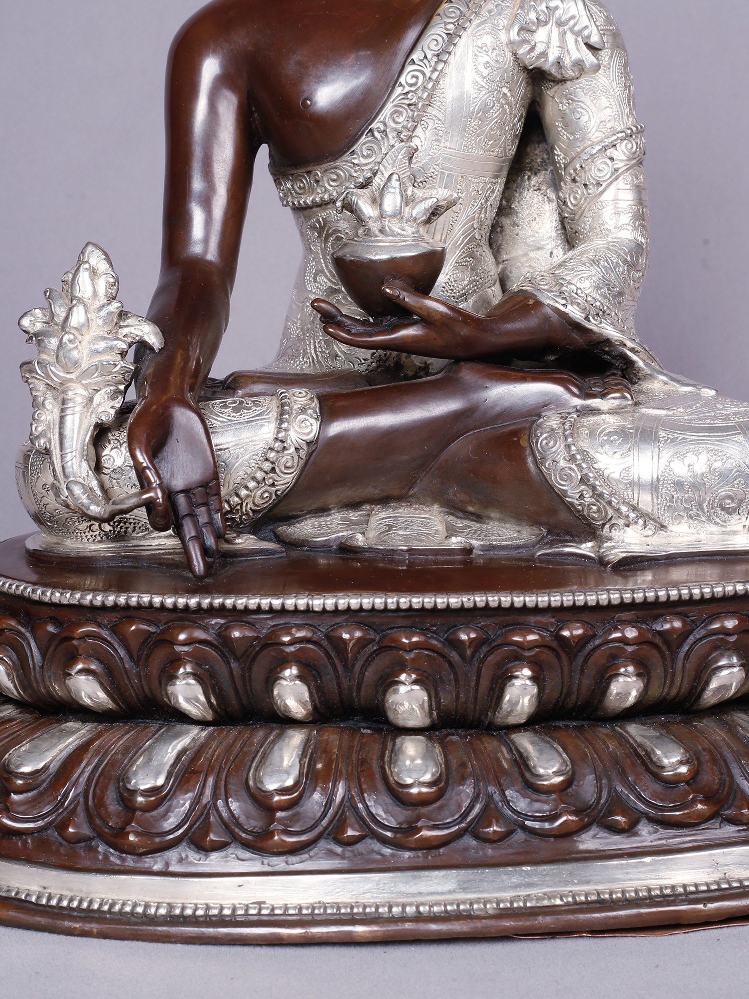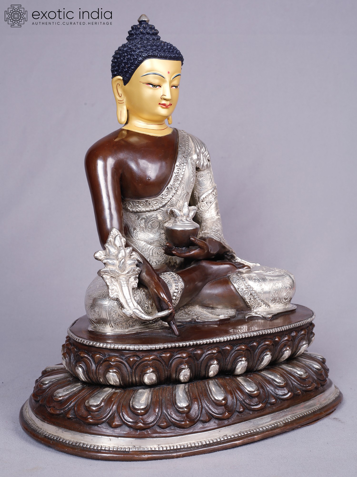 The visage is rendered with serene precision, the golden hue of the face conveying enlightenment and purity. The robe, intricately embossed with delicate patterns in silver, drapes elegantly, symbolizing the purity of intention. The left hand cradles a medicine bowl, a subtle yet powerful emblem of healing, while the right hand is poised in a gesture of bestowing blessings. These refined touches elevate this piece to a work of art, radiating a sense of peace that extends outward.