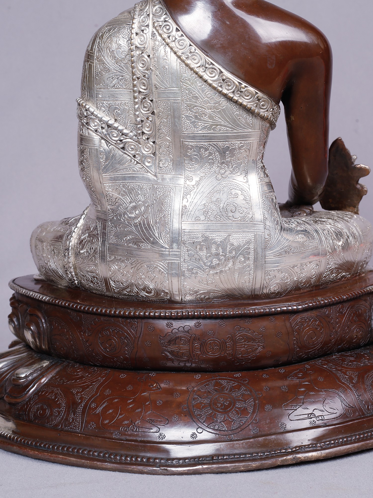 Crafted from robust copper, this deity form has been meticulously brought to life through the skilled hands of artisans. The rich, dark patina of the copper base is beautifully contrasted by the opulent gold and silver plating that adorns significant elements. You'll appreciate the intricate detailing that speaks to generations of traditional metalworking techniques.