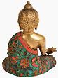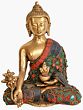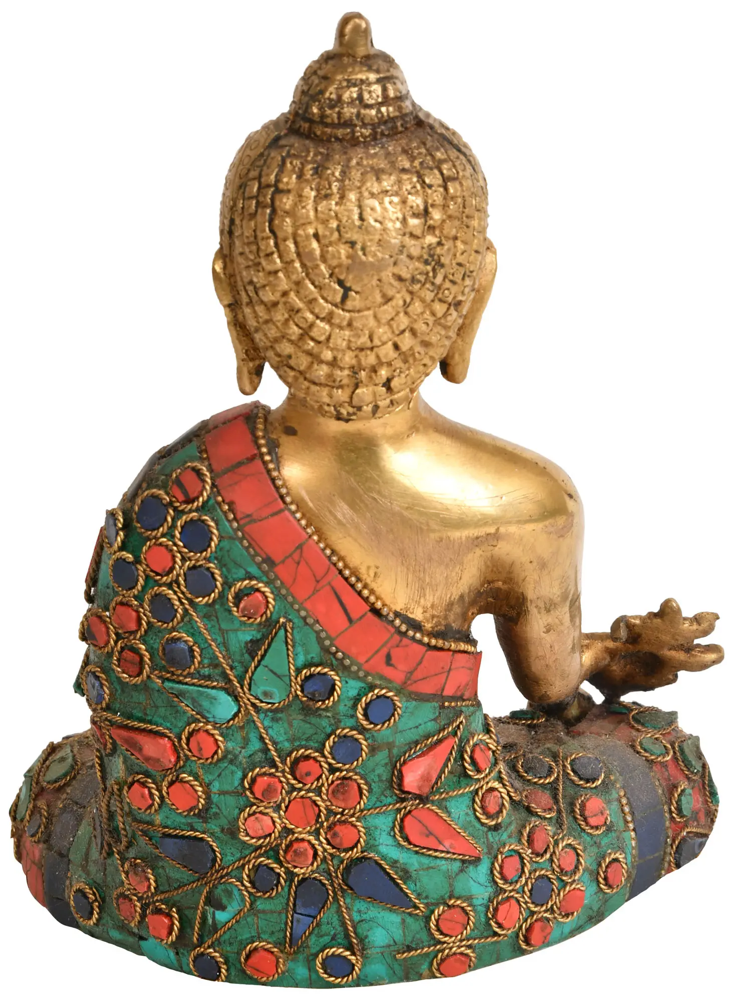 Crafted from durable brass, this statue is adorned with intricate inlays of vibrant stones. The colorful mosaic work on his robes signifies the myriad forms of healing energies and the interconnectedness of all life. The choice of colors and patterns is not merely decorative; each hue and motif often carries symbolic meaning within Tibetan Buddhist art, representing different aspects of enlightenment and spiritual practice. The contemplative expression, the gentle posture, and the symbolic accoutrements all contribute to the profound spiritual aura of this piece. The delicate rendering of his features, from the serene gaze to the subtle smile, conveys a sense of deep wisdom and profound compassion. ––––––––––