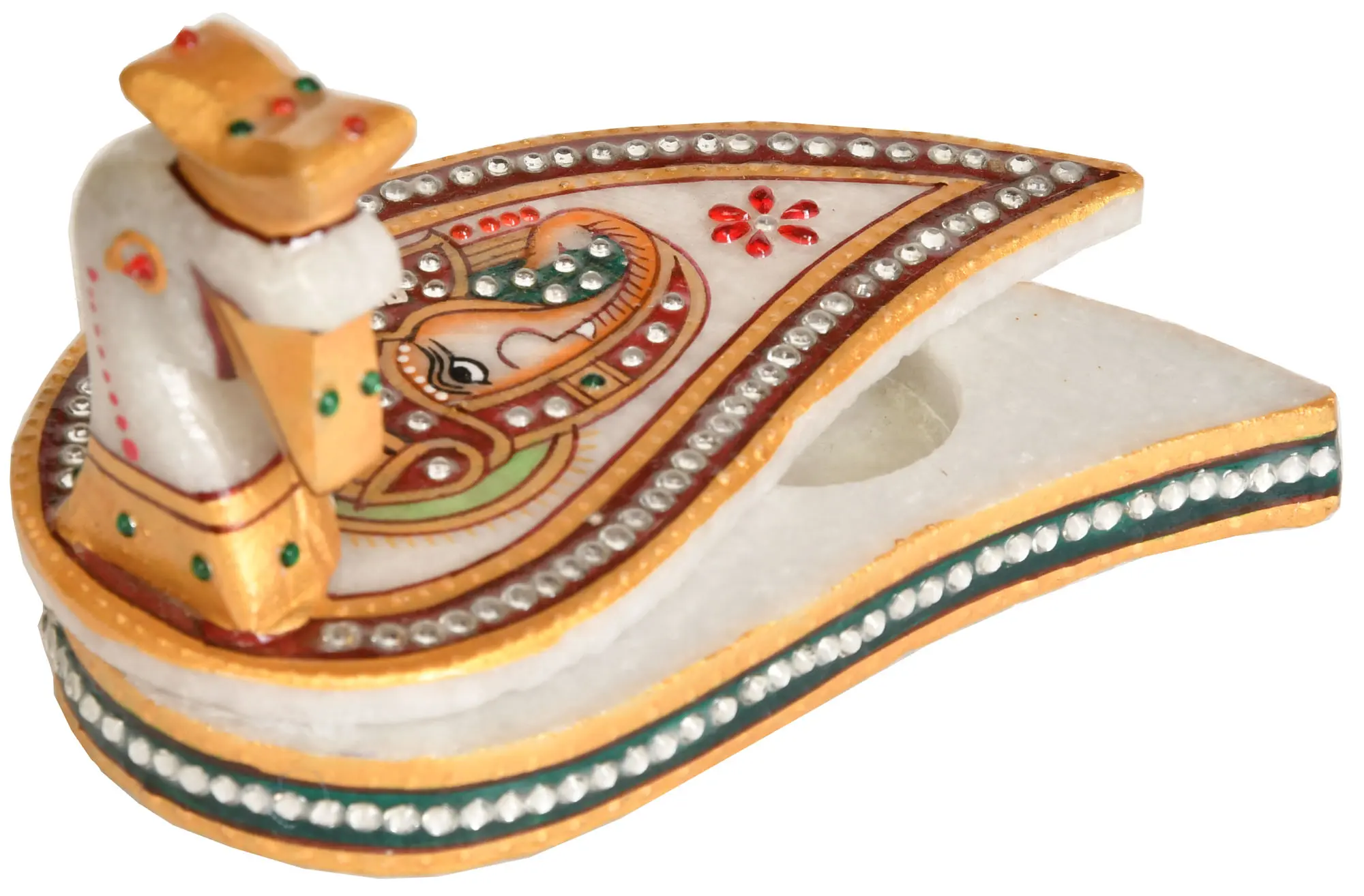 This Minakari Swan Roli Tika Box with Ganesha image is a stunning embodiment of beauty and spirituality. Crafted intricately, the box features a handle shaped like a swan, symbolizing grace and purity. Its paisley shape, adorned with exquisite Minakari work on the borders, exudes elegance and tradition. At its center lies an image of Lord Ganesha, the remover of obstacles and harbinger of success, radiating divine energy and blessings. This ornate box serves as a vessel for sacred rituals, holding auspicious materials like roli and tika, while also doubling as a piece of exquisite art, elevating the spiritual ambiance of any space.