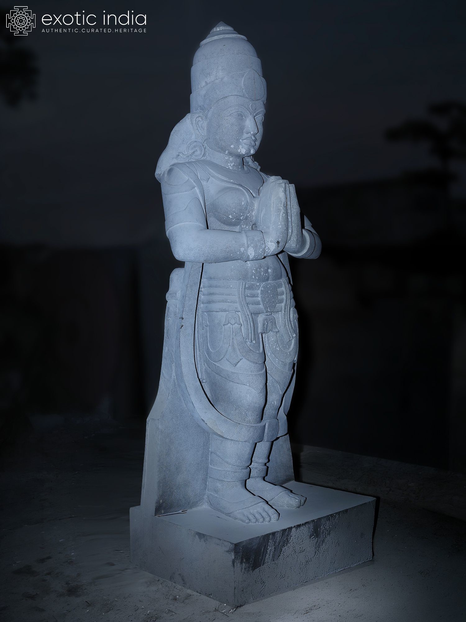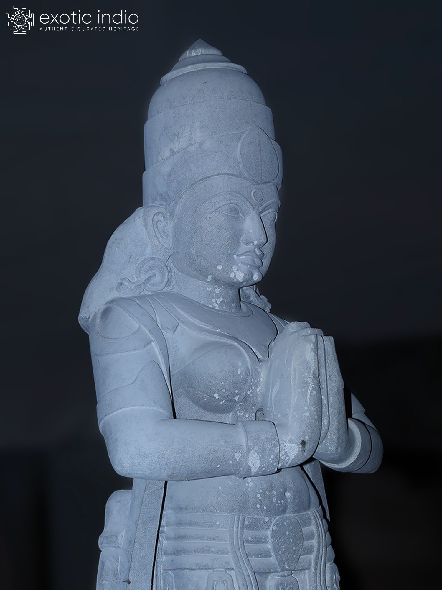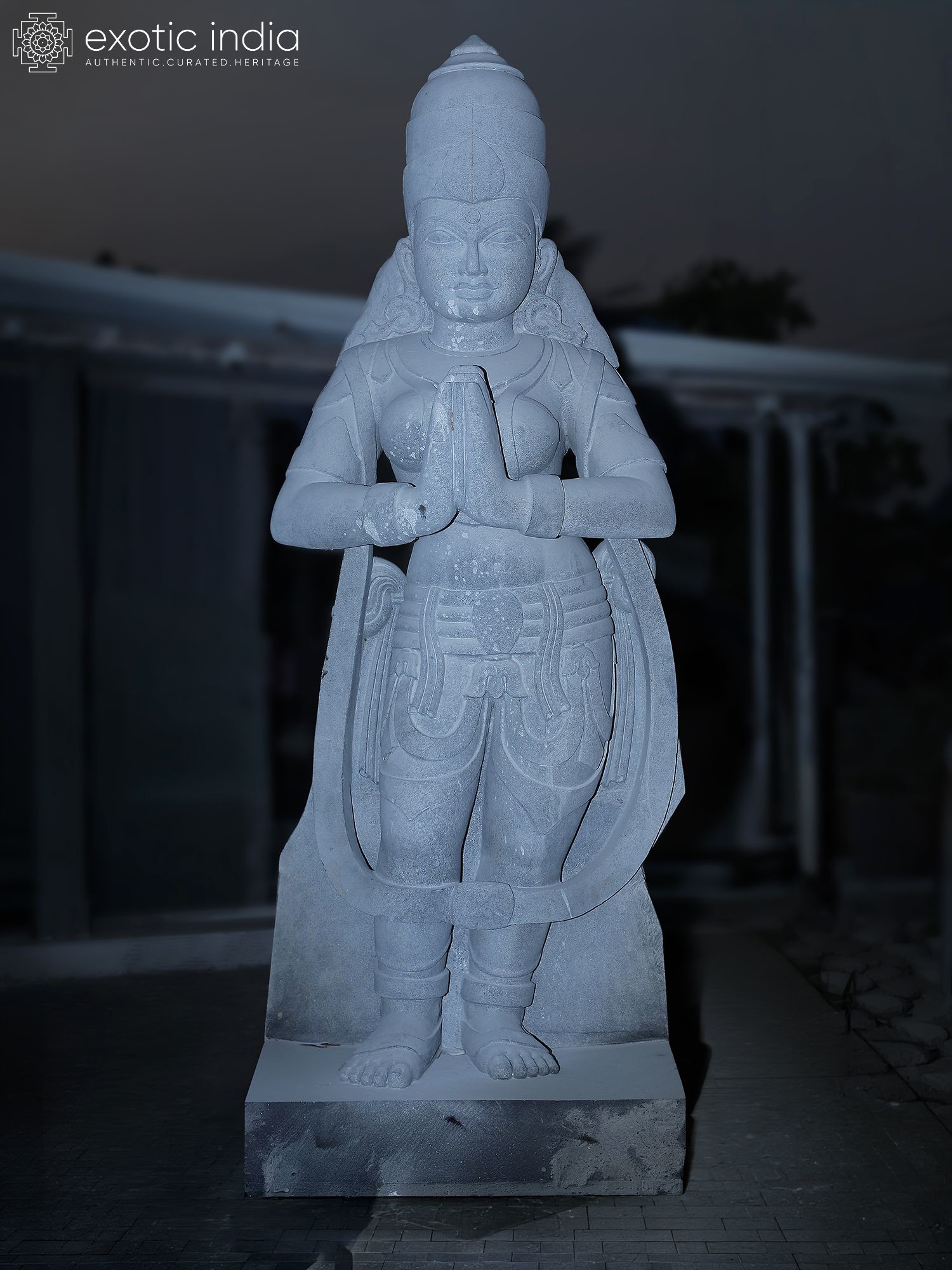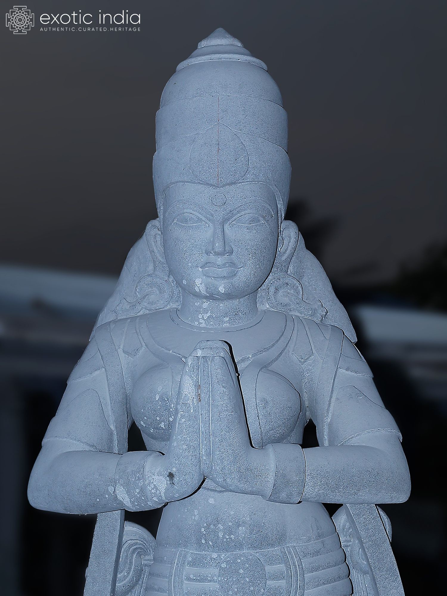 The statue depicts a goddess in a respectful, prayerful pose (Anjali Mudra).