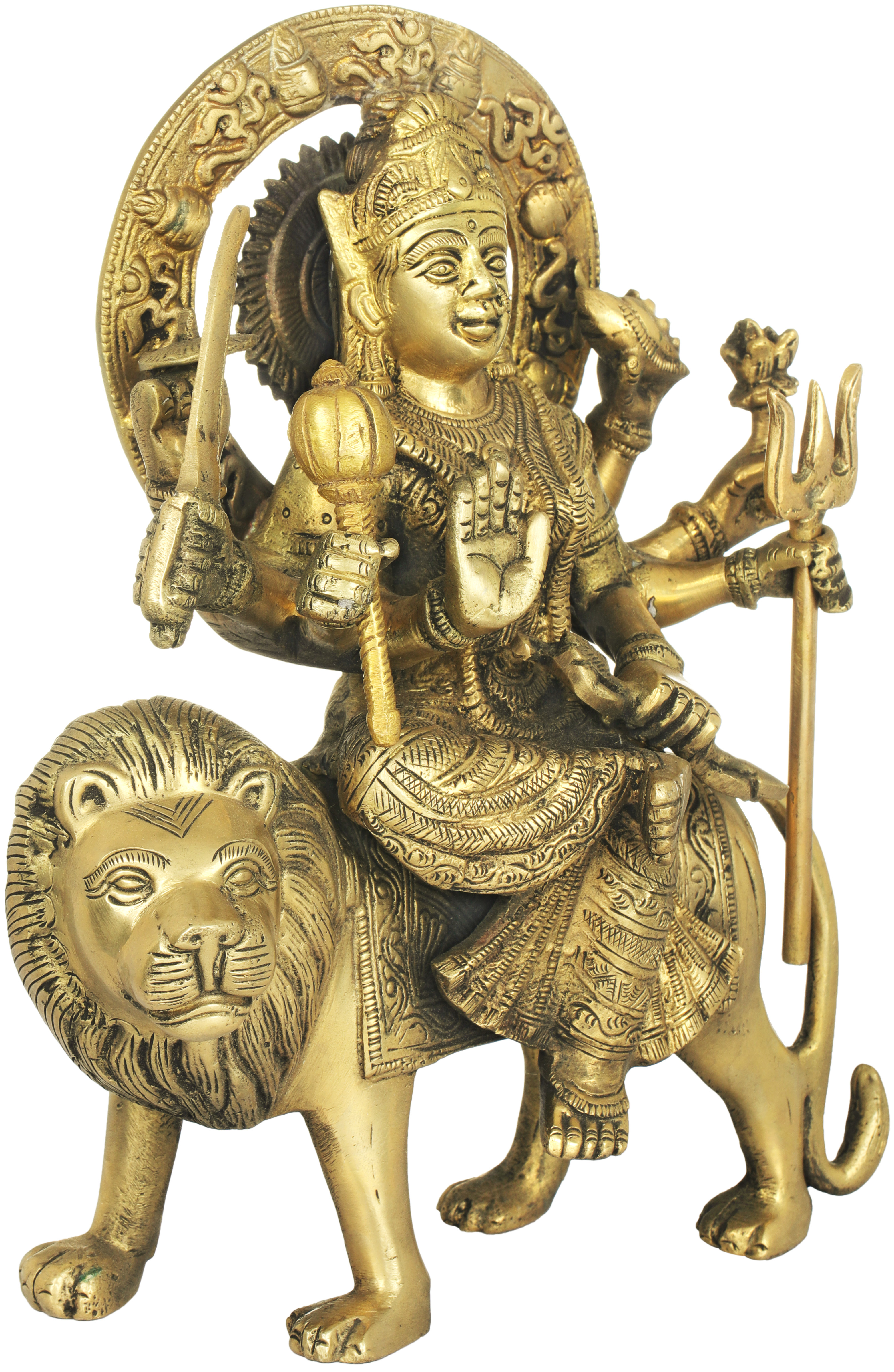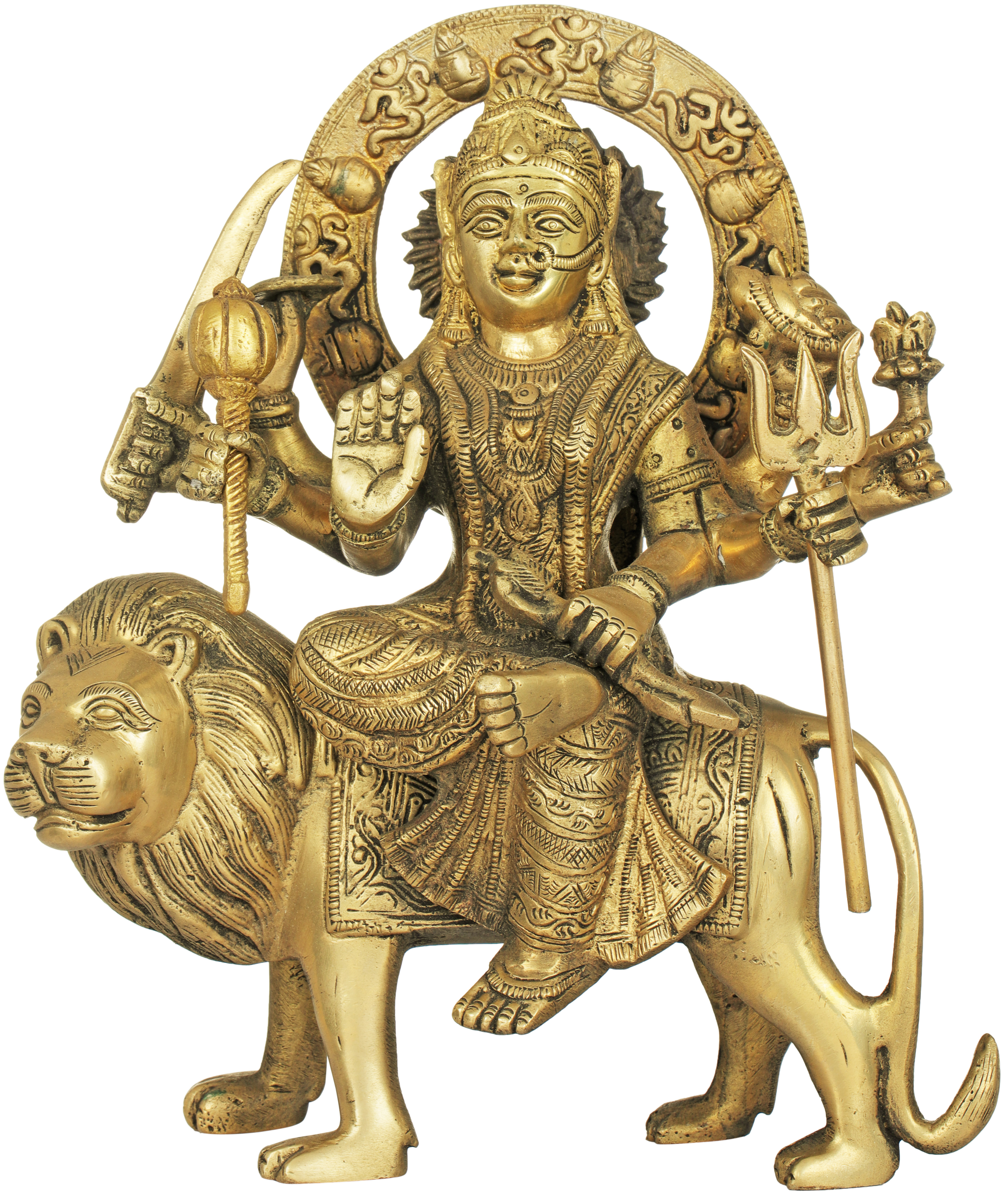 This exquisite brass statue depicts the formidable Mother Goddess Durga, seated majestically upon her fierce lion vahana. Durga, a central figure in Hinduism, is revered as the divine mother, the embodiment of feminine power, and the ultimate destroyer of evil. Her iconography is rich with symbolism, representing her multifaceted nature as a protector, a warrior, and a benevolent mother. In this striking representation, she is portrayed in her triumphant stance, ready to vanquish any adversity that threatens her devotees. The lion, her loyal mount, is a symbol of courage, strength, and royal authority. Its presence beside Durga signifies her dominion over all forces, both within and without. The lion’s powerful form, rendered in lustrous brass, mirrors the goddess's own unwavering resolve and fierce protectiveness. Together, they form an inseparable unit, a divine force dedicated to upholding righteousness and restoring cosmic balance. –––––––––––––––––––