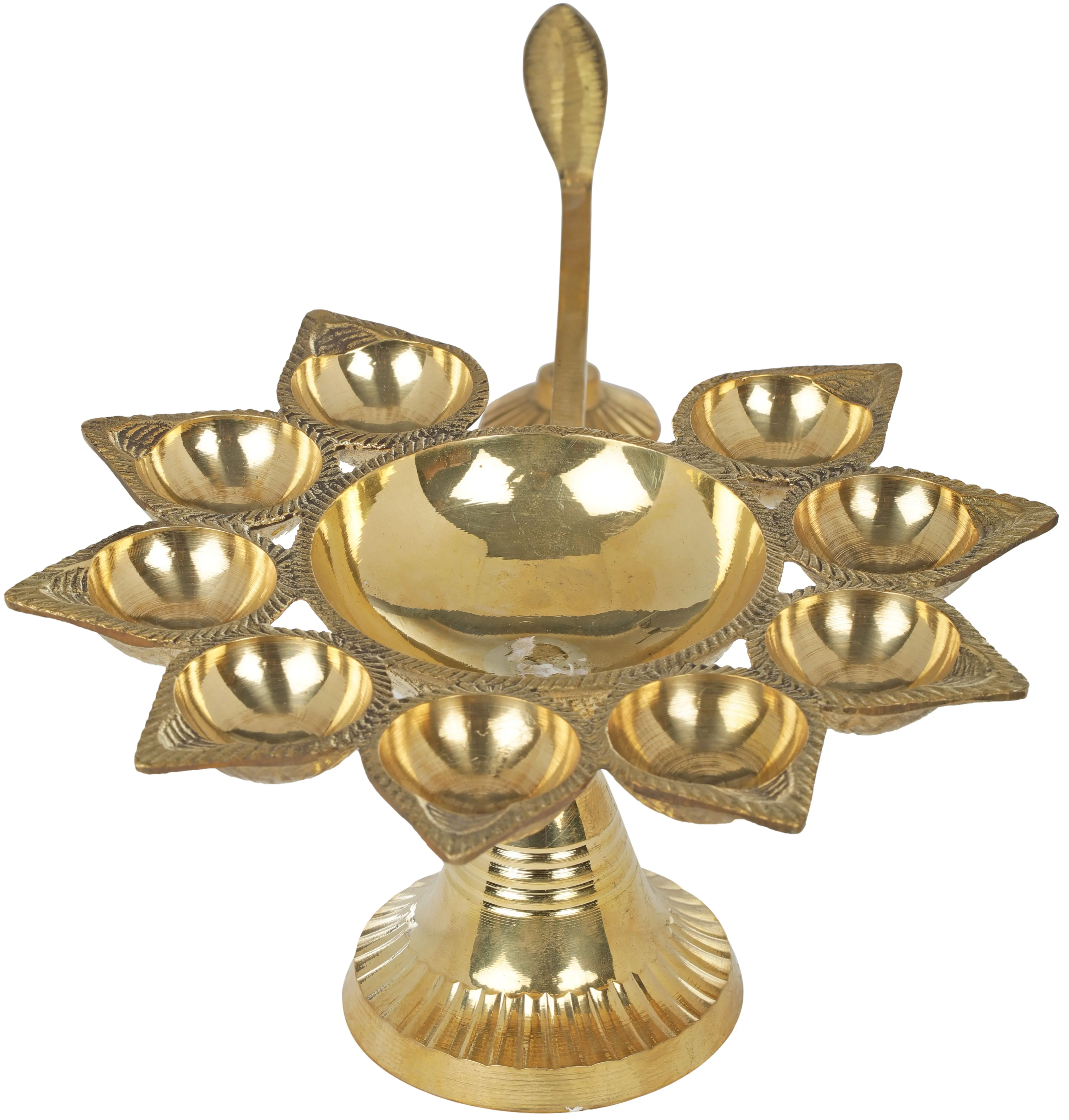 The act of lighting an Aarti lamp is more than just a ritual; it is a profound expression of love, gratitude, and surrender to the divine. The flickering flames represent the transient nature of the material world and the eternal flame of the soul. As the lamp is moved in a circular motion, it is believed to invoke the presence of the gods and to ward off negative energies. This multi-wick lamp, with its ability to illuminate more profoundly, amplifies these sacred intentions. It is an ideal addition to your home altar, puja room, or any space where you seek to create an atmosphere of peace, devotion, and spiritual connection. Whether for daily prayers, special festivals, or as a thoughtful gift, this brass Aarti lamp embodies the enduring spirit of Indian spiritual traditions.