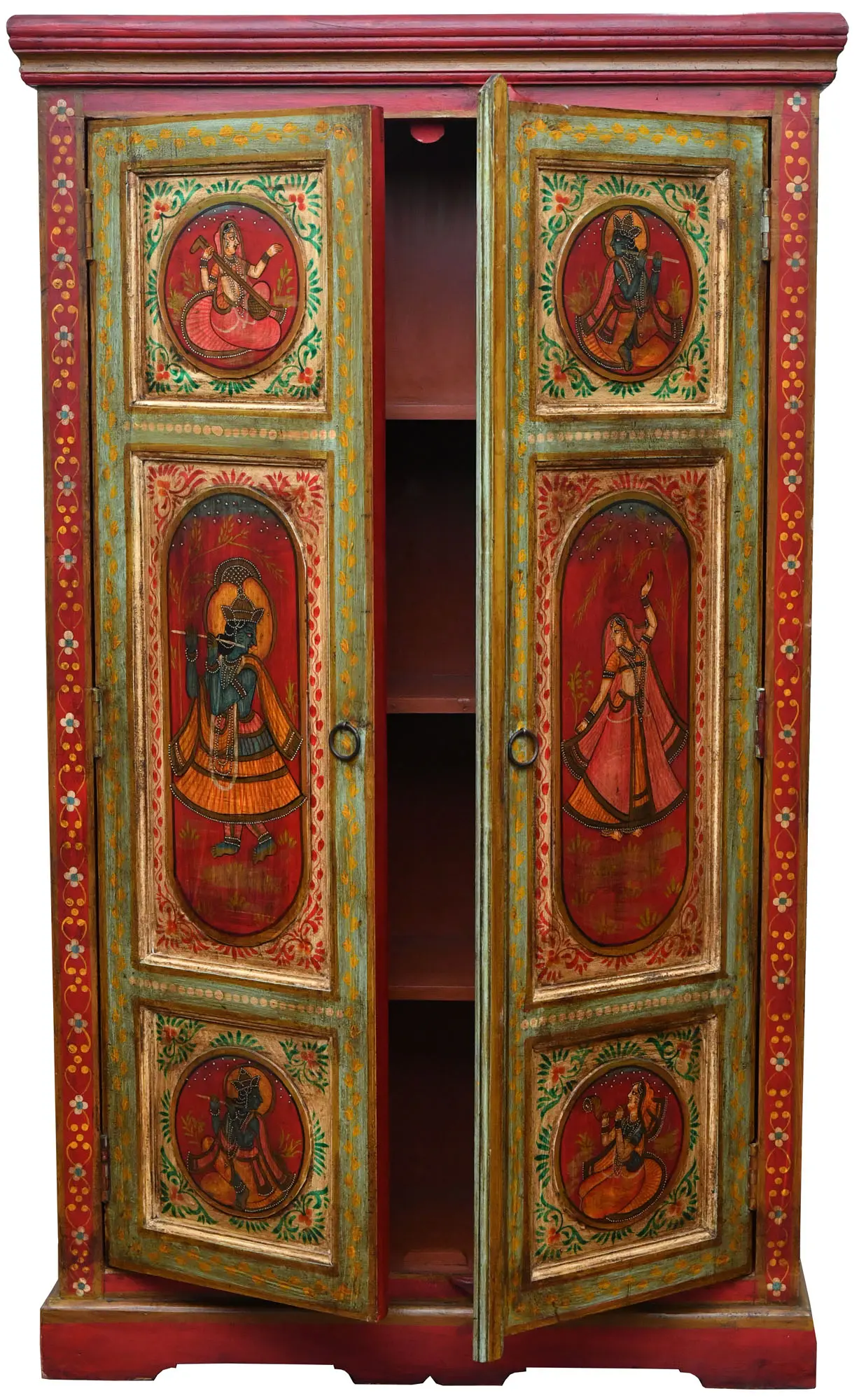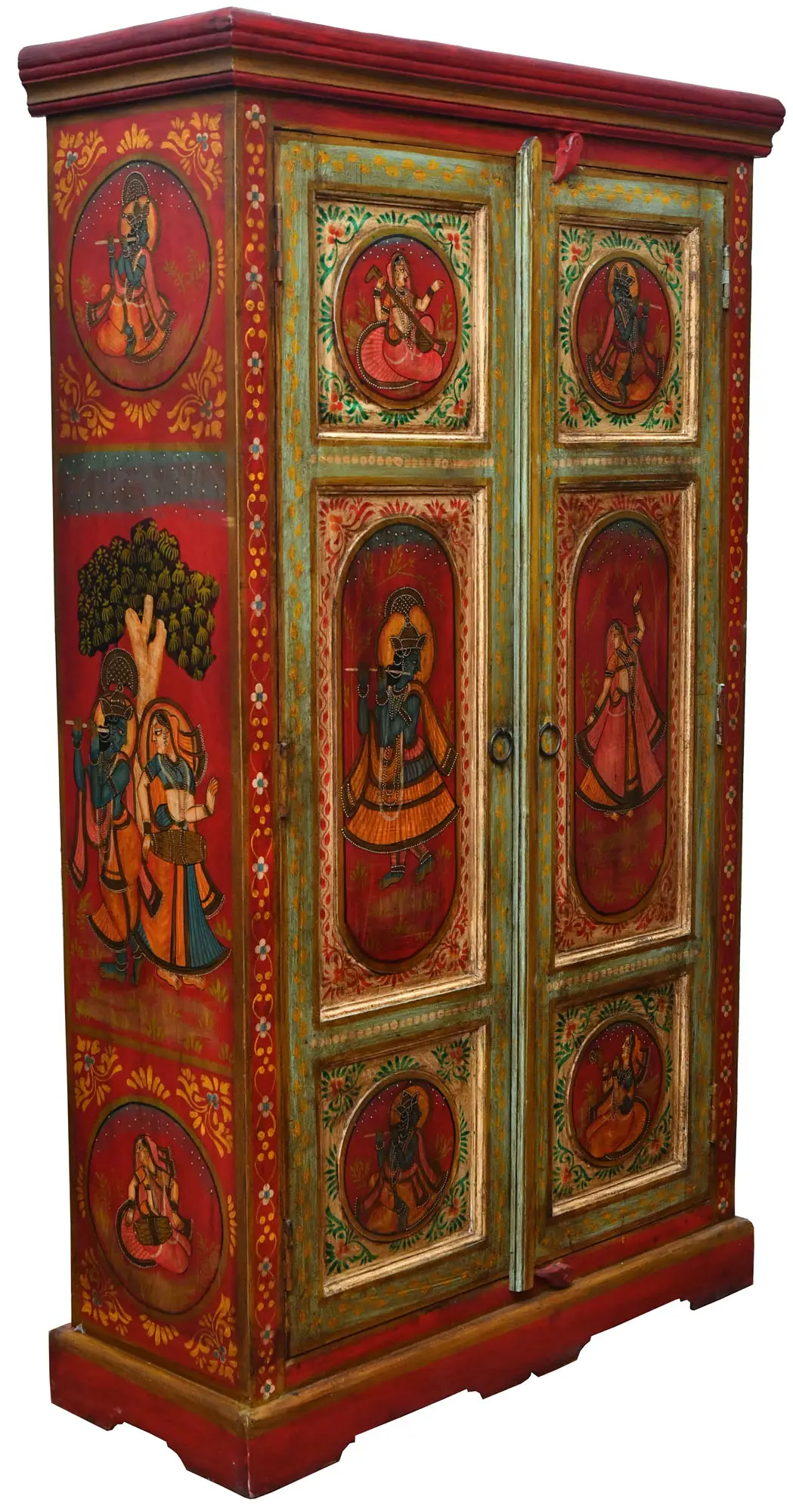 The imagery on this almirah is a testament to the rich tapestry of Indian art and mythology. On the doors, you'll find striking portraits of Krishna, the mischievous yet divine flute player, often depicted with his enchanting music that drew all beings into his spell. Beside him, the graceful Radha, his devoted beloved, is shown in poses of adoration, dance, and song. These depictions are not merely decorative; they are windows into a timeless narrative of pure, unconditional love, spiritual longing, and divine union. In Hindu tradition, Radha's love for Krishna is considered the epitome of selfless devotion (bhakti), a path to spiritual liberation for devotees.