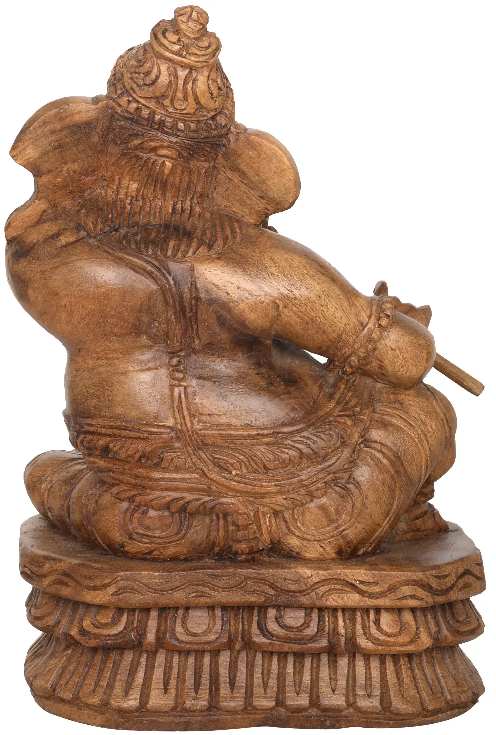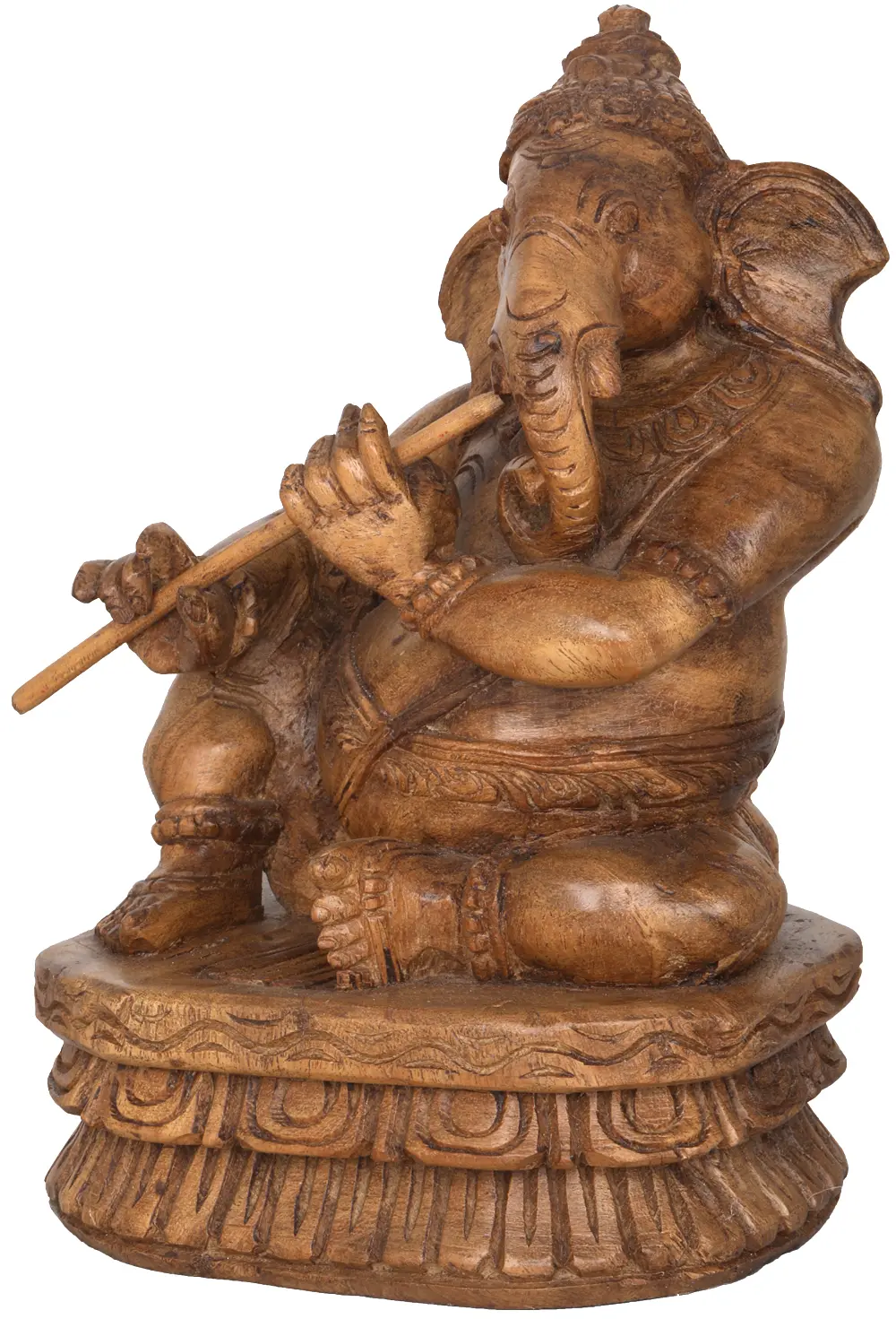 The Ganas are described as beings fond of fun and frolic. Ganesha is the master of Ganas and is also adept in playing musical instruments and all forms of dance. This Musician Ganesha Playing Flute wood statue is a captivating embodiment of the jovial form of Ganesha. Here in this statue Lord Ganesha sits in the Rajalilasana pose and plays the flute. The sculpture radiates cultural richness, with intricate detailing in the divine attire and the expressions on Ganesha's face exuding tranquility.