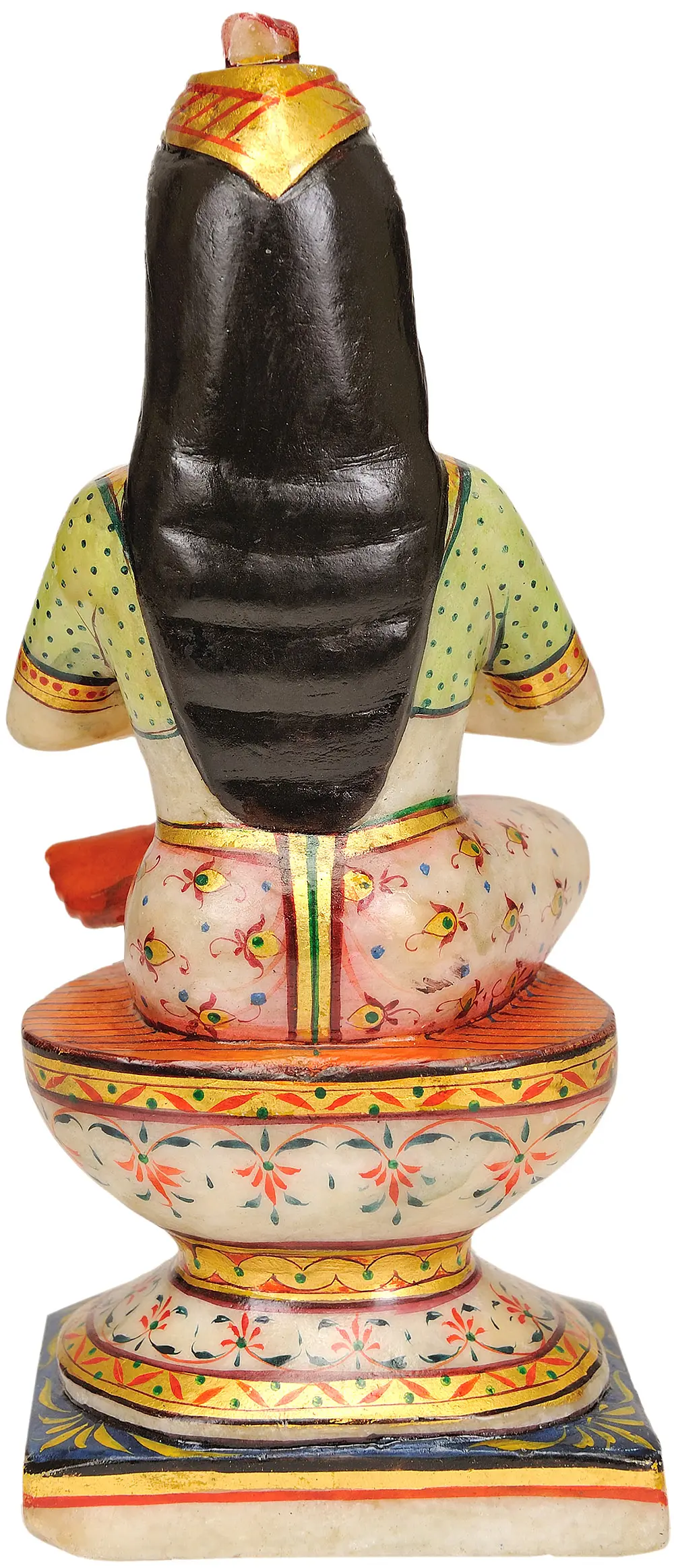 This exquisite marble statue captures a moment of profound reverence and welcoming. The figure is depicted in a graceful seated posture, legs crossed, with hands pressed together at chest level in the traditional Namaste gesture. This iconic salutation, deeply rooted in Indian culture, signifies respect, honor, and the divine spark present in all beings. It's a gesture that transcends language, embodying hospitality and a peaceful greeting. The artistry of this piece is evident in every detail. Carved from high-quality marble, the statue possesses a delicate luminescence that enhances its spiritual aura. The figure is adorned in vibrant, hand-painted attire. Her garment is a rich green, detailed with a pattern of tiny gold circles and delicate floral motifs. Ornate necklaces, crafted with faux pearls and red beads, rest gracefully on her décolletage, reflecting the opulence of traditional Indian adornment. Her arms are encircled by decorative bangles, adding to the overall sense of regal beauty.