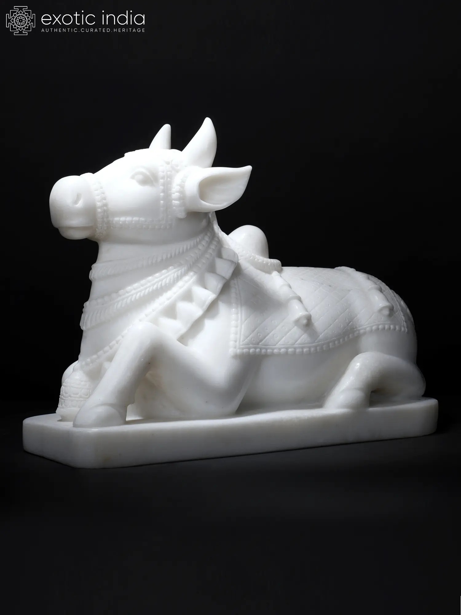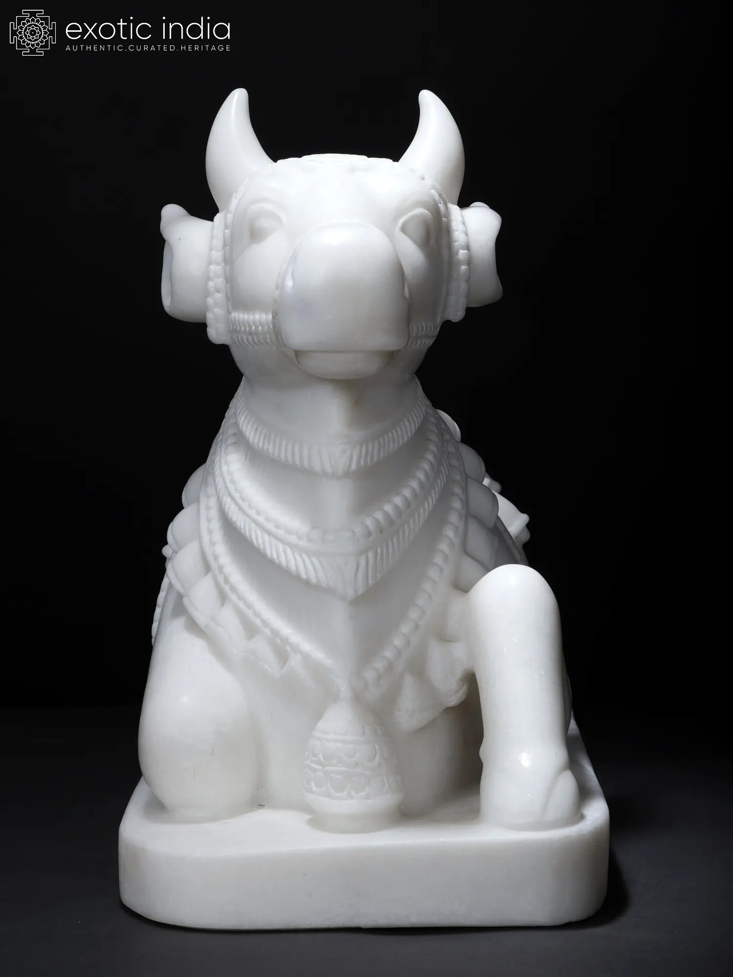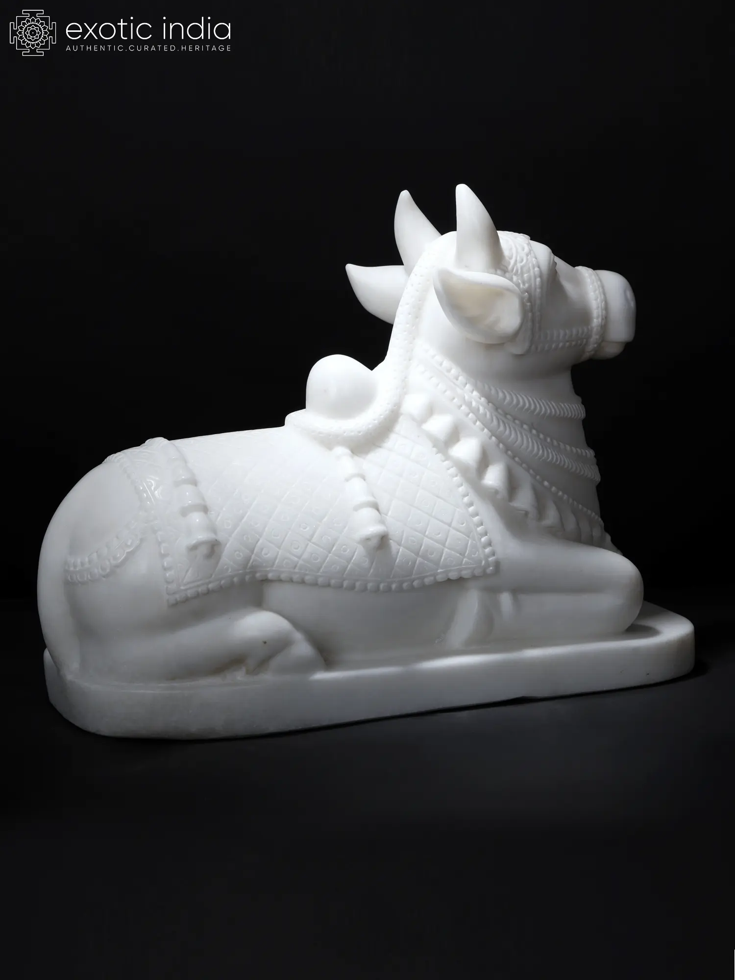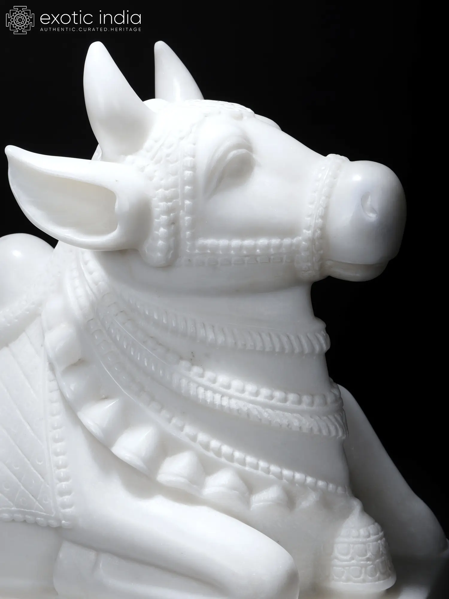 This humped bull, carved out of a single block of pristine white marble, represents Nandi, the vehicle of Bhagawan Shiva. The stone sculptor has adorned his neck and back with several strands of necklaces, bells and a decorated overcloth.