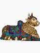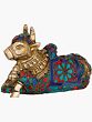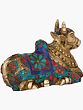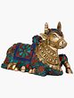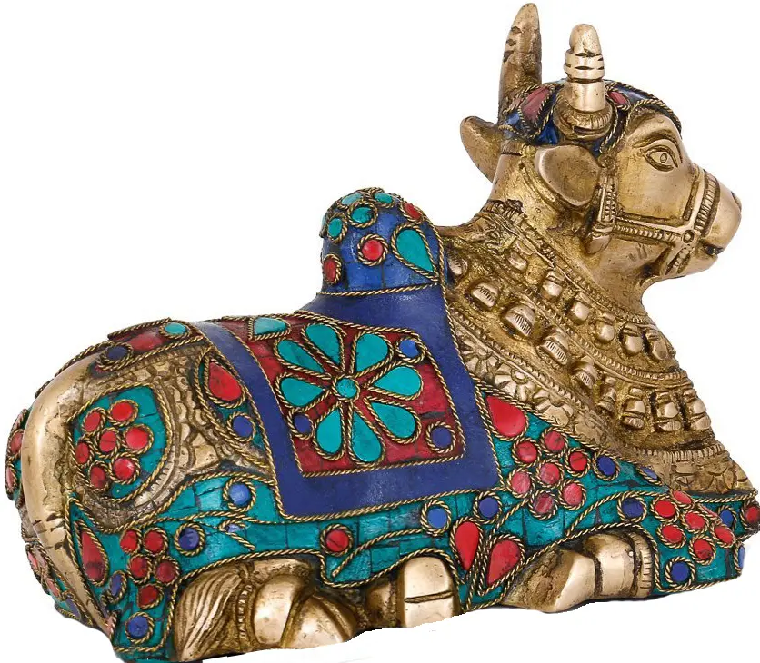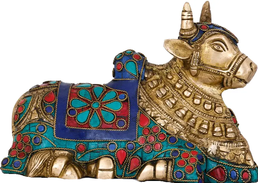 Behold the divine representation of Nandi, the sacred bull, the steadfast and loyal Vahana of Lord Shiva. This exquisite brass statue captures the essence of unwavering devotion and spiritual power. Crafted with meticulous detail, Nandi is depicted in a characteristic reclining posture, embodying a sense of peaceful vigilance. His sturdy form is a testament to his strength, while the intricate adornments speak of his revered status in Hindu mythology. The artistry lavished upon this Nandi is truly remarkable. The brass itself gleams with a warm, inviting hue, a material often associated with purity and divine presence in many cultures. However, what elevates this statue to extraordinary heights are the vibrant and rich embellishments. Deep blues, fiery reds, and verdant turquoises, meticulously set into the brass, create a dazzling spectacle. These colorful stones, possibly representing precious gems or vibrant enamels, are arranged in mesmerizing patterns, encircling Nandi’s powerful frame like sacred regalia. The interplay of the golden brass with these jewel-like accents creates a visual symphony that draws the eye and stirs the soul.