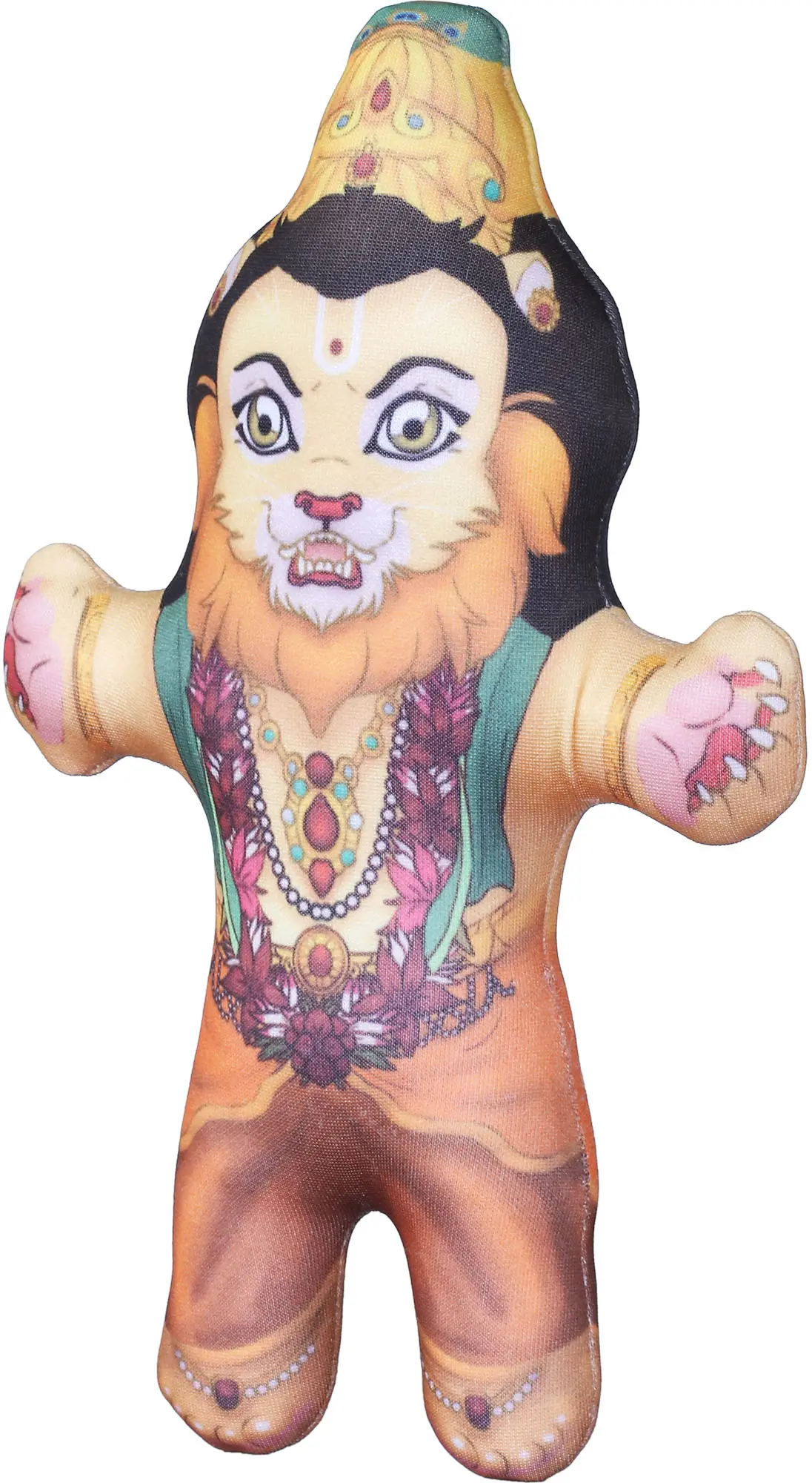Bring the fierce yet benevolent energy of Lord Narasimha into your home with this intricately designed stuffed doll. Narasimha, the half-man, half-lion avatar of Lord Vishnu, is revered as the ultimate protector of righteousness and the vanquisher of evil. This plush representation captures his divine essence, offering a unique and accessible way to connect with this powerful deity. The doll is crafted from soft, huggable material, making it perfect for children and adults alike. Its vibrant colors and detailed artwork depict Narasimha in all his glory, adorned with a majestic crown, fierce eyes, and ornate jewelry. The characteristic lion's face, complete with a flowing mane and bared fangs, signifies his immense power and courage, while the human-like body and expressive features convey his compassionate nature. The intricate patterns on his attire, including floral motifs and sparkling embellishments, speak to his divine status and the rich tapestry of Hindu mythology.