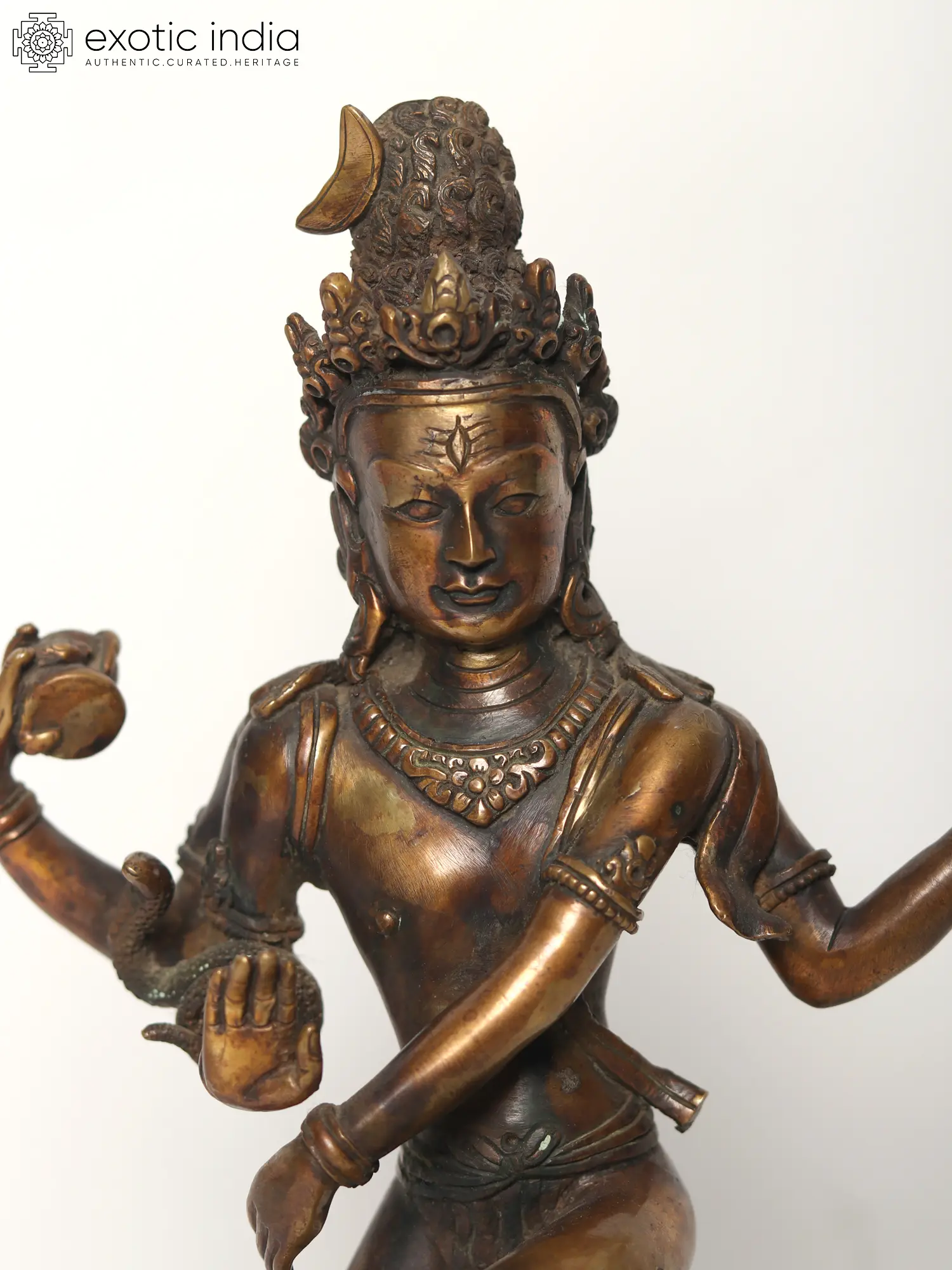 This artwork from Nepal encapsulates the profound cosmic dance of “Lord Shiva”, also known as “Nataraja”. His right foot, firmly planted upon the “dwarf Apasmara Purusha”, crushes ignorance and illusion. The “Damaru (Udukai)” in his upper hand resonates with the rhythm of creation and destruction, while the flames in his upper left hand represent “Agni”, the elemental forces shaping existence. A coiled “Cobra (Vasuki)” unfurls from his forearm, embodying transformation and renewal. His “Abhaya mudra”, a gesture of fearlessness, exudes protection.