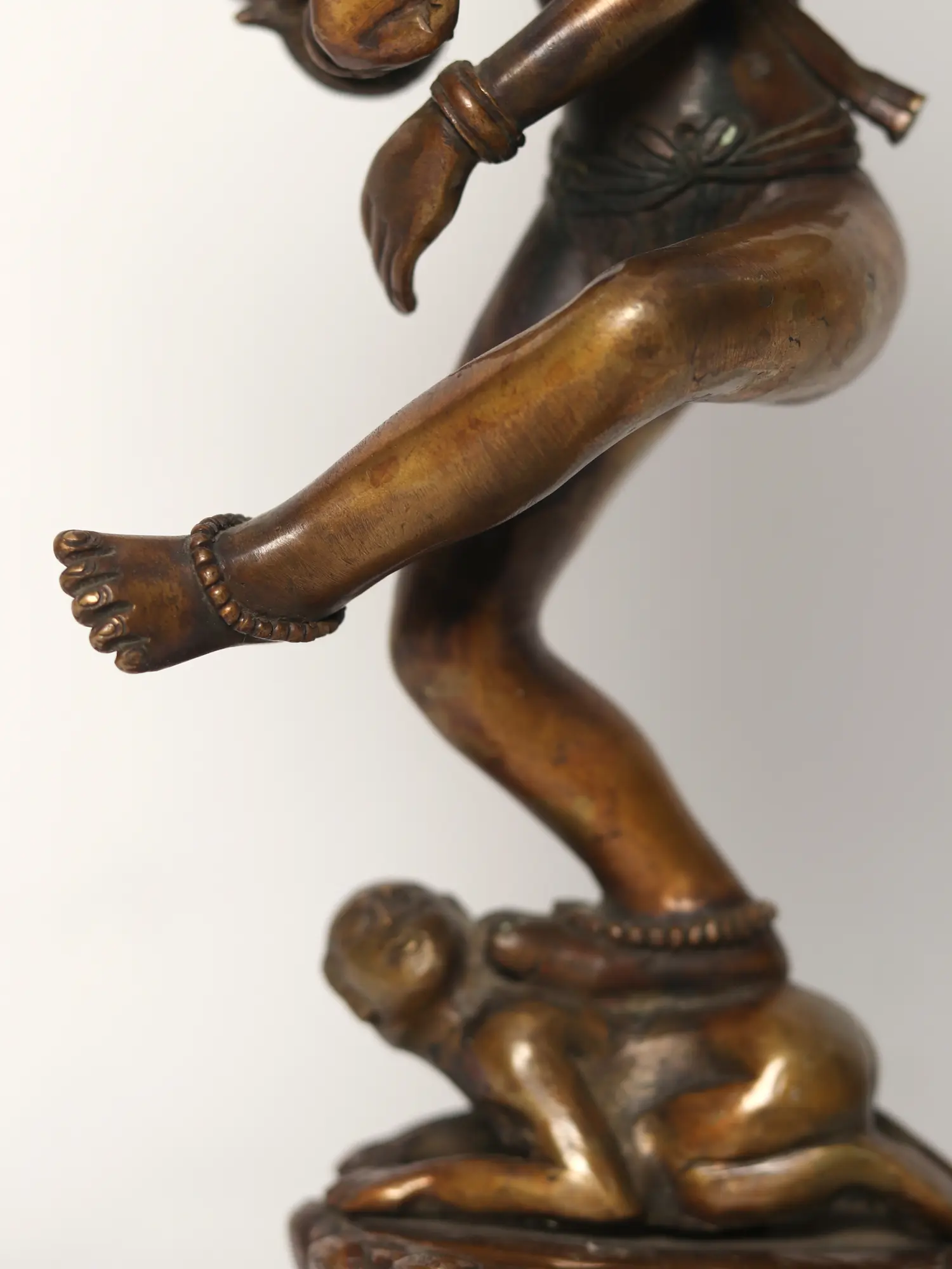 The lower left hand, crossing his chest, beckons towards his feet, offering peace and salvation. Nataraja’s left foot, held high in the “gaja hasta pose”, symbolizes liberation, inviting all to partake in the eternal cosmic dance of existence. This art piece transcends physicality, echoing the perpetual interplay of creation and destruction, urging seekers to find solace and transcendence within the intricate rhythms of the universe.