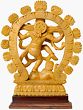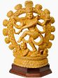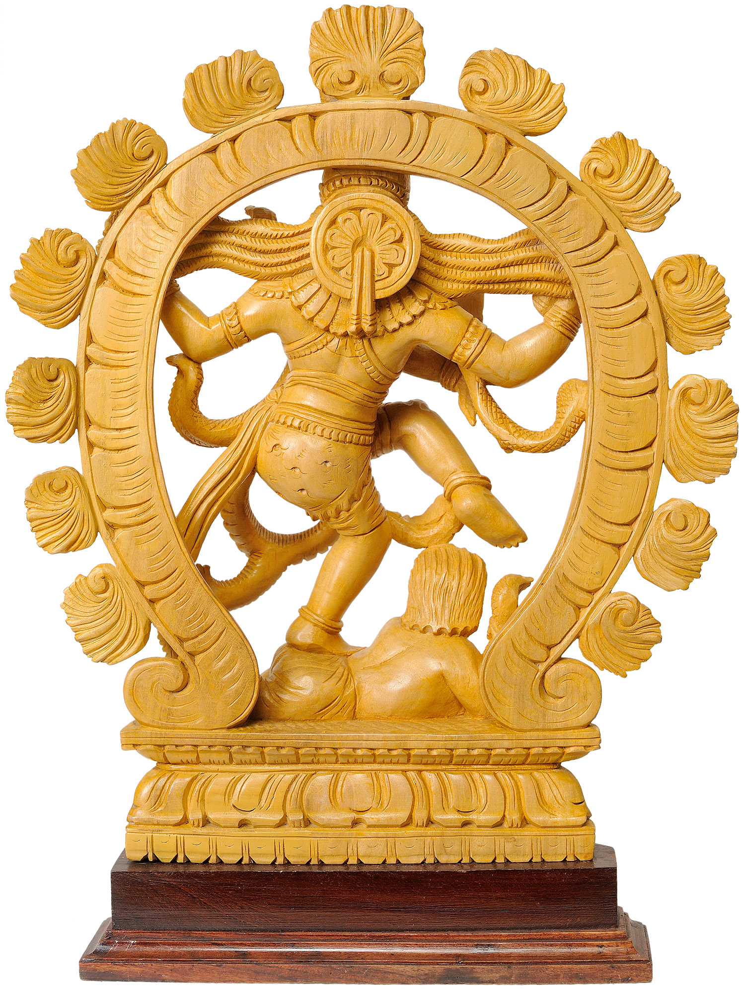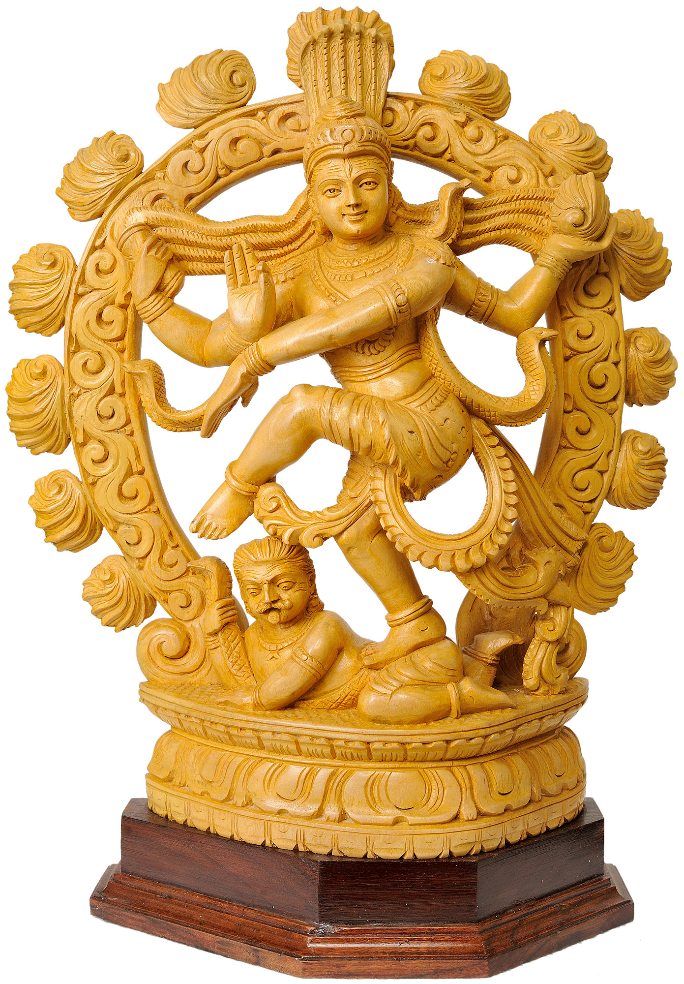 This exquisite wooden carving depicts the divine Nataraja, the Lord of Dance, a powerful and revered form of Lord Shiva. Crafted from fragrant White Cedar wood sourced from Trivandrum, this sculpture captures the essence of Shiva's eternal dance, the Tandava, which symbolizes the cosmic cycle of creation, preservation, and destruction. The artistry involved is a testament to the skill of traditional Indian craftsmen, who have meticulously brought to life the dynamism and spiritual depth of this iconic deity. The Nataraja is depicted in a powerful and balanced stance, with his right foot raised, symbolizing liberation from the cycle of birth and death. His other foot rests upon Apasmara, a dwarf-like demon representing ignorance and ego, which Shiva is crushing under his divine might. The figure is encircled by a flaming halo, the Prabhavali, representing the cosmic fire that both creates and destroys the universe. Each flame and decorative element within the halo is rendered with intricate detail, conveying the boundless energy and omnipresence of the divine.
