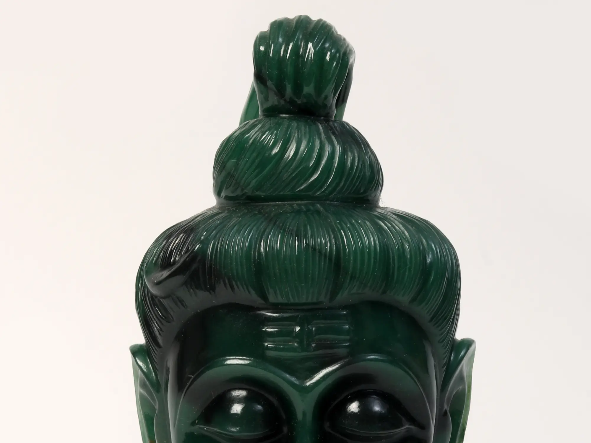 This exquisite sculpture captures the divine countenance of Lord Shiva, the destroyer and transformer, rendered in luminous natural green aventurine. The stone, renowned for its soothing energy and association with good fortune, imbues this piece with a palpable sense of peace and prosperity. Lord Shiva, a central deity in Hinduism, is often depicted with a serene yet powerful presence, embodying both asceticism and cosmic dance. His third eye, a symbol of wisdom and insight, is subtly suggested in this artistry, hinting at the profound spiritual depth he represents. The intricate detailing of his matted hair, coiled into a majestic jata, speaks of his yogic discipline and his role as the lord of ascetics. The gentle smile gracing his lips suggests a benevolent aspect, a cosmic guardian watching over creation.