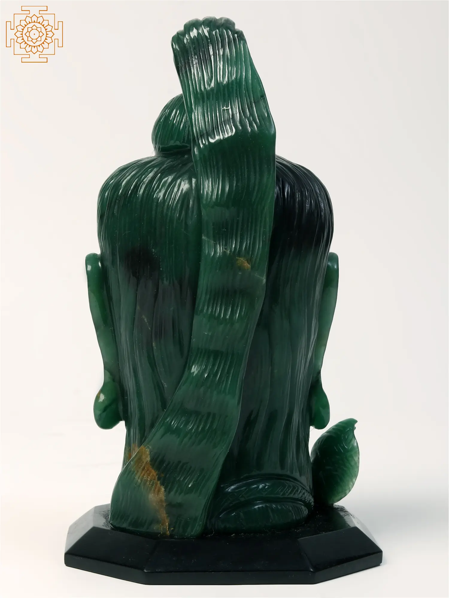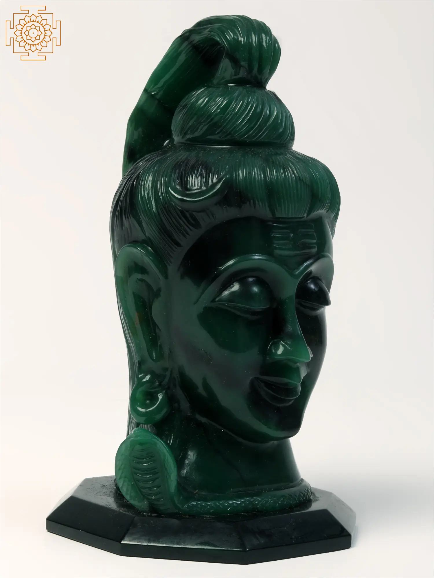 The sculptor has masterfully carved the aventurine, revealing the stone's inherent beauty and depth of color. The smooth, polished finish invites touch, while the translucent quality of the green stone allows light to play across its surface, highlighting the subtle contours of Shiva's face. The figure rests upon a base of black agate, a grounding element that complements the ethereal quality of the aventurine. Black agate is often associated with protection and stability, providing a strong foundation for the spiritual energy of the Shiva head. The form of the base itself, with its multi-faceted design, adds to the overall aesthetic appeal, drawing the eye and adding a contemporary touch to this timeless representation. The presence of a coiled serpent, a common attribute of Shiva, is artfully integrated around the base, symbolizing his mastery over primal forces and his connection to the earth.