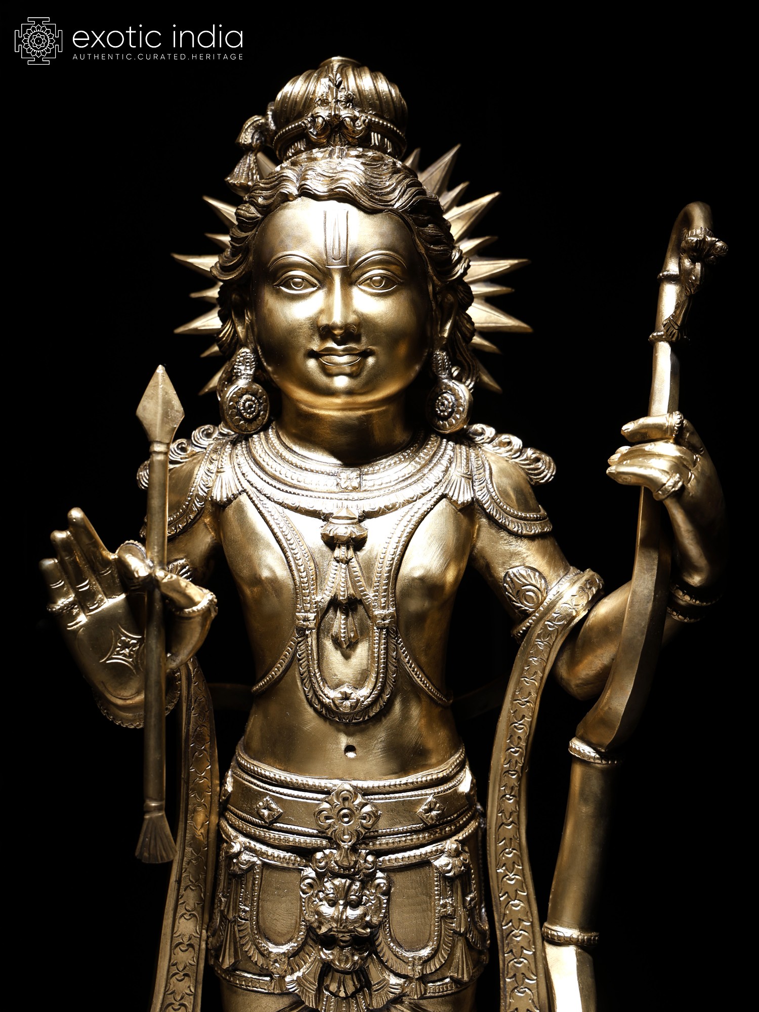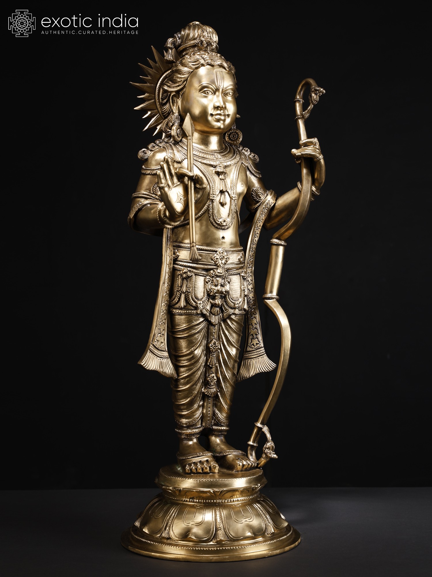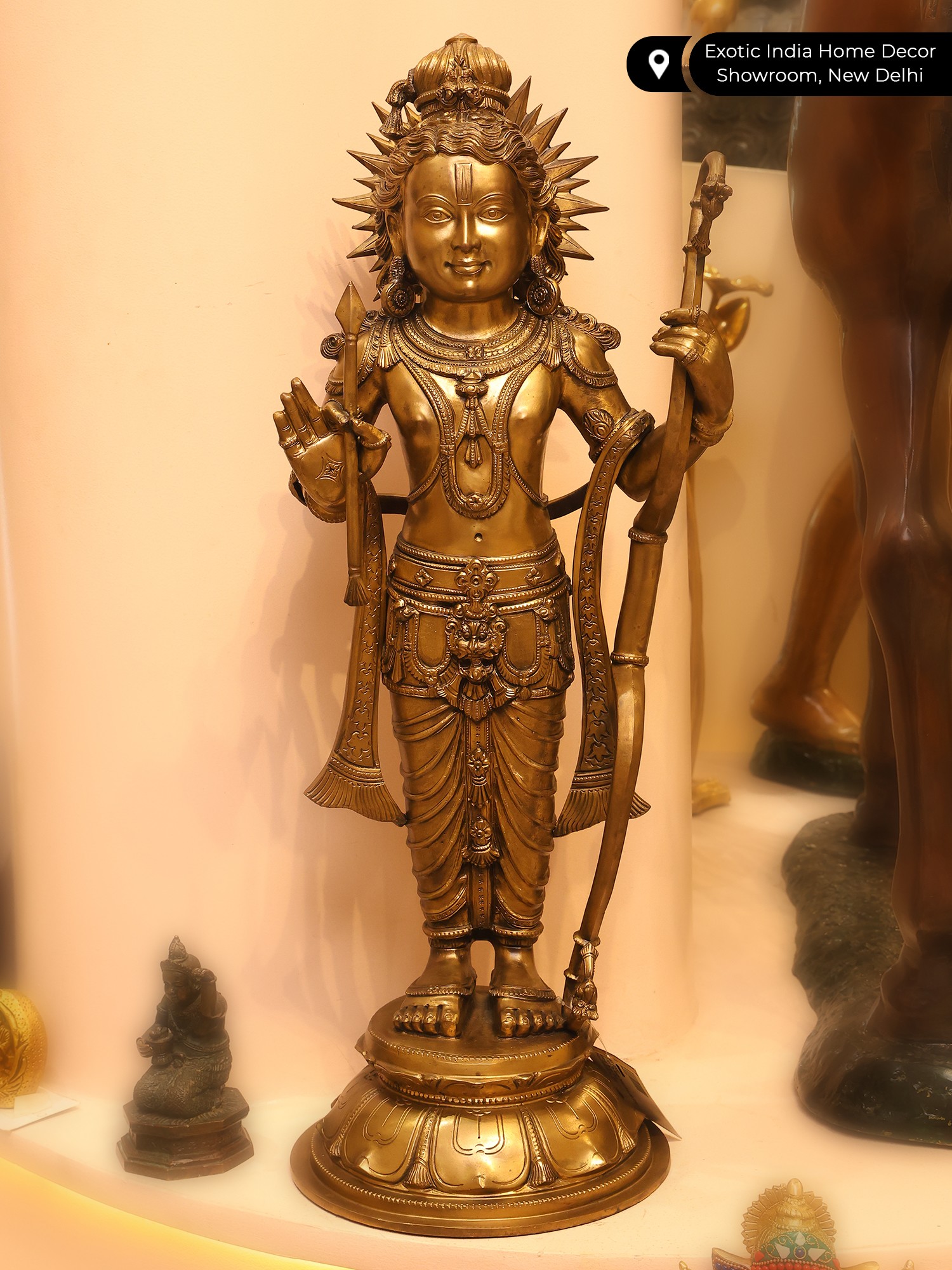In a stable poise chractersitc of Universal preserver Vishnu, Ram Lalla stands on a beautiful lotus pedestal, carrying his Sharanga bow and arrow.