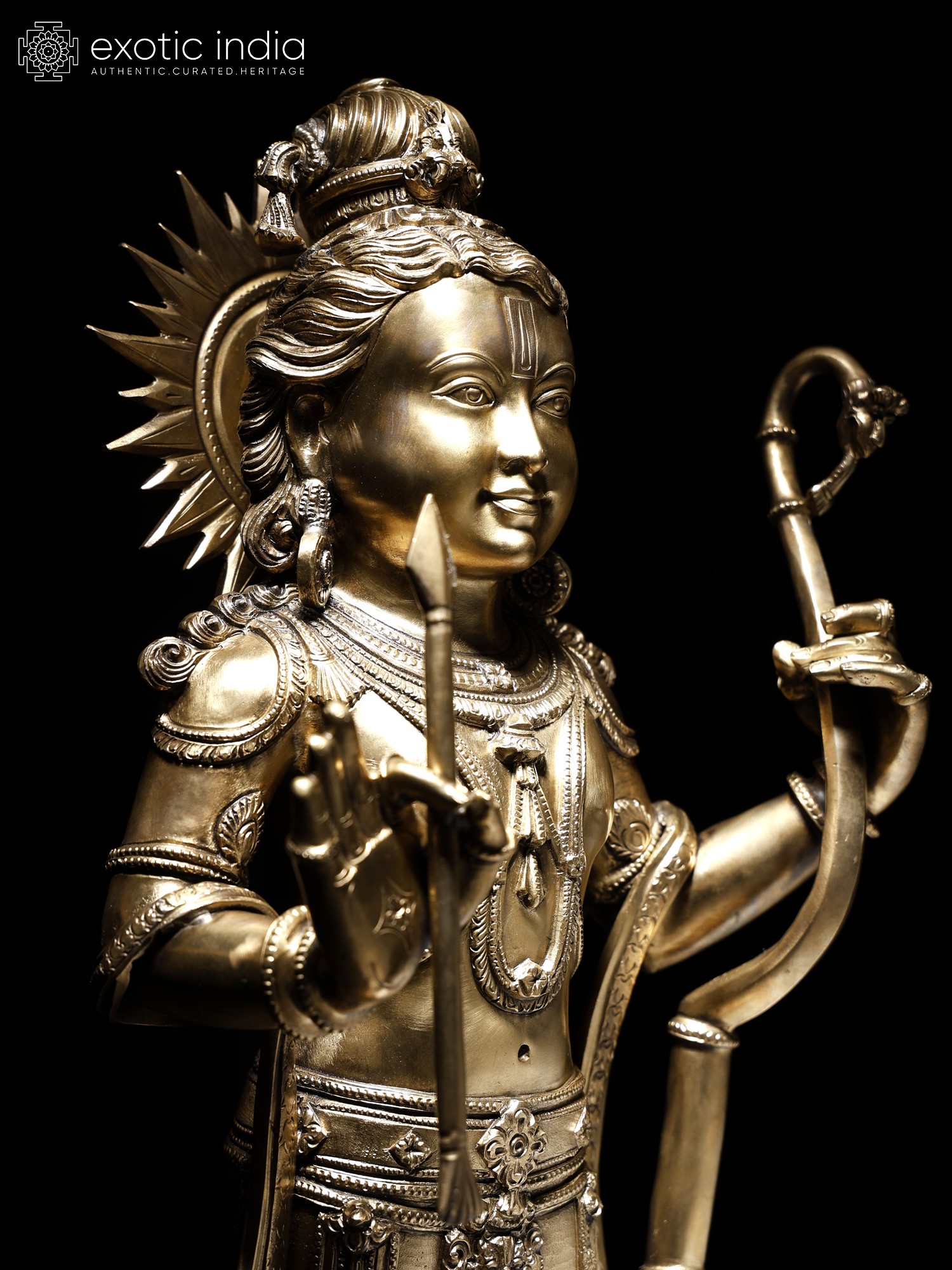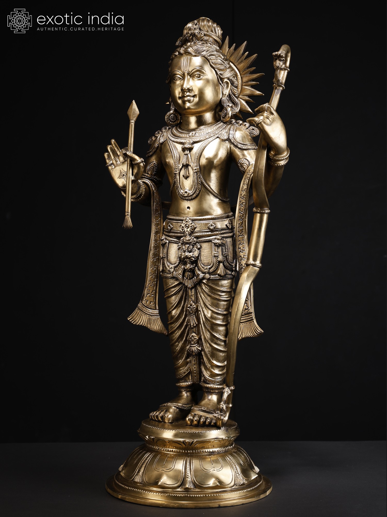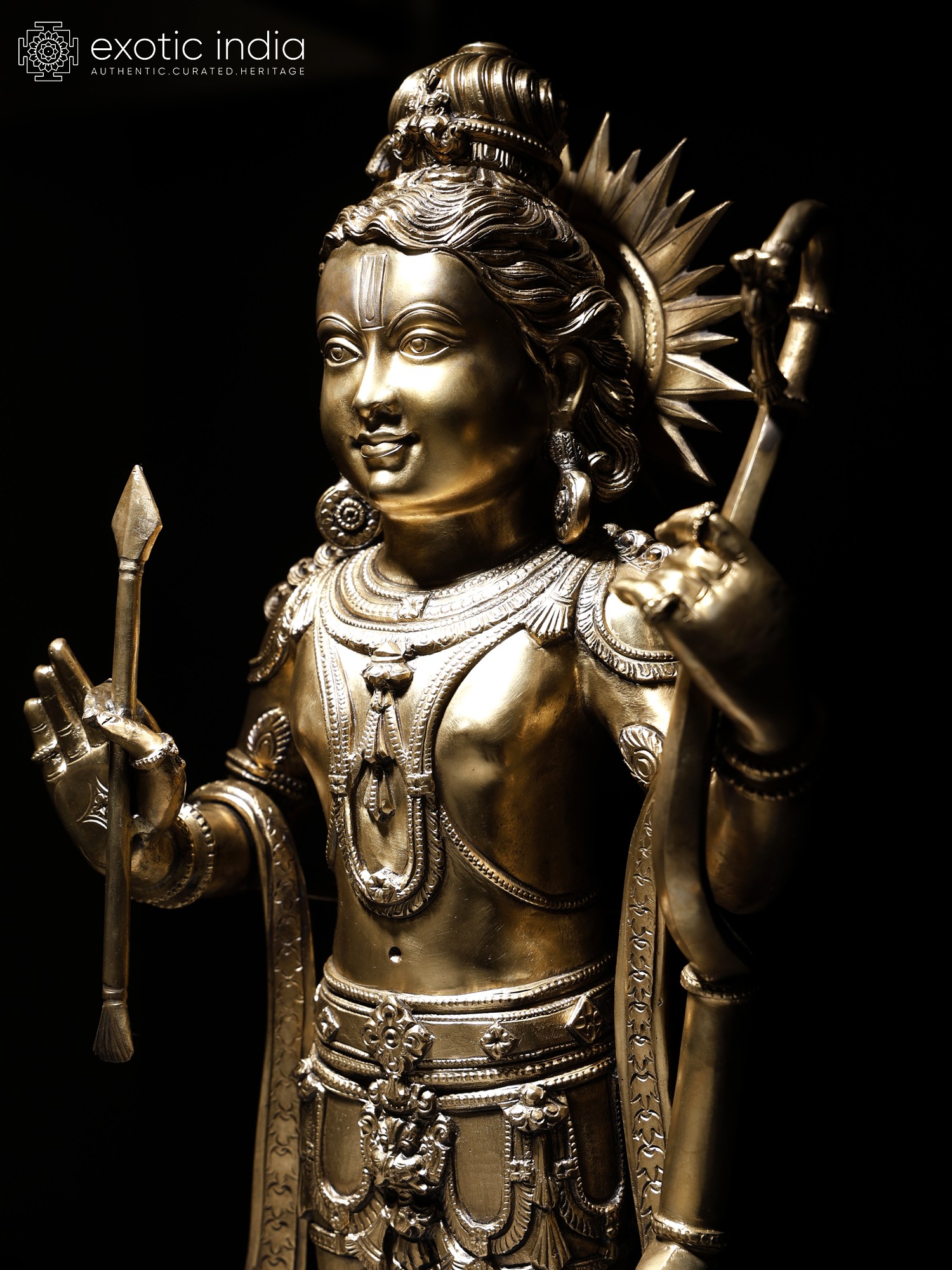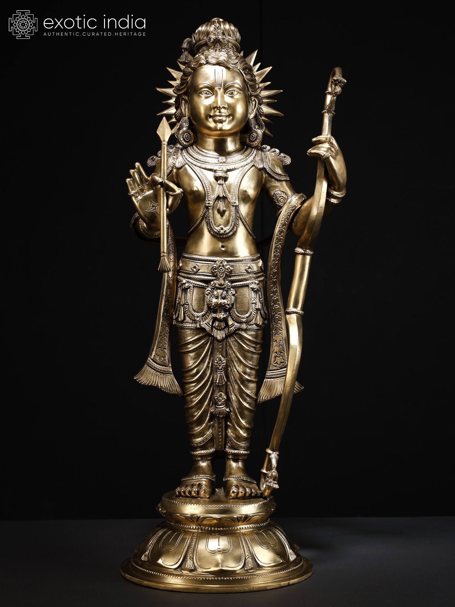 In a stable poise chractersitc of Universal preserver Vishnu, Ram Lalla stands on a beautiful lotus pedestal, carrying his Sharanga bow and arrow.