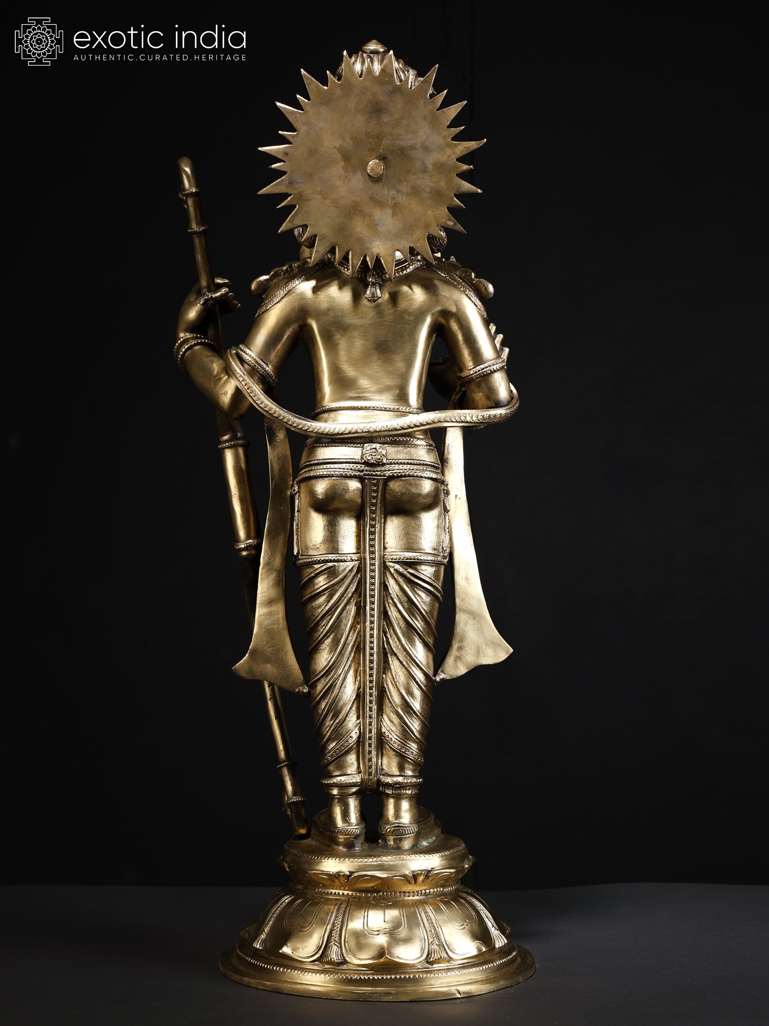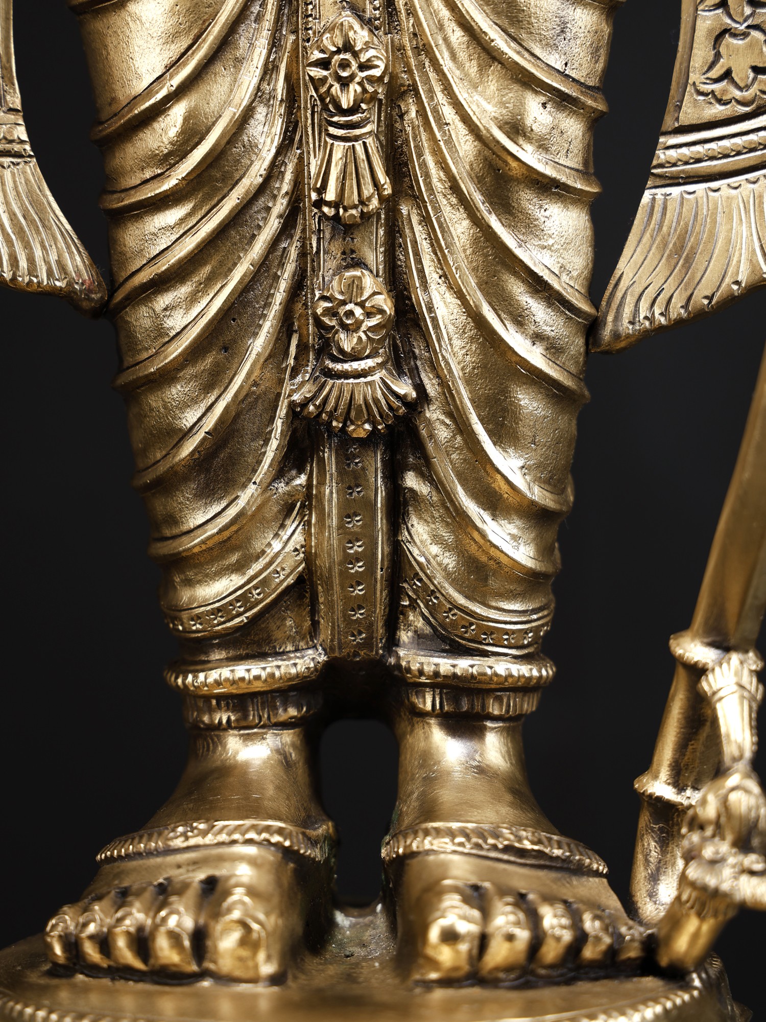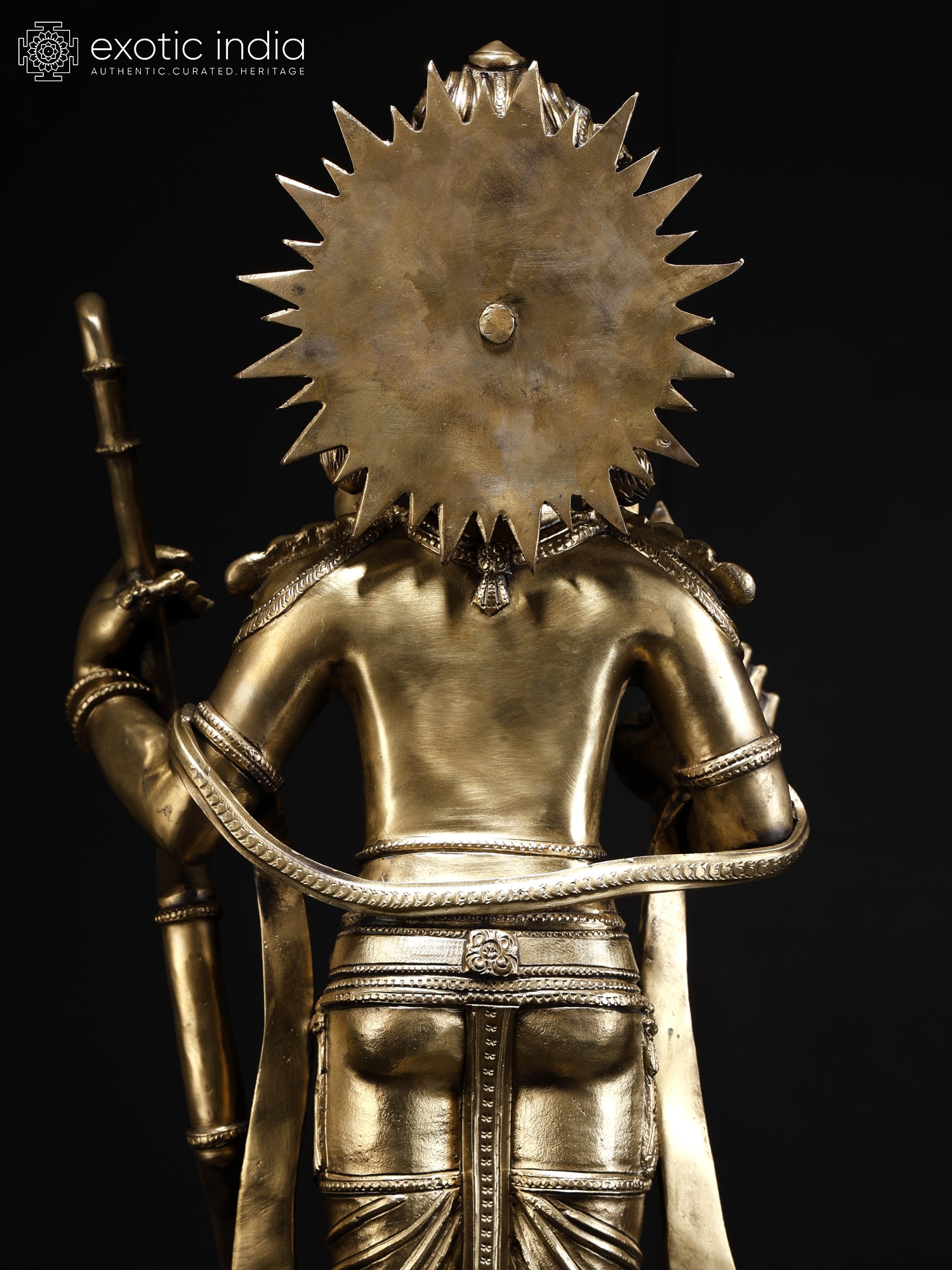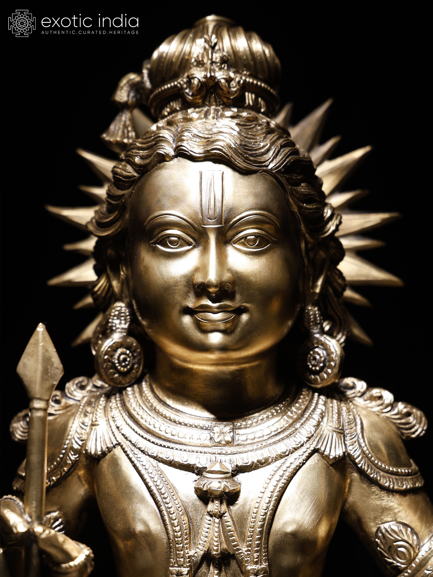 Sun becomes the halo of Ram Lalla, appearing to derive its glow from the lotus eyes of the Lord, only to have its splendor overshadowed by the tranquil smile of Ayodhyapati. Regal ornaments delineated with perfection adorn Ram. An ornate Kiritmukha crested waistband wraps around his dhoti, whose delicate crimps are realistically sculpted in bronze. The aura of the idol does not fade on the reverse, where the finesse of the artist continues to sculpt the most magnificent idol of Ram Lalla.