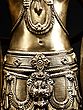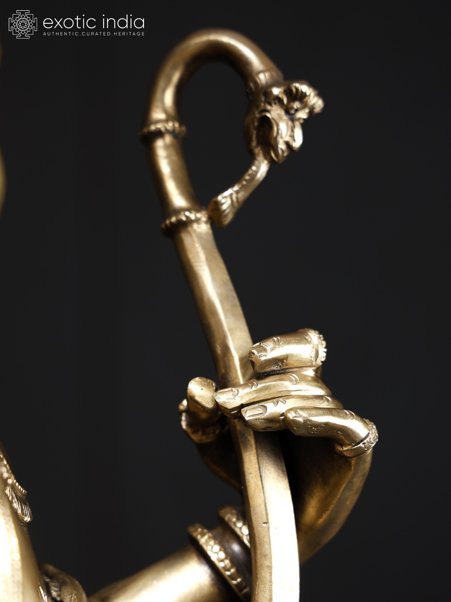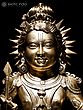 His tresses curving like the waves of Sarayu, falling on his powerful shoulders, are held in a hairdo, adorned with the Kirtimukha or face of glory, an emblem that adorns Hindu temples.