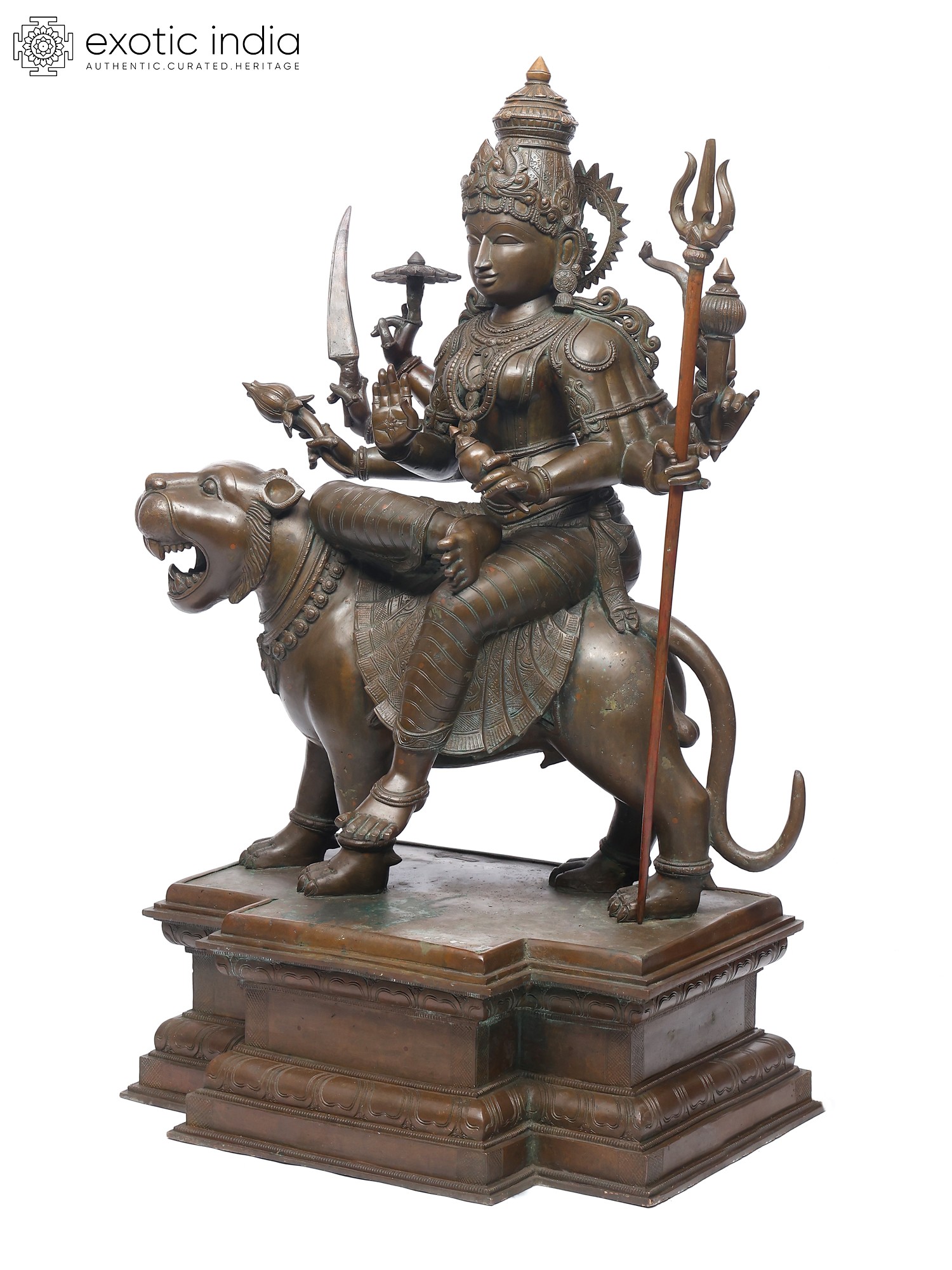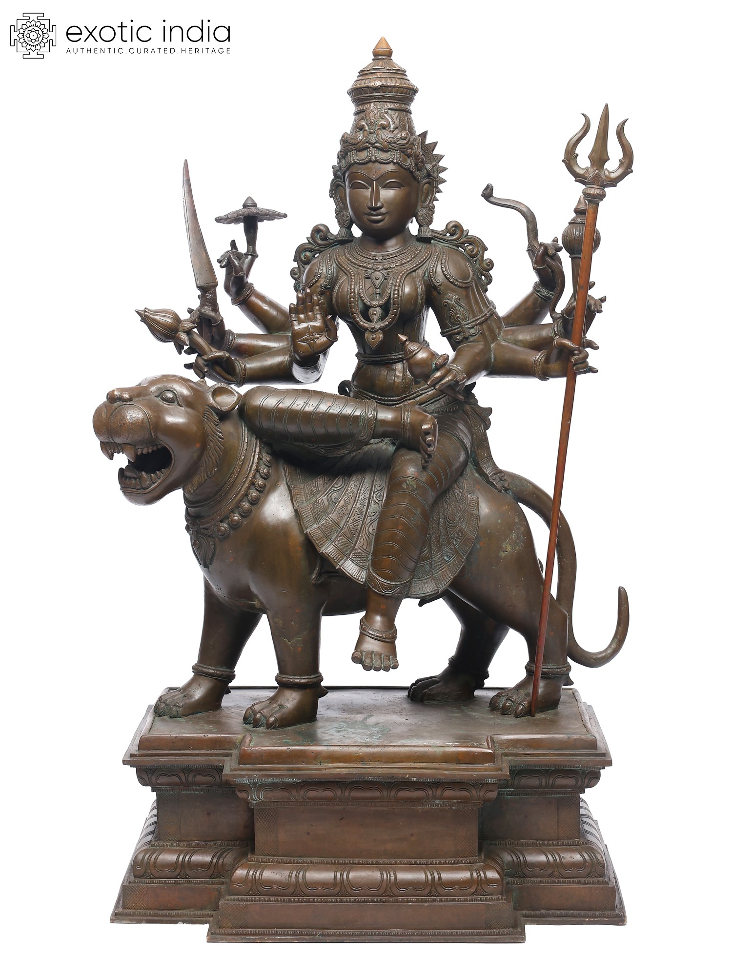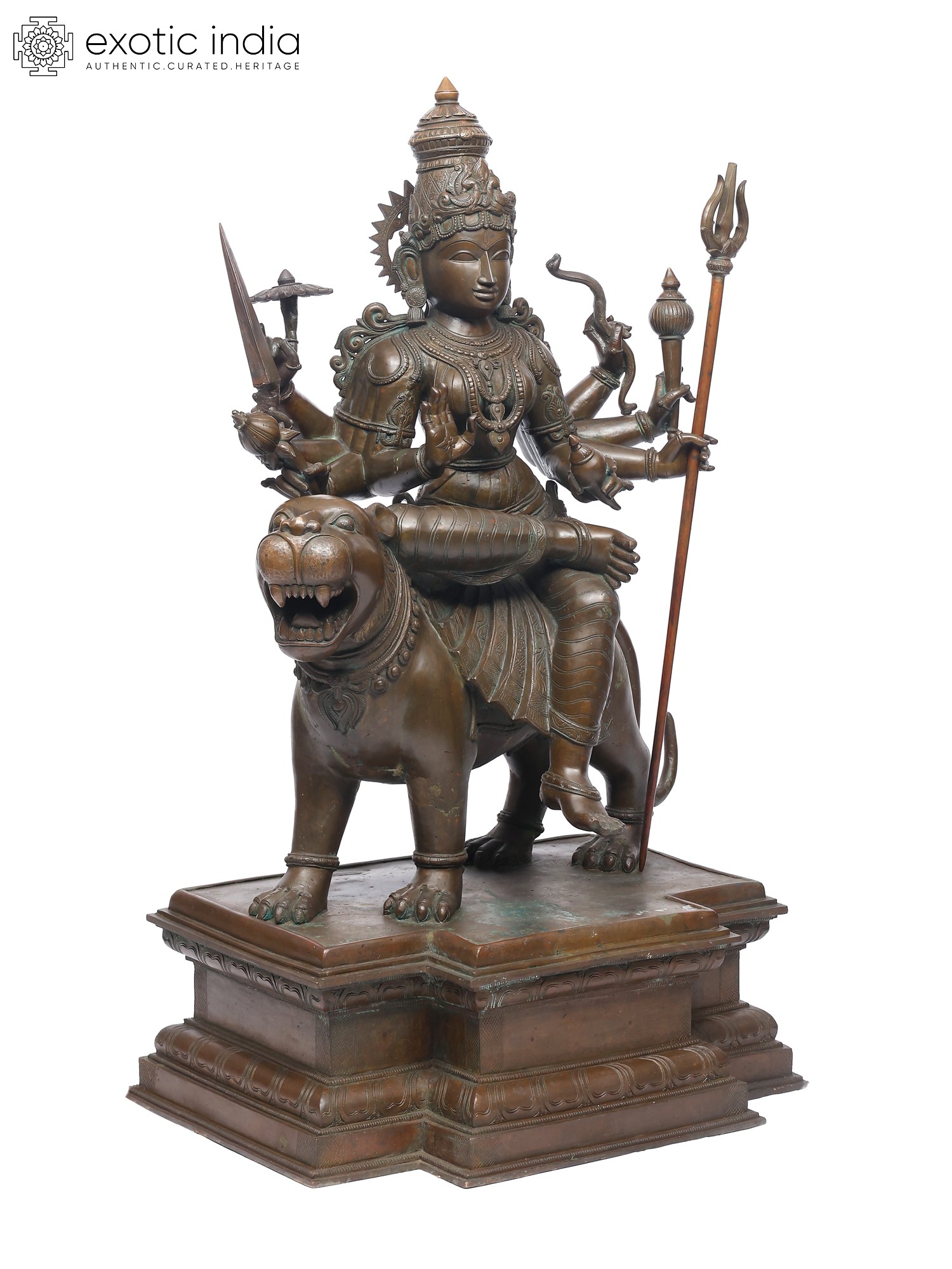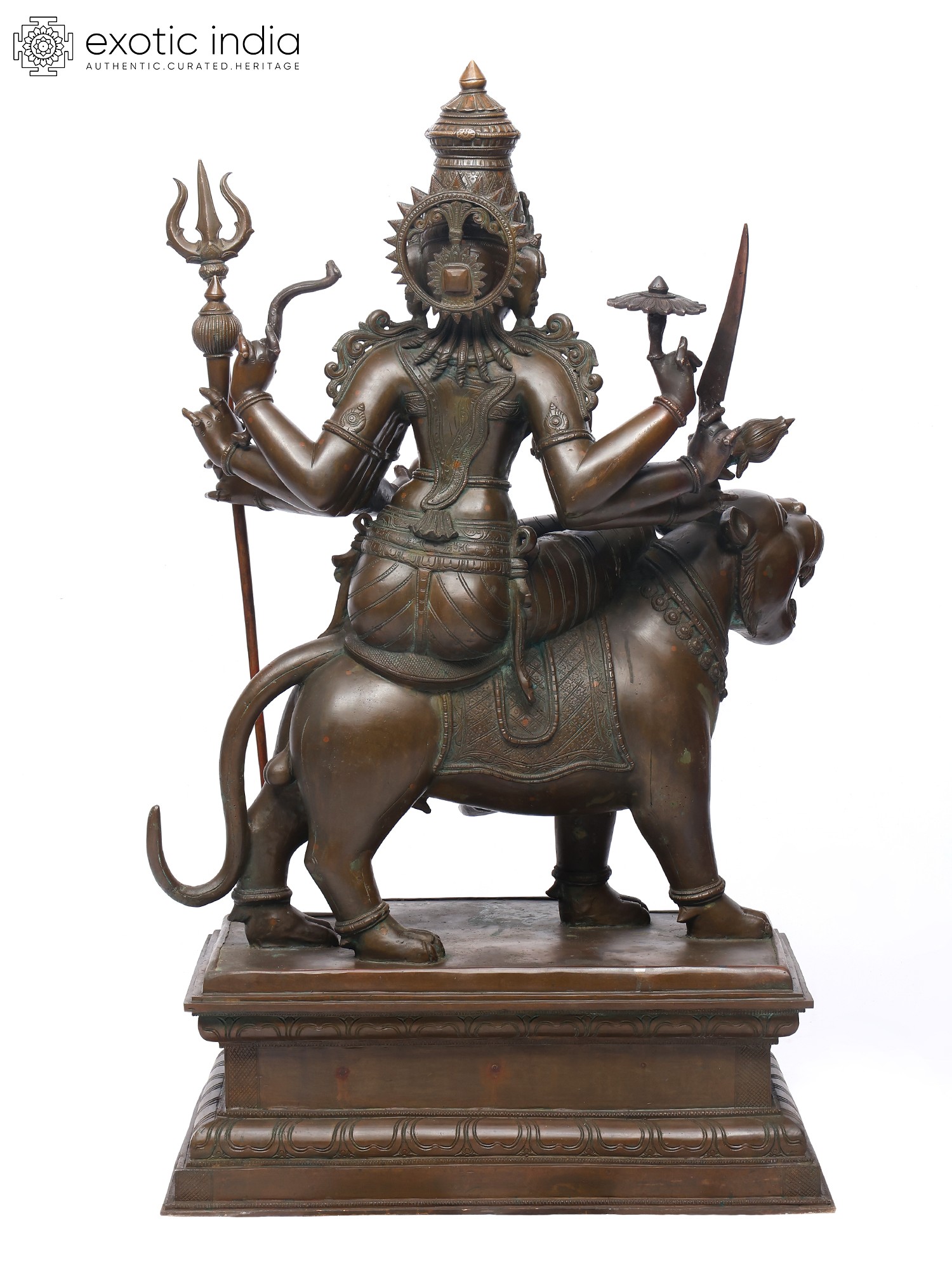 Set upon an elaborate pedestal, this bronze sculpture is a perfect coming together of the ferocious and the feminine that is Durga.
