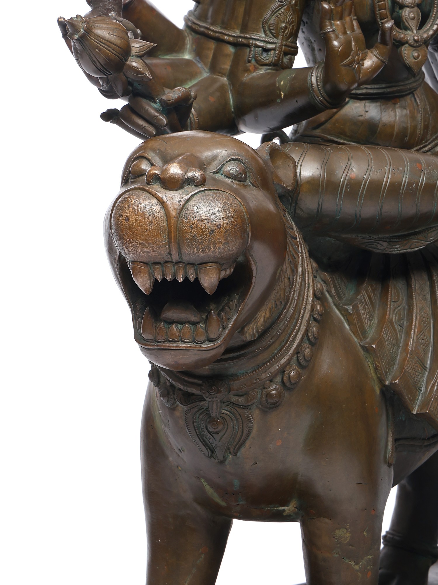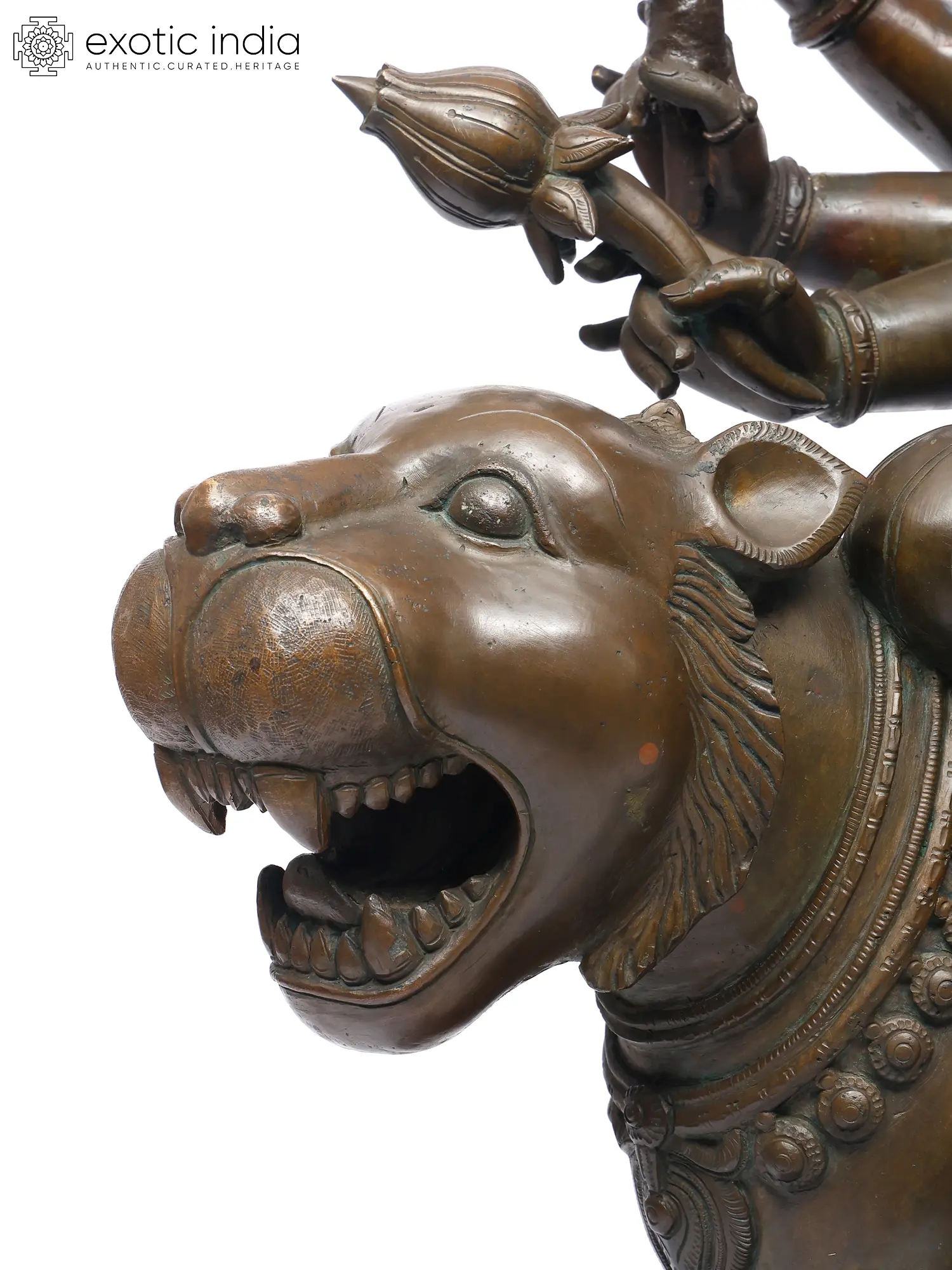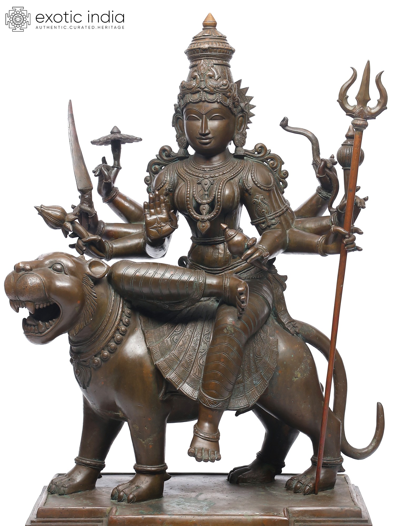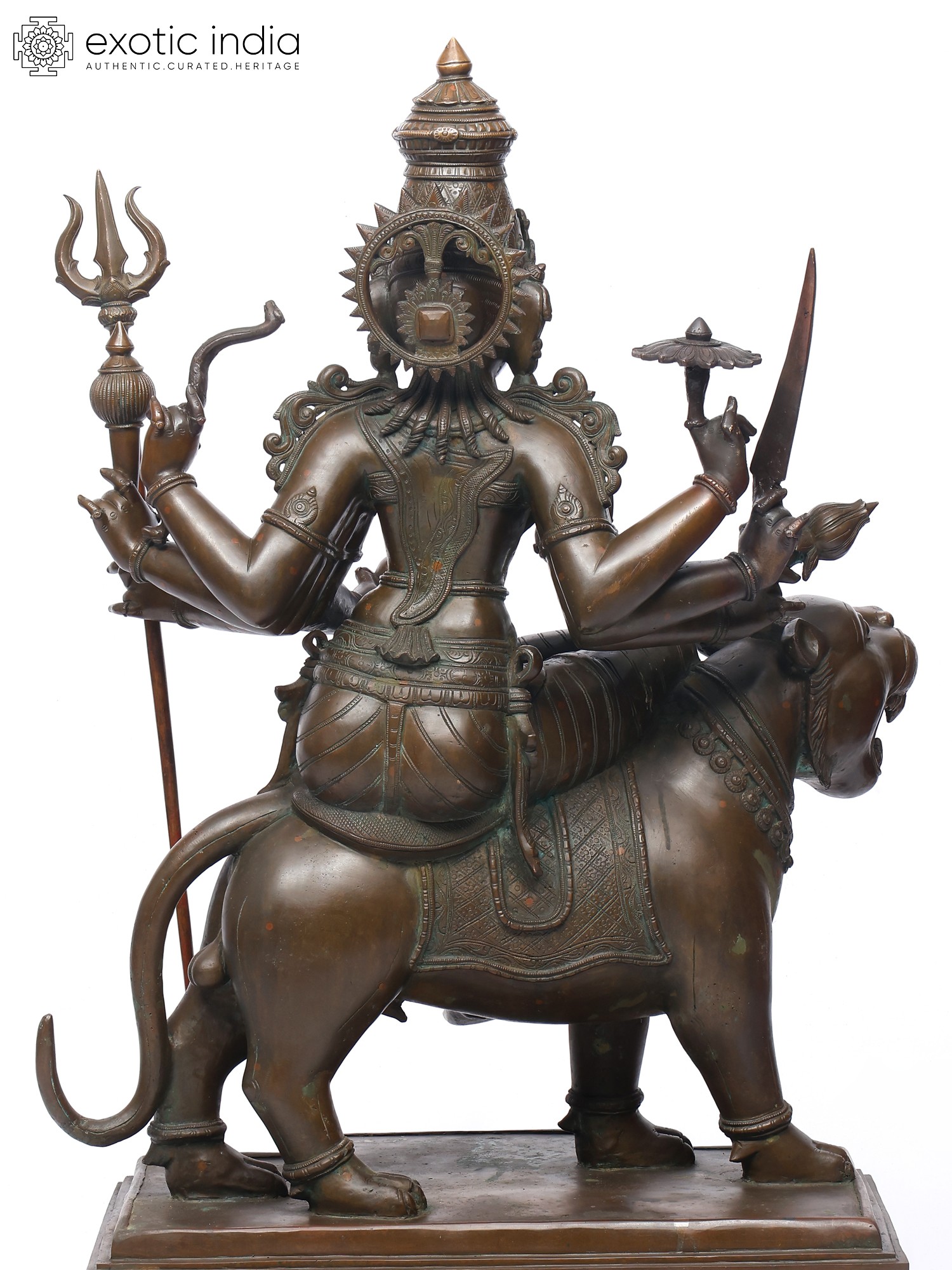Her lion mount, alert and roaring, mirrors her energy- ferocity made sacred. The polished bronze highlights every fine carving: the delicate ornaments, the supple limbs, and the subtle sheen of the goddess’s form.