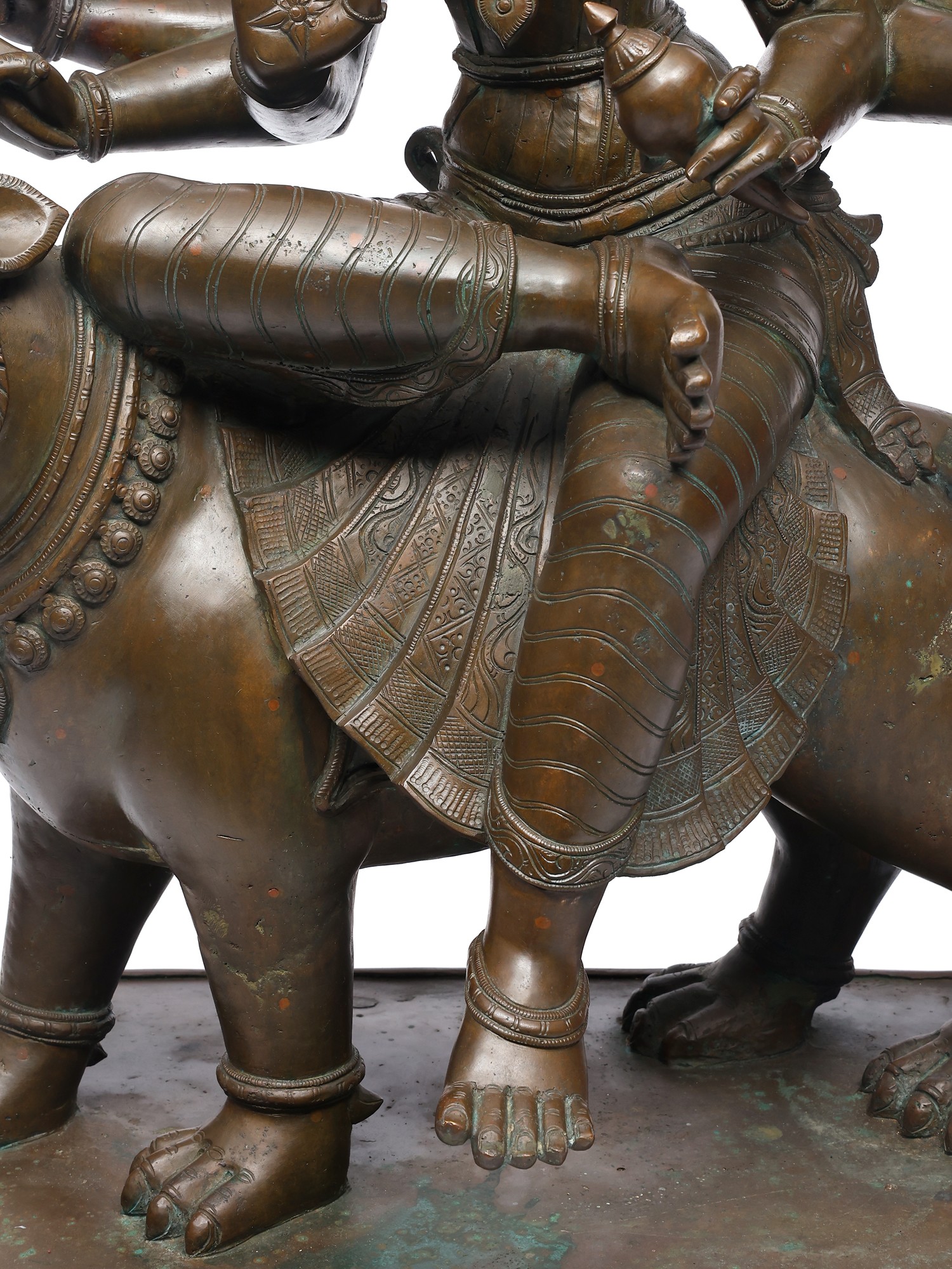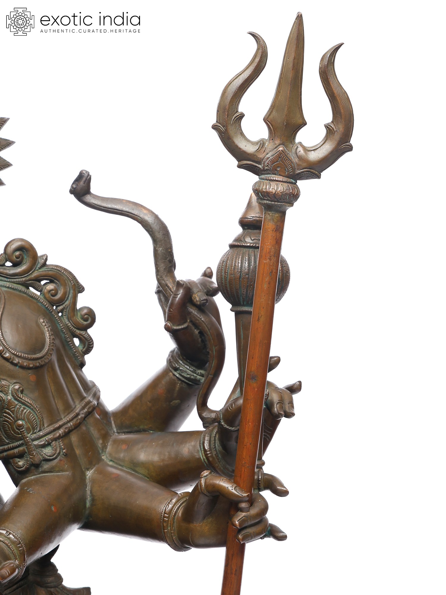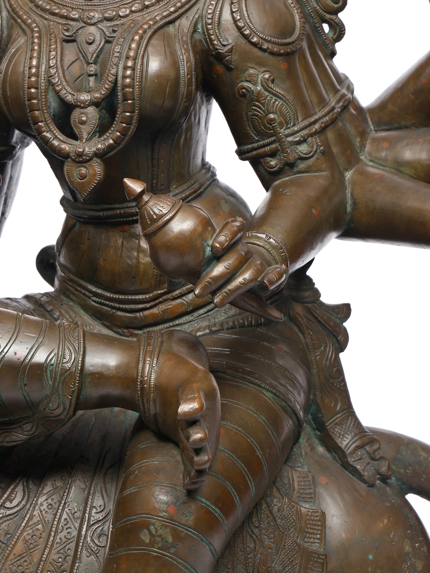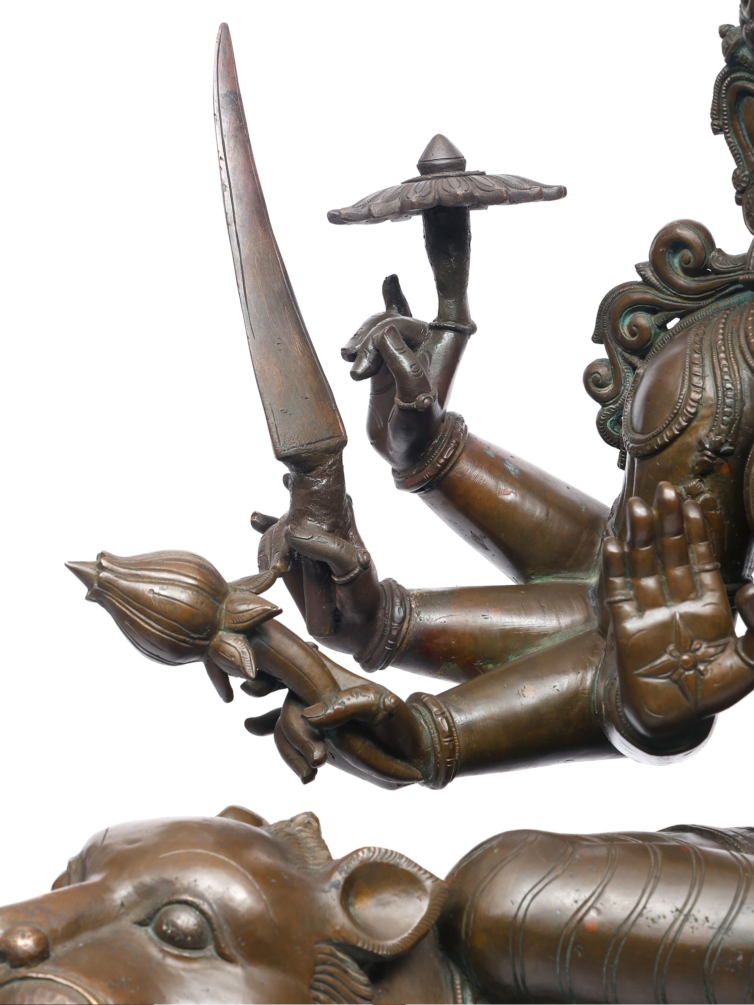 Her lion mount, alert and roaring, mirrors her energy- ferocity made sacred. The polished bronze highlights every fine carving: the delicate ornaments, the supple limbs, and the subtle sheen of the goddess’s form.