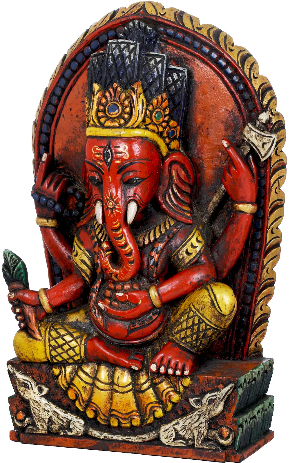 The chaturbhuja Ganesha holds laddoos (his favorite sweet) and radish, as he is fond of it, in his front hands; rosary and axe in his rear hands. He wears a yellow and blue colored crown with a blend of ancient and modern arts and patterns. The three heavy eyes (third eye on forehead) symbolize his sharp vision and the trunk sculpted in a valampuri pose eats the laddoo in full grace. Fat bellied, orange Ganesha has a snake hung on his neck as a mark of his patronage and the yellow dhoti spread in honor with the stole, complement the various shades of orange in the sculpture. Big ears are pictured stylistically with fine lines and white tusks give a life like appearance.