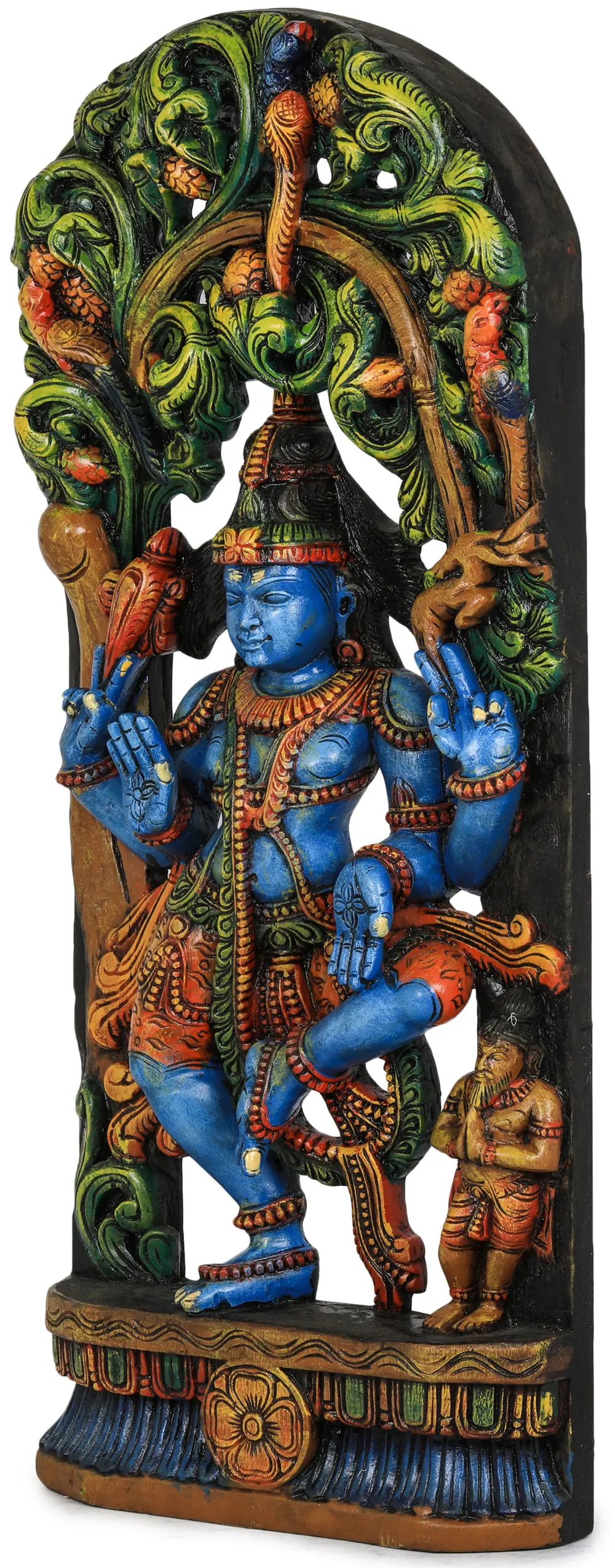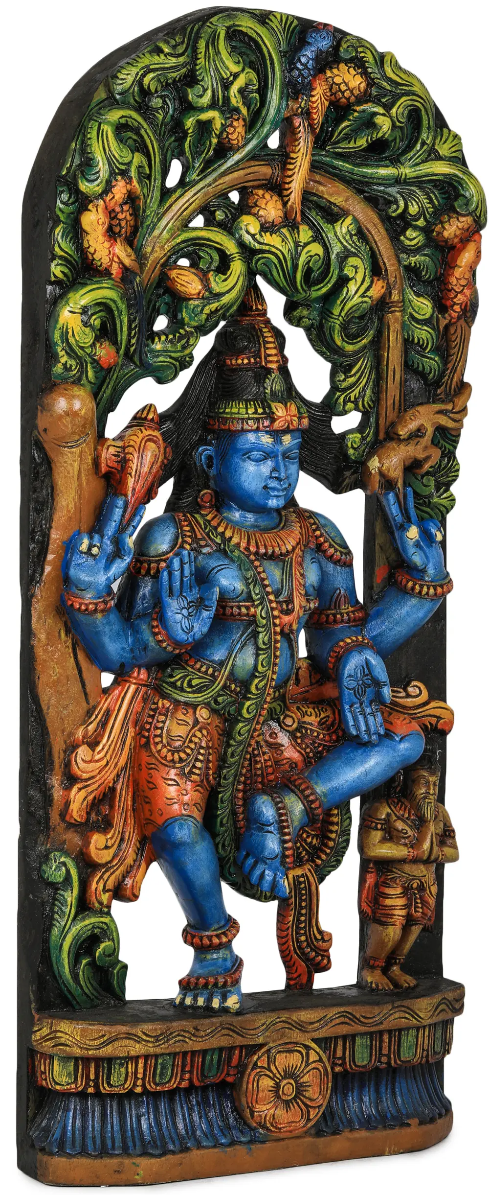 Experience the cosmic energy of Lord Shiva in his awe-inspiring form as Nilambar Pashupatinath, the Lord of Animals, depicted in a vibrant and dynamic dance. This exquisite South Indian temple wood carving captures the essence of Shiva's eternal Tandava, the dance of creation and destruction, set within a lush grove teeming with life. The rich blue hue of Shiva's skin, representing the divine and the infinite, draws the eye, while the intricate details of his adornments speak of his celestial power and grace.