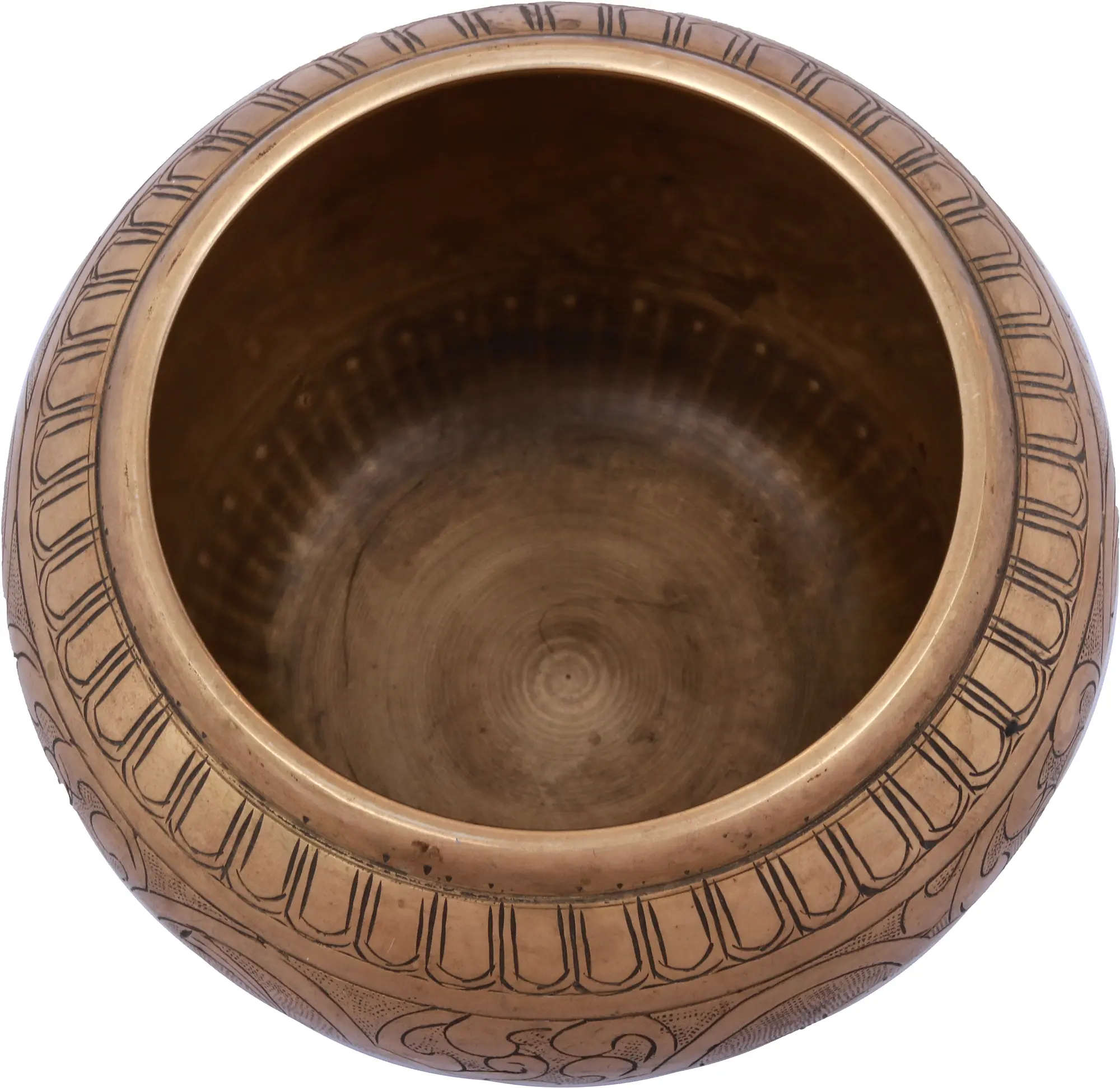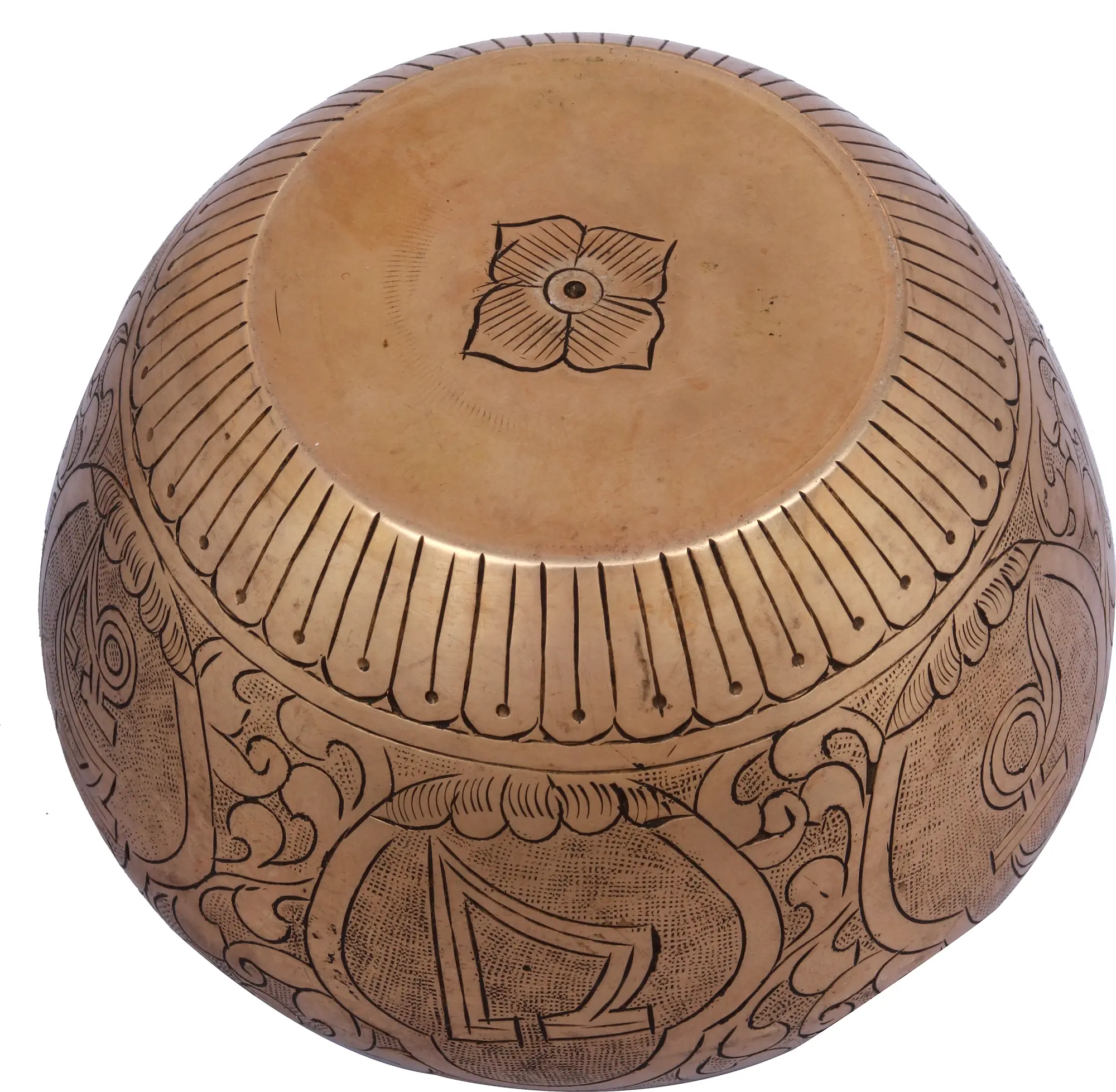 The craftsmanship of this bowl speaks volumes about the dedication and skill of Nepalese artisans. The brass has been expertly worked, resulting in a sturdy yet elegant form. The detailed engravings, including the stylized lotus petals encircling the rim and the flowing decorative patterns, showcase a deep understanding of traditional aesthetics. These patterns often symbolize the unfolding of consciousness, much like the petals of a lotus flower opening to reveal its purity. The sacred "Om Mani Padme Hum" syllable is rendered with meticulous precision, a testament to its importance and the reverence with which it is treated. This bowl is a testament to the cultural richness and artistic heritage of Nepal, a land where spirituality and artistry are deeply intertwined. It is a piece that will not only enhance your sacred space but also serve as a source of inspiration and contemplation.