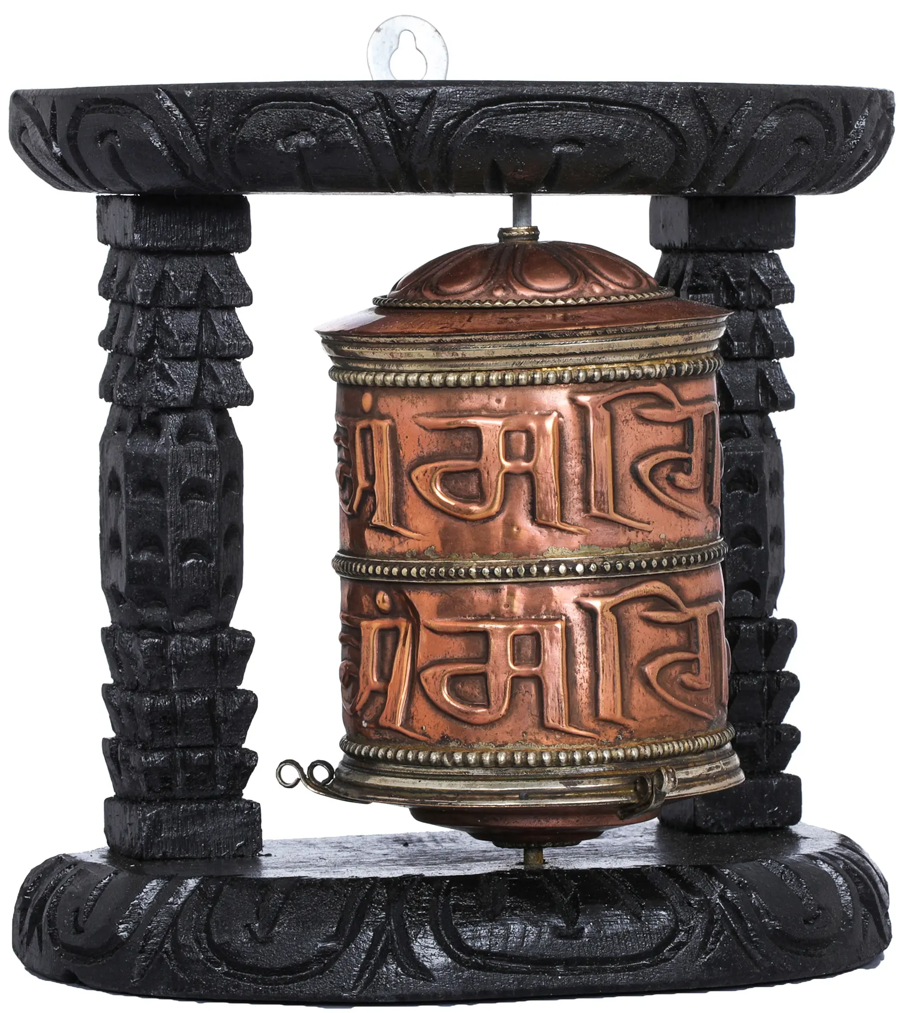 The cylindrical body of the prayer wheel is fashioned from resilient copper, adorned with the deeply carved Tibetan letters. This metal choice is not accidental; copper has been historically valued in many cultures for its perceived purifying properties and its ability to conduct positive energy. The copper cylinder is embraced by a dark, intricately carved wooden stand. The wood has been shaped with detailed patterns, featuring stacked geometric forms on the pillars and flowing designs on the base, hinting at the rich artistic heritage of the Himalayan region. This harmonious blend of materials not only creates a visually striking piece but also signifies the integration of the material and spiritual realms.