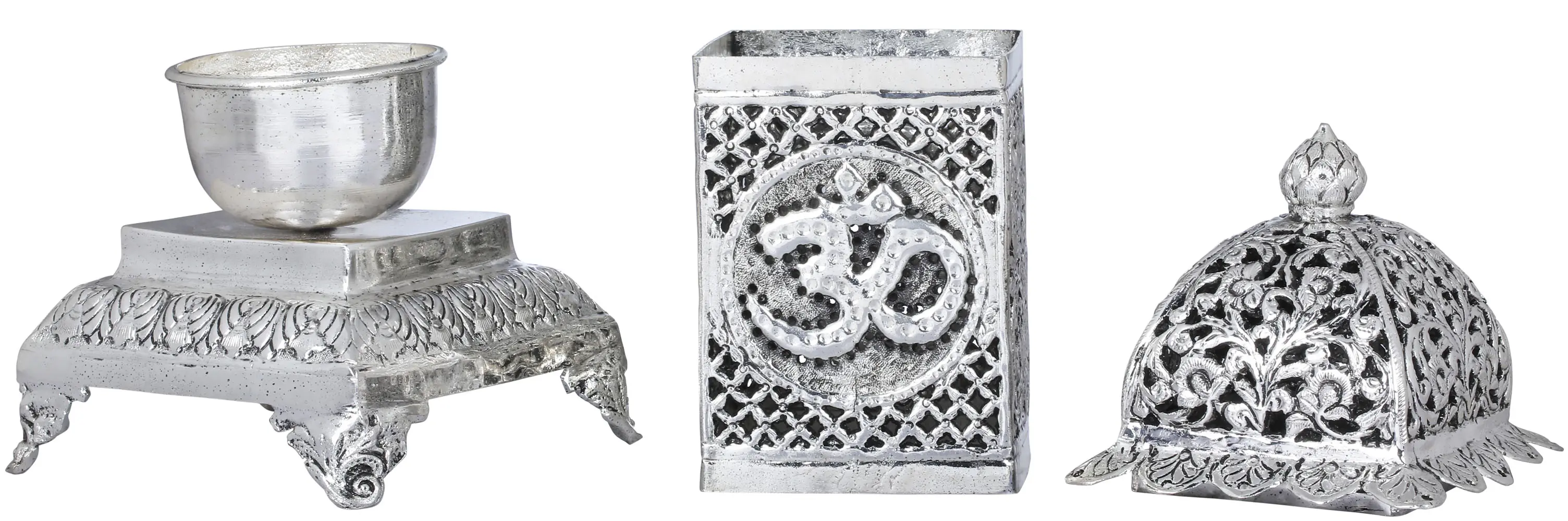 This light, which is similar to the Vrindavan light, has been used for a long period. It is lighted and put near the Tulsi tree in the evening, just after darkness falls. This lamp is made up of three parts: the high dome, the middle Jaal-decorated cover, and the lower oil basin and support. These components are easily removable and cleanable. When lighted at night, the lamp is incredibly lovely, with a reflection of the jaal on the exterior and a strong picture of Om.