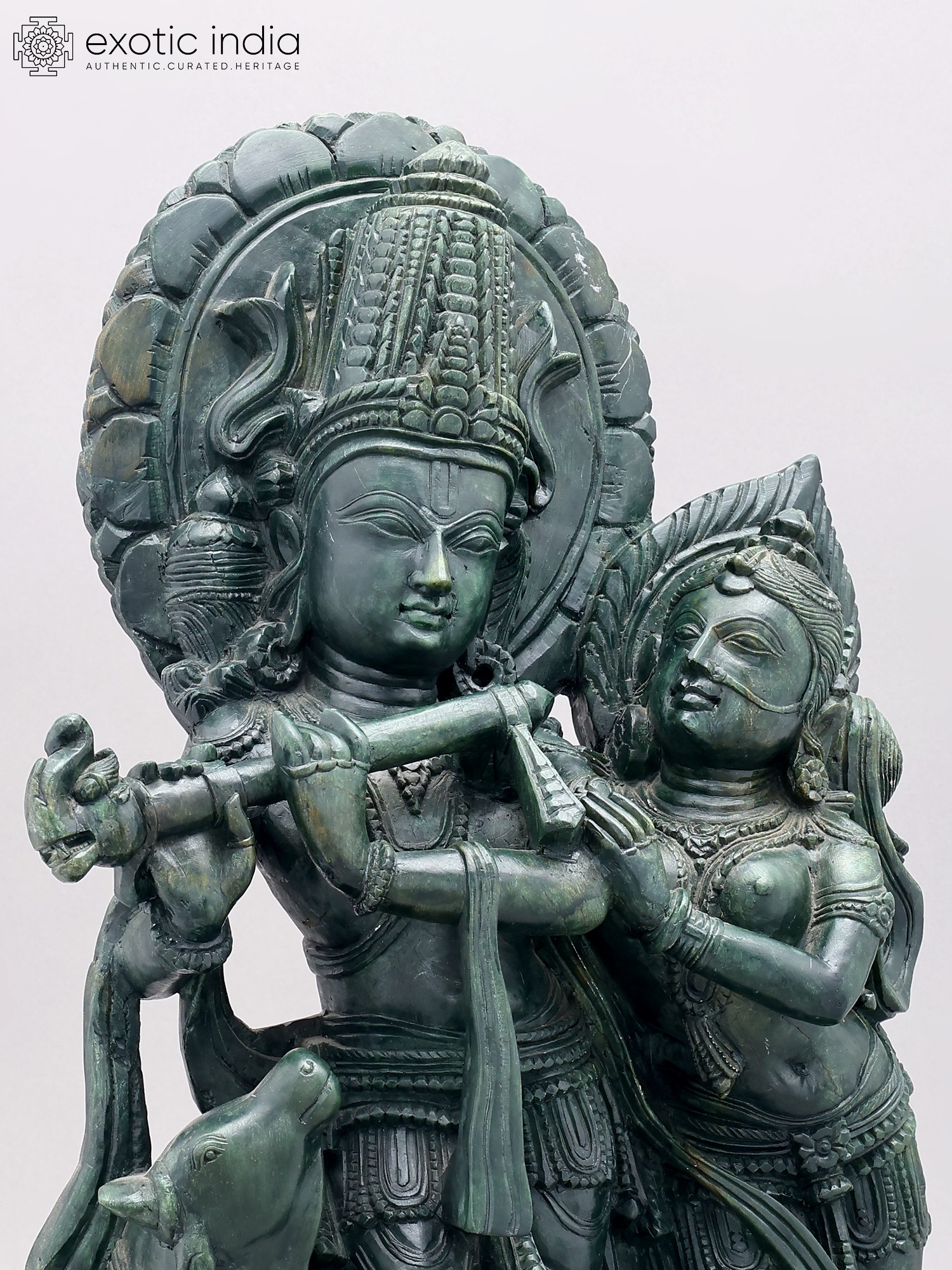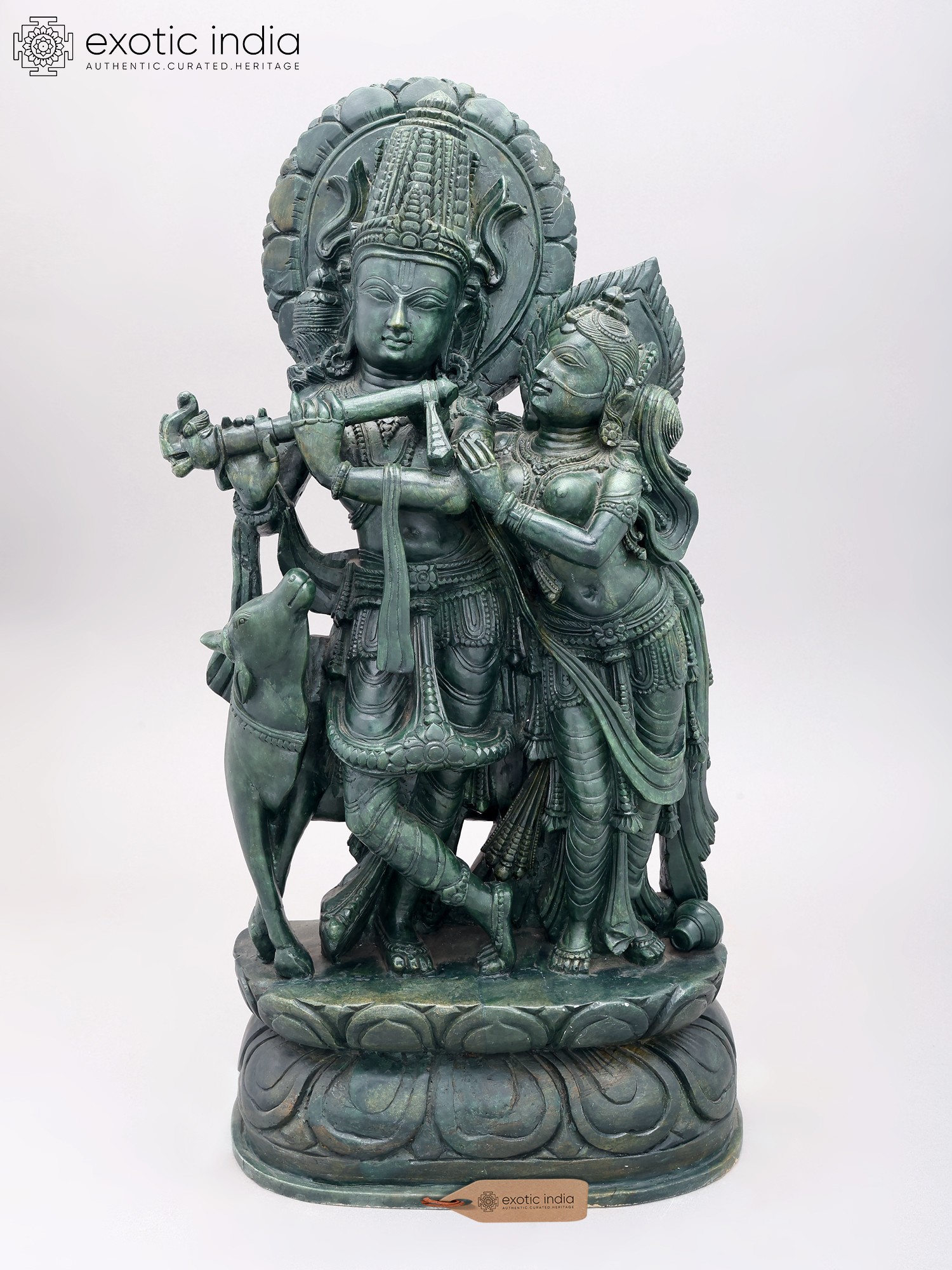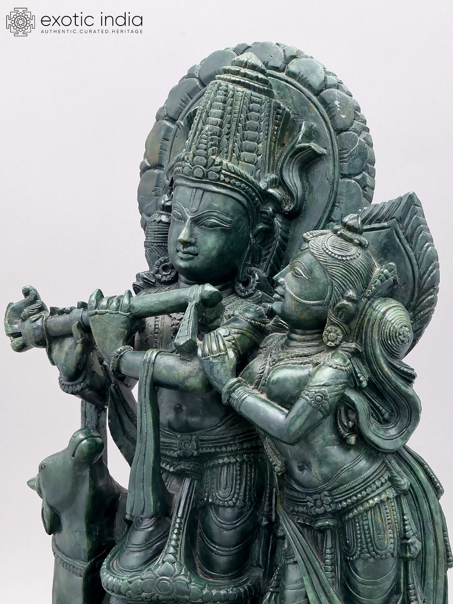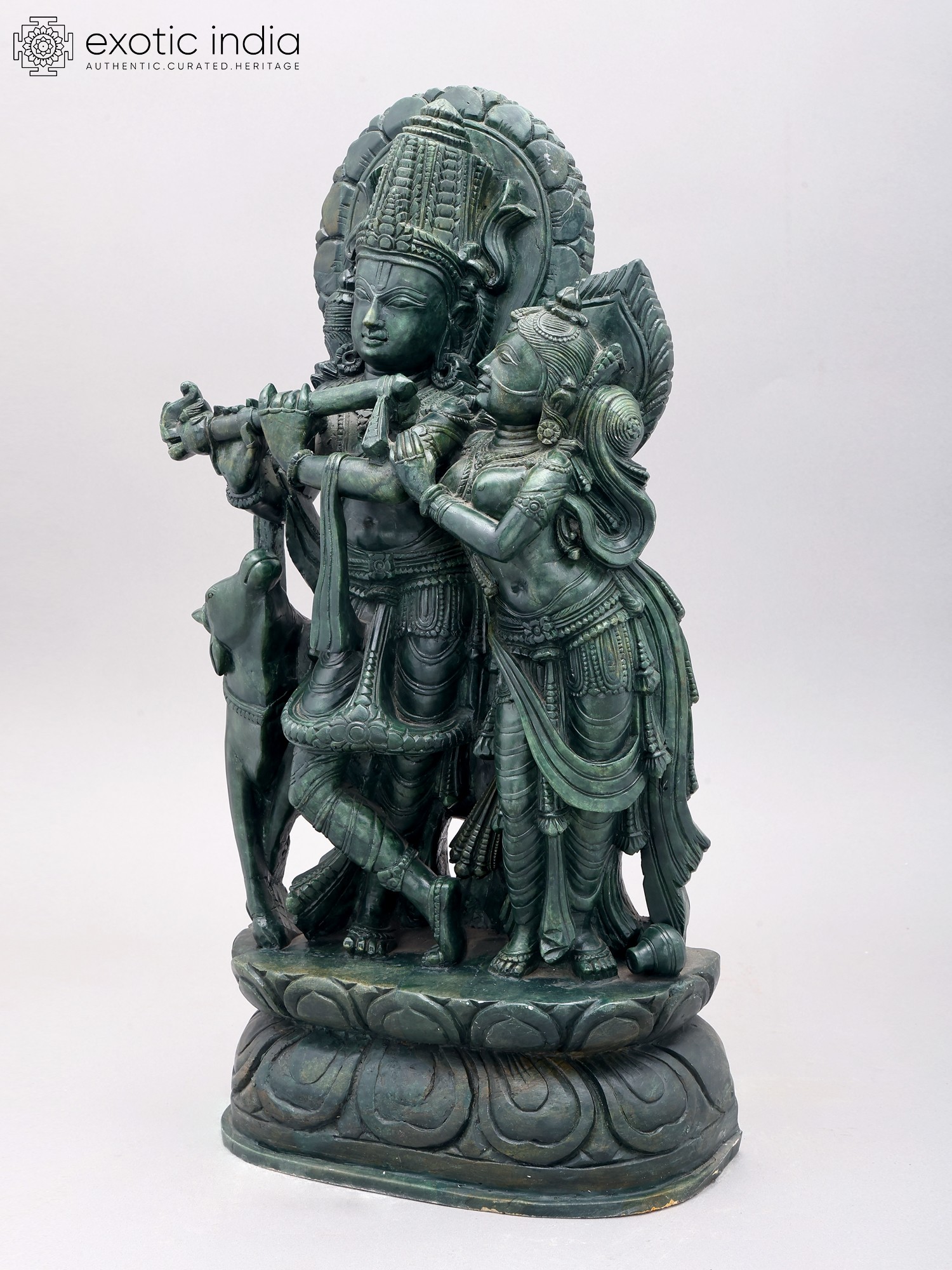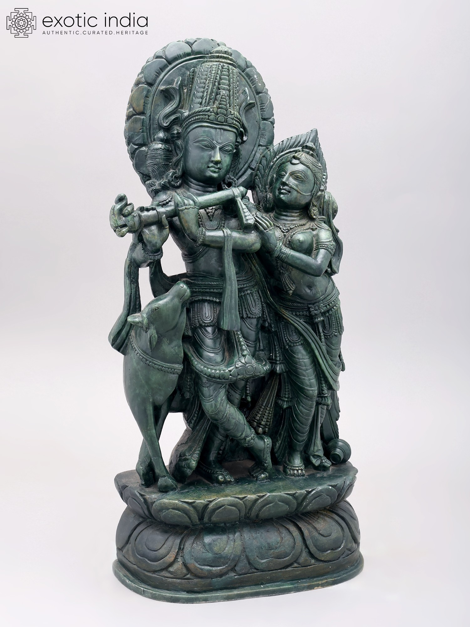Orissa Green Stone Statue: 22" Radha Krishna with Cow