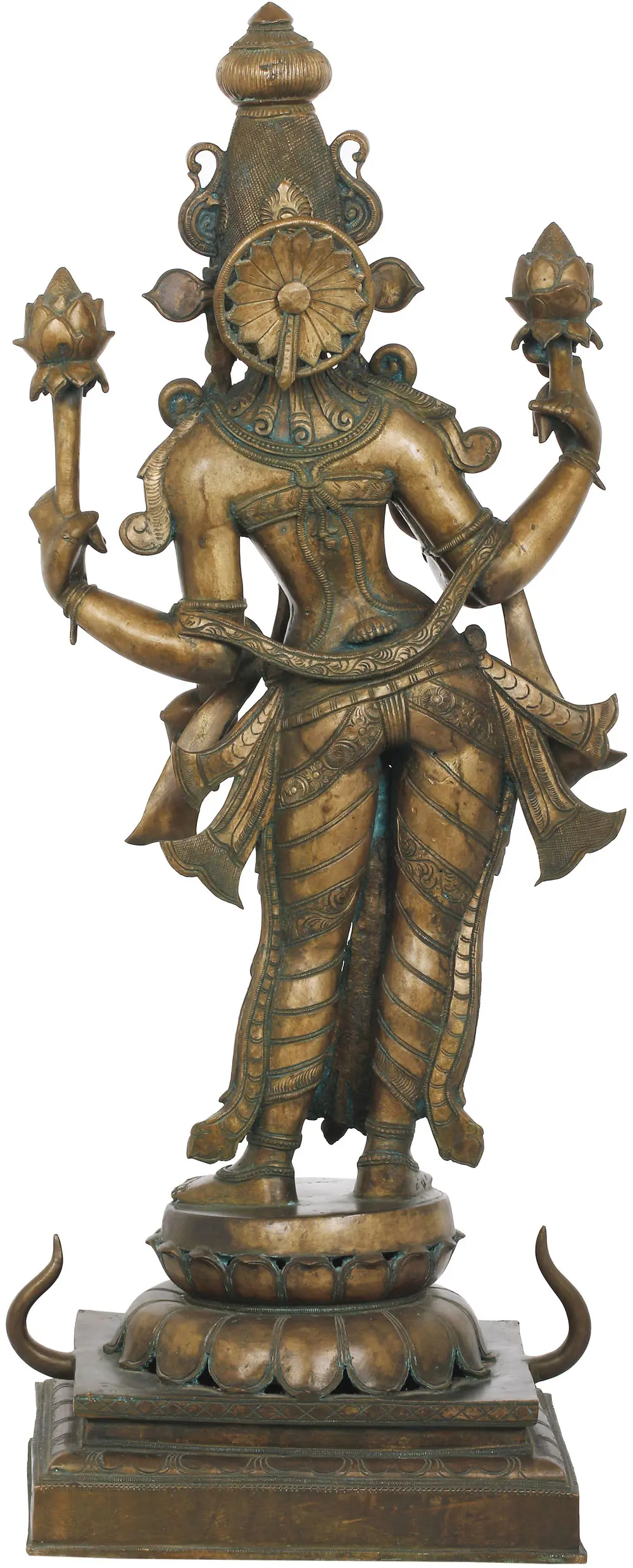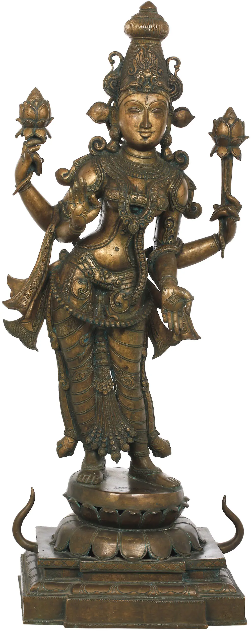 These bronzes are not just about skill. The devotion with which each artisan works on the murti at hand is nothing like other sculptural traditions from around the world. Such streamlined skill, such sanctity of purpose could be made out from each aspect of the standing sculpture. The lifelike lines of Her hands and feet, the yogic musculature of Her powerful form, and the supremely compassionate expression on Her face. The pleats of Her silken dhoti clings to Her legs, and a plethora of sashes float about Her hips. Dense shringar clothes Her torso and arms. The pedestal She is on is a fine example of devotional workmanship of the region - an inverted lotus atop multiple tiers engraved with more lotus petals. Note how unusual Her engraved crown is, resembling the amalaka and shikhara of the quintessential Dravidian temple.