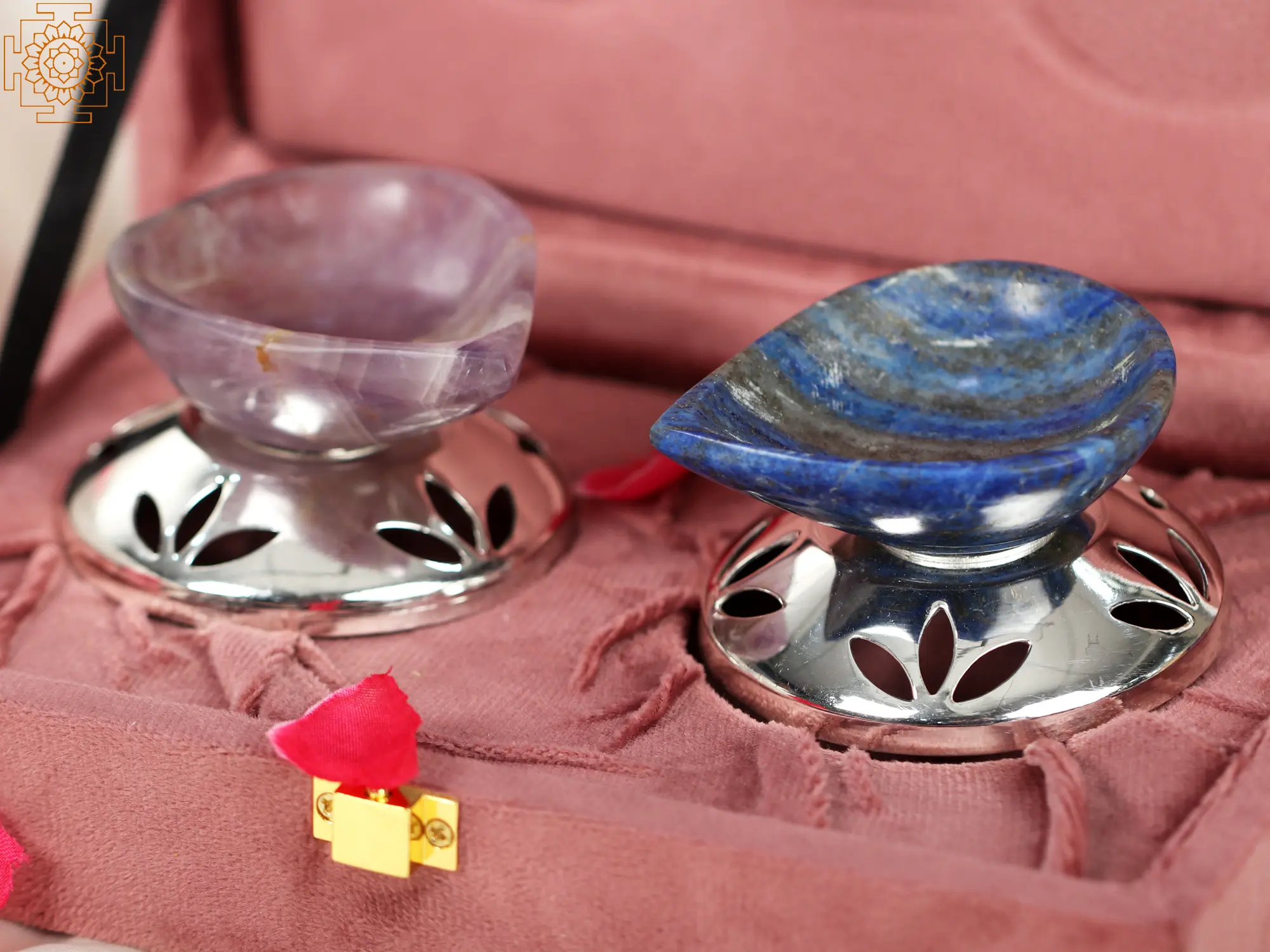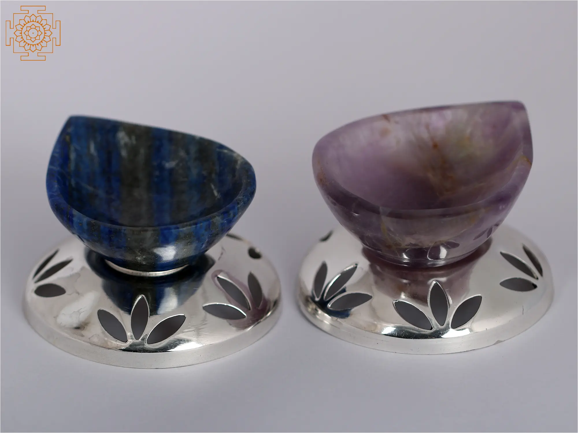 This enchanting pair of Gemstone Colorful Diya with a Silver-Plated Stand is a celebration of light, color, and optimistic energies. These vibrant diyas, made with gemstones, represent the beauty of diversity and unity. As you kindle the flames, the colorful glow will represent the multitude of hues that enrich life. Just as the diyas collectively create a mesmerizing display, so do the diverse individuals also collectively create a harmonious world. This artwork is a remarkable representation of the differences and unity that come with love and a way of spreading the radiant light of compassion and understanding far and wide.