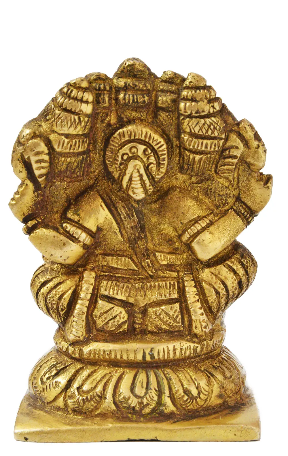 Zoom in on the iconographic detail incorporated into the sculpture. The serrated trunk and the Shaivite tilak. A gracious brow, distinctive eyes. Gold crowns on all five heads, each of them with multiple tiers engraved on them. Finally, above the deep navel, the snake that holds the chubby child-deity’s belly in place, without which it would burst, has been engraved against the skin.
